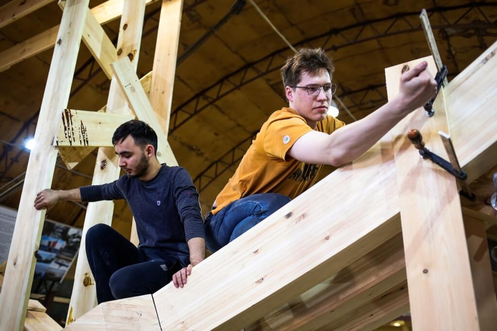 Сергей Егоров, Егор Староверов и Нурик занимаются вычинкой досок.