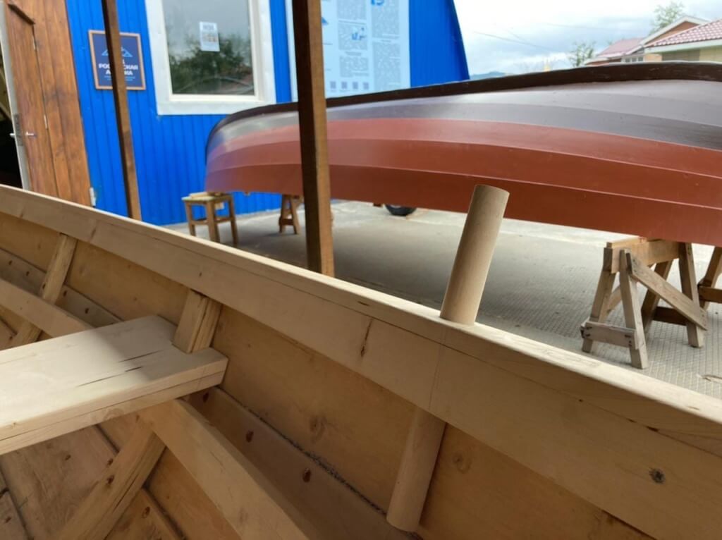Игорь делает привальный брус на первом карбасе. Один борт готов, остался второй, потом будем делать слани.