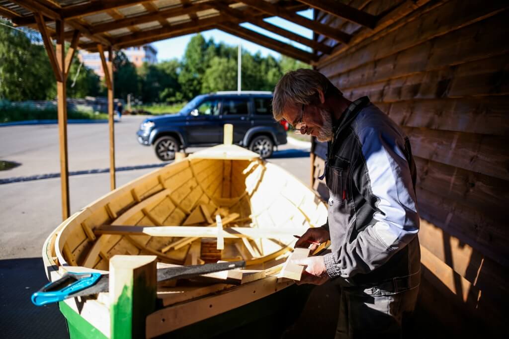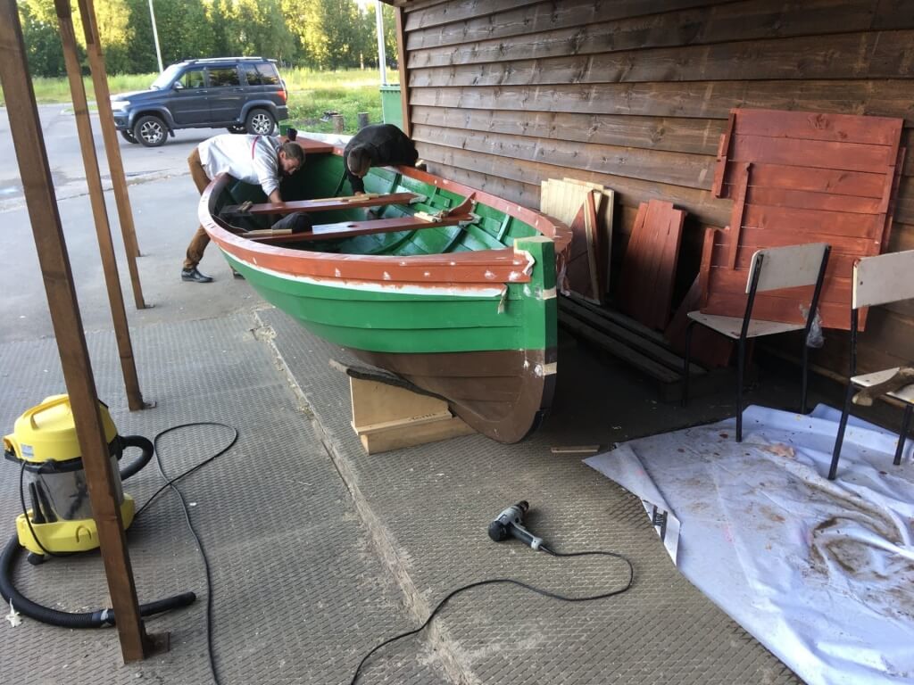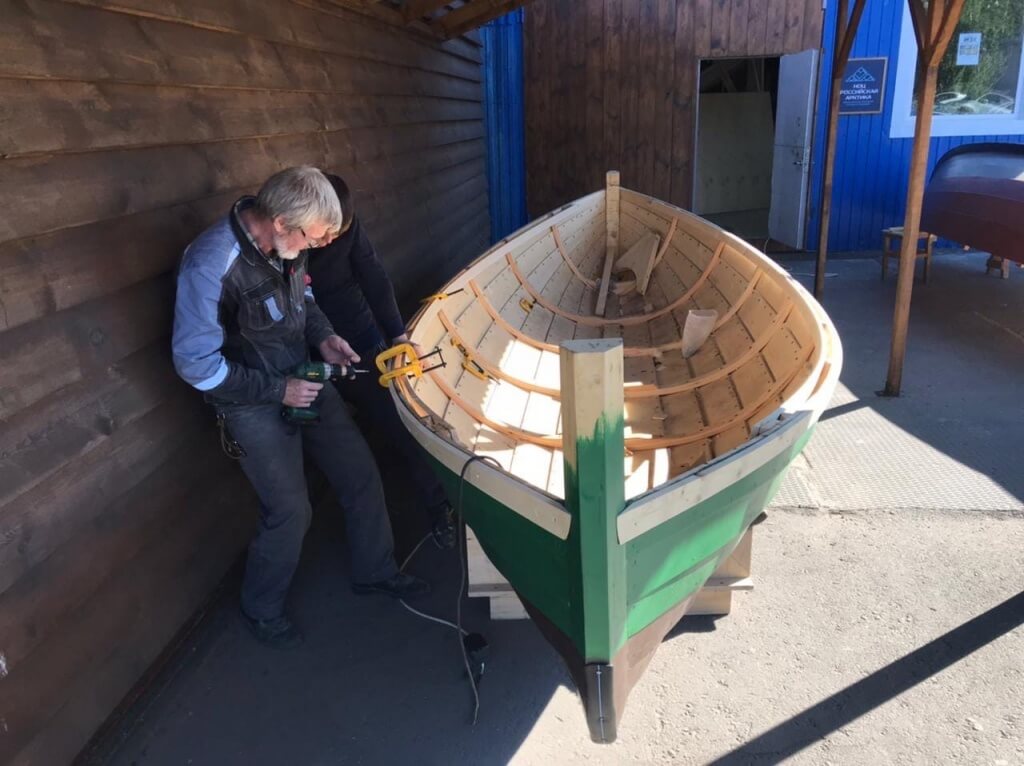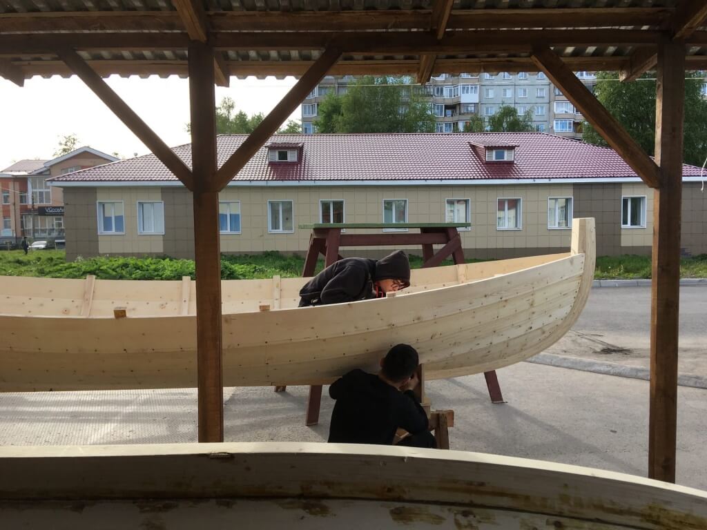 2 июня. Артем работает с третьим карбасом для регаты, которая будет уже через полтора месяца. Игорь точит флагштоки для мачт. Максим с Нестором шпатлюют днища первых двух карбасов.