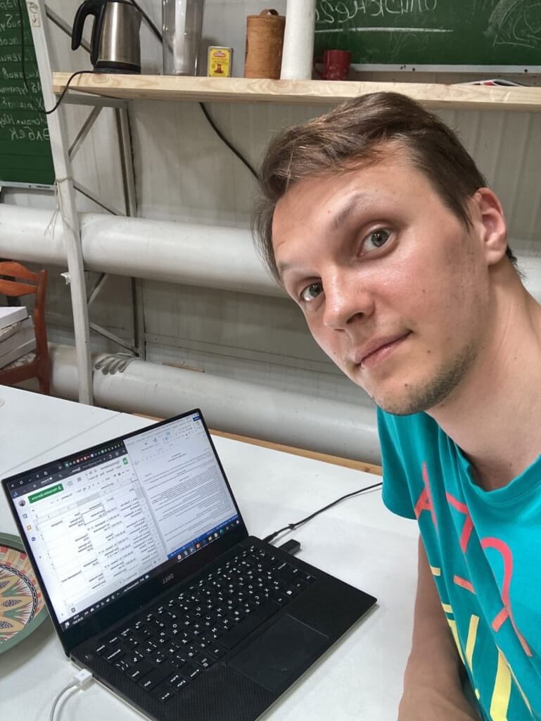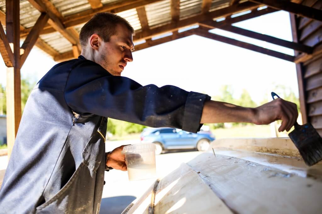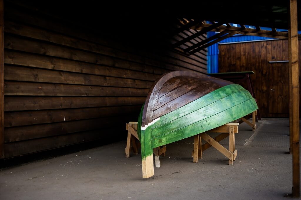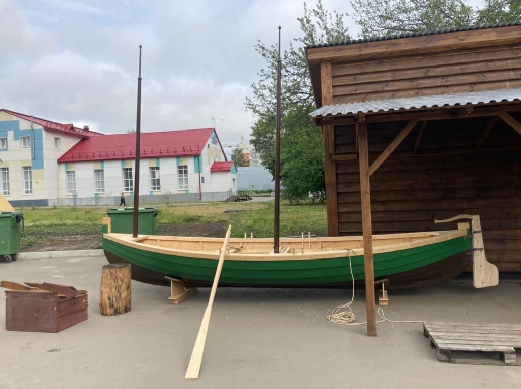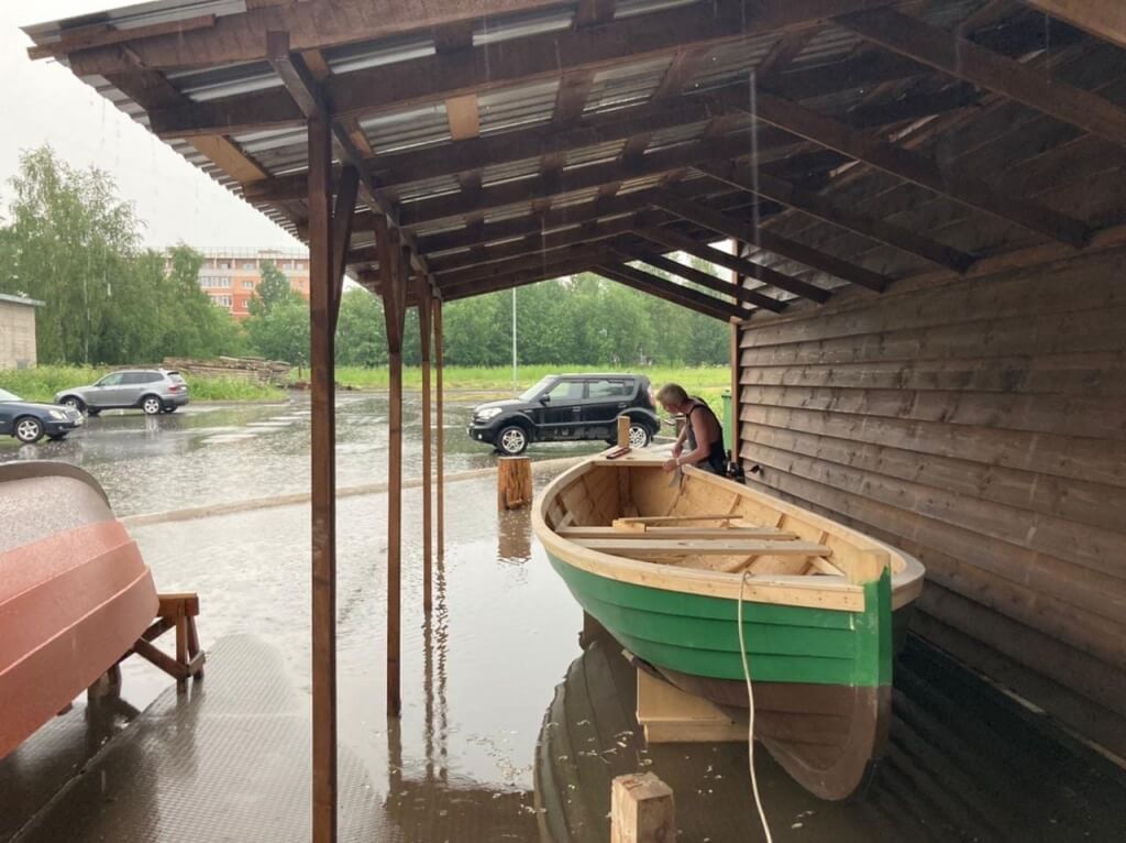 2 июня. Артем работает с третьим карбасом для регаты, которая будет уже через полтора месяца. Игорь точит флагштоки для мачт. Максим с Нестором шпатлюют днища первых двух карбасов.