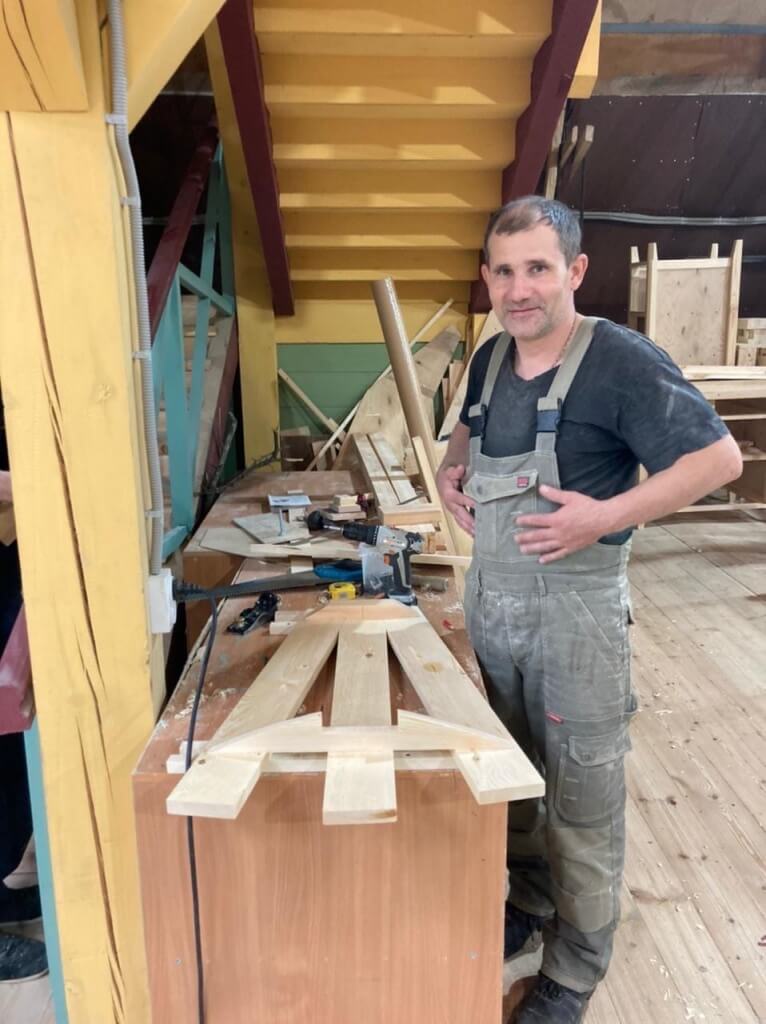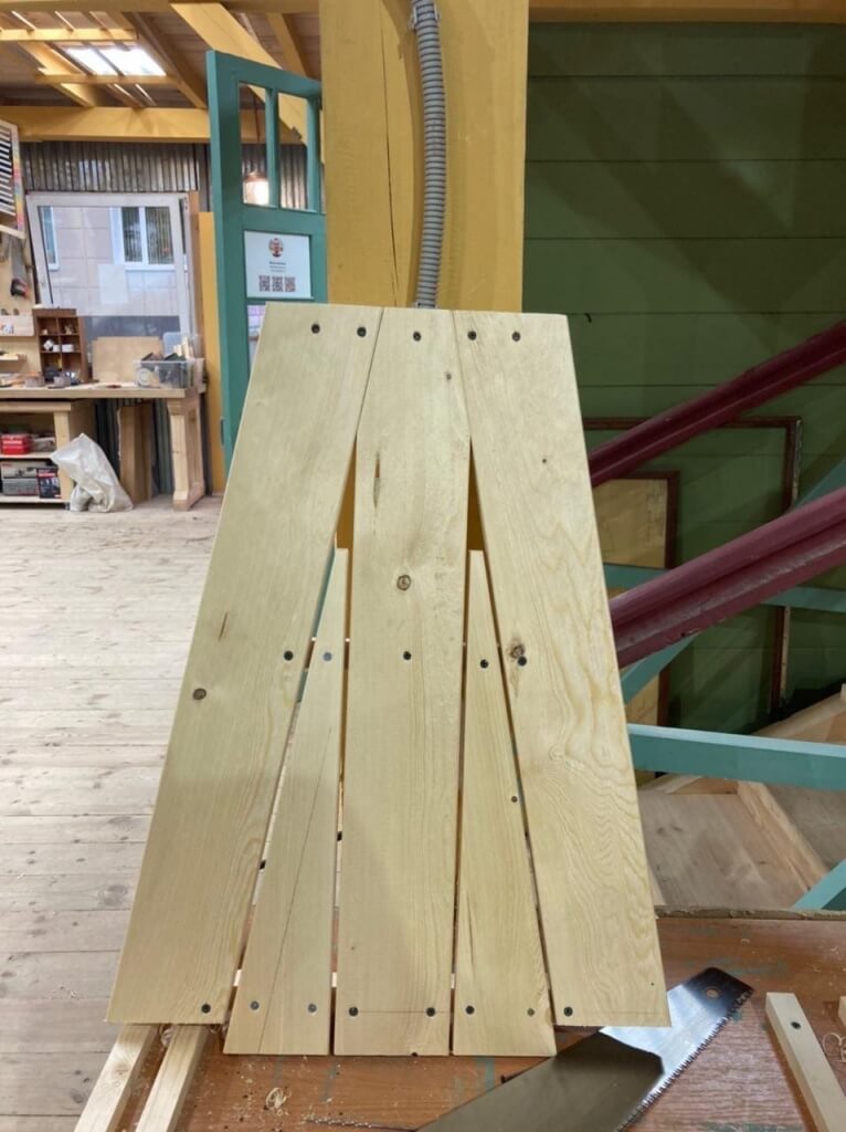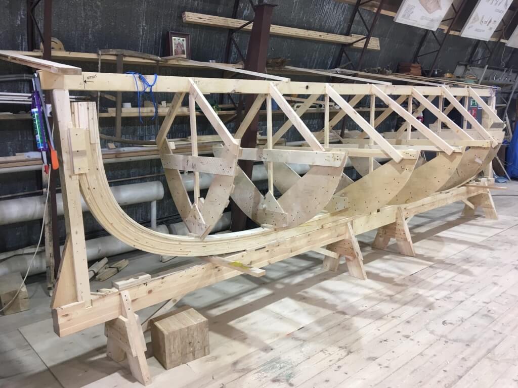18 июня. Артем ставит предпоследний шпангоут на третий карбас. Игорь делает банки, планшири и брештуки для двух первых карбасов. Настя с Алиной и Нуриком строгают рейки для банок на карбасы. А с Нестором — клеят из них заготовки.