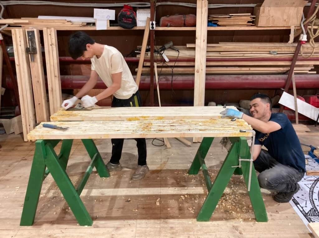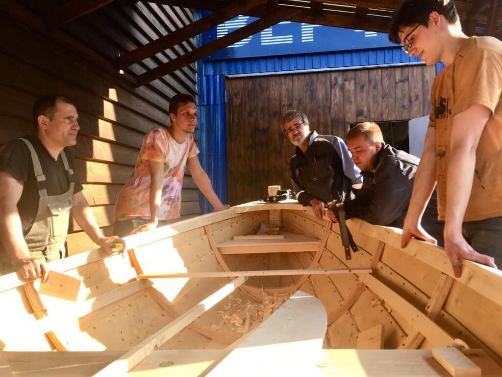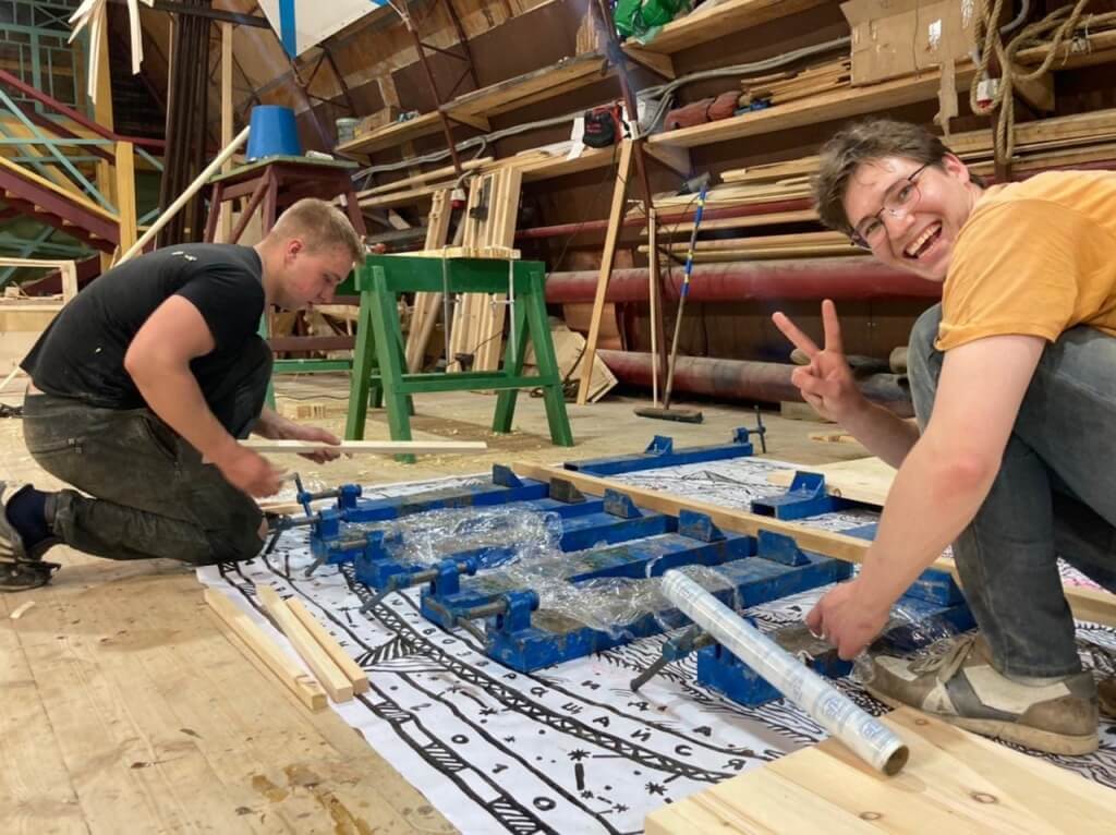 3 июня. Артём шьёт карбас, Игорь точит флагштоки. Богдан с Максимом шкурят и шпатлюют карбасы, Вова строгает шпангоут.