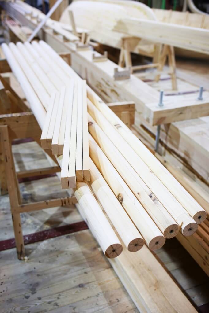 17 июля. Игорь сделал подлегарсы — рейки, на которые встают банки карбаса. Заклеил заготовки для самих банок и готовит сиденье капитана.