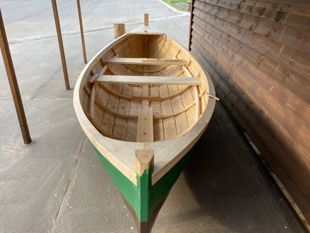 4 июня. Мы начали красить регатные карбасы — первый слой первой лодки. Интрига с цветами карбасов начинает постепенно раскрываться. Первый цвет — зеленый. Шпатлюем и шкурим второй карбас.
