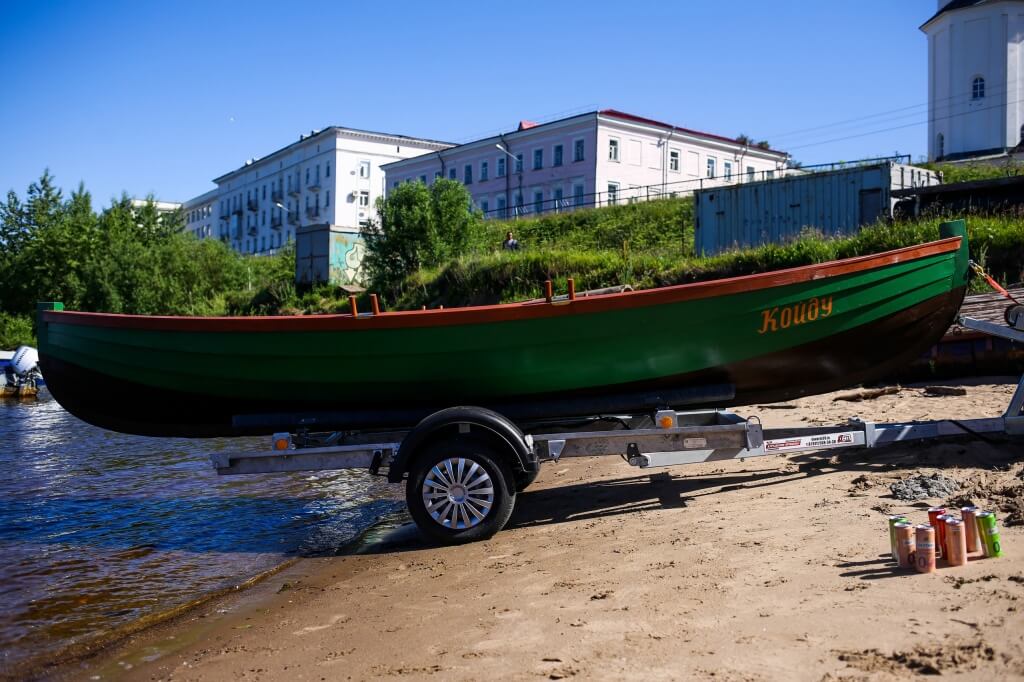 3 июля. Сегодня спустили на воду первую регатную лодку – карбас «Койду». Посмотрели каков карбас на ходу, сели за вёсла, попробовали грести, посмотрели его управляемость рулем. Первые выводы: грести на традиционном судне нужно учиться, потому что крепление вёсел на нем не современное. Кроме того, нужно учиться грести в команде. Теперь нам предстоит исследовательская работа вёсельного хода наших карбасов. Завтра начинаем тренировки. Разбивать бутылку шампанского о борт, выстроганный, зашлифованный и выкрашенный с таким усердием, поостереглись. Ограничились безалкогольными напитками. Тем не менее, событие радостное. Спасибо «Курганским прицепам» – спонсорам триумфального проезда «Койду» по улицам Архангельска.