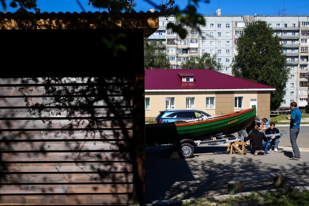 Миша превратил сушилку в практически выставочное пространство — развесил и разместил в ней кокоры и прочие симпатичные судостроительные штуки. Говорит, все дело в том, что он любит наводить порядок. В любом случае, все, кто знал сушилку до Миши, потрясены до глубины сердца. Вова с Нуриком сначала помогали Мише, после этого прибирались внутри ангара, а потом готовили доски к поклейке очередного шпангоута — ни при каких обстоятельствах мы не забываем о том, что строим шхуну. И строим ее! Наташа, Нестор и Богдан работают на спущенных карбасах: подкрашивают слани, переставляют утки, прикручивали упоры, прибивают ограничители для трубок на кочетах. А вечером все команды тренировались на вёслах, потому что не было ветра.