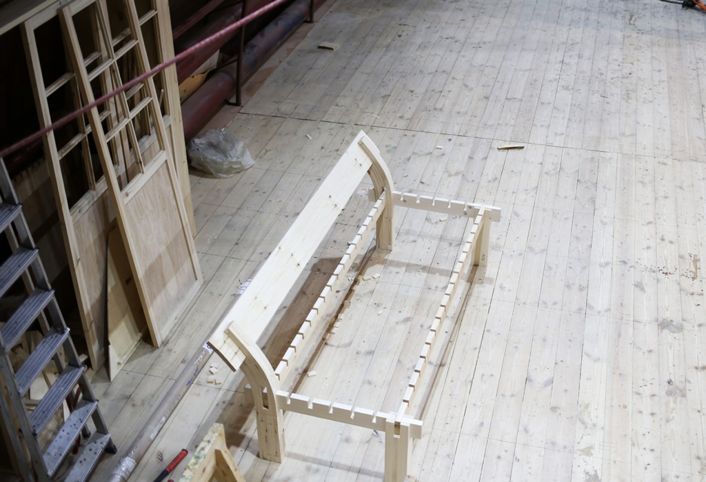 Вечером один из флор-диванов подняли наверх. На лестнице он застрял, так что пришлось передавать его на руках прямо с первого этажа на второй. Обычно так поднимают шаблоны шпангоутов, но теперь планка по весу сильно поднялась.