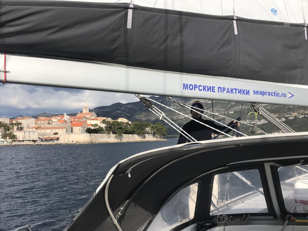 1040, вышли из Корчулы. Умереный попутный ветер и тучи на небе.