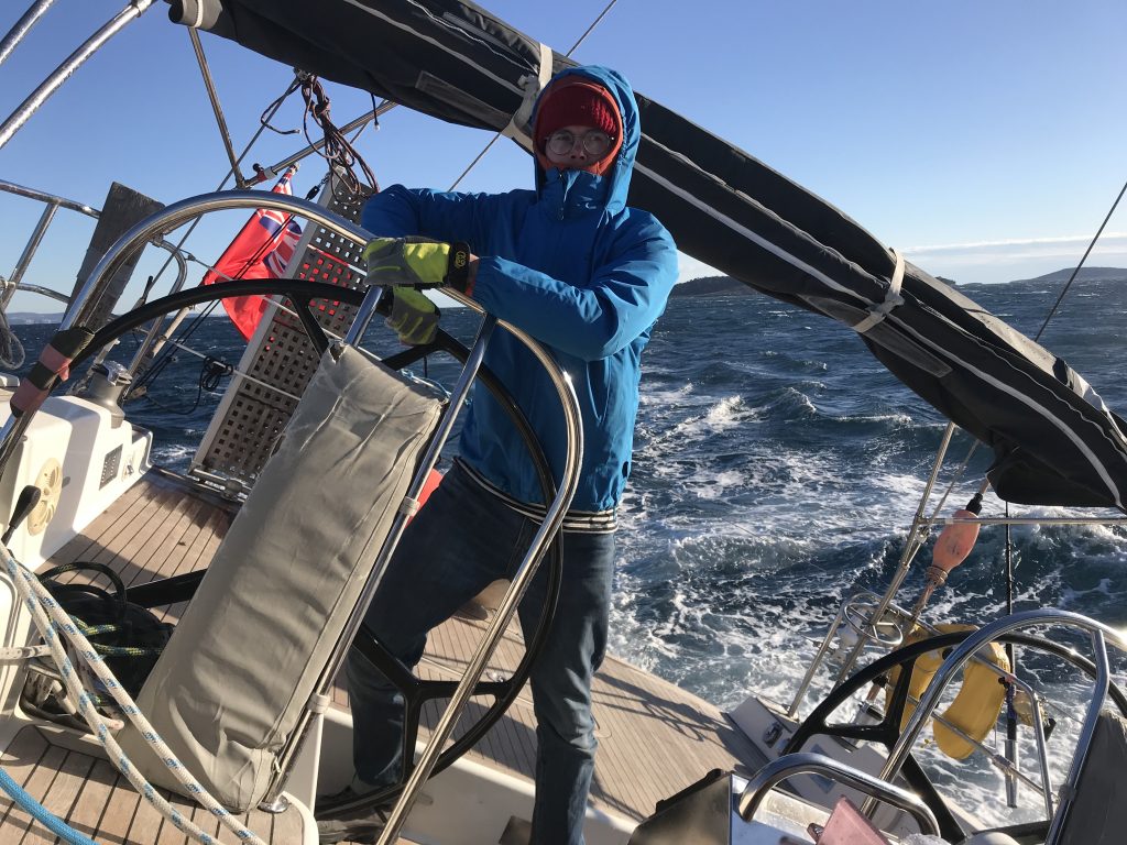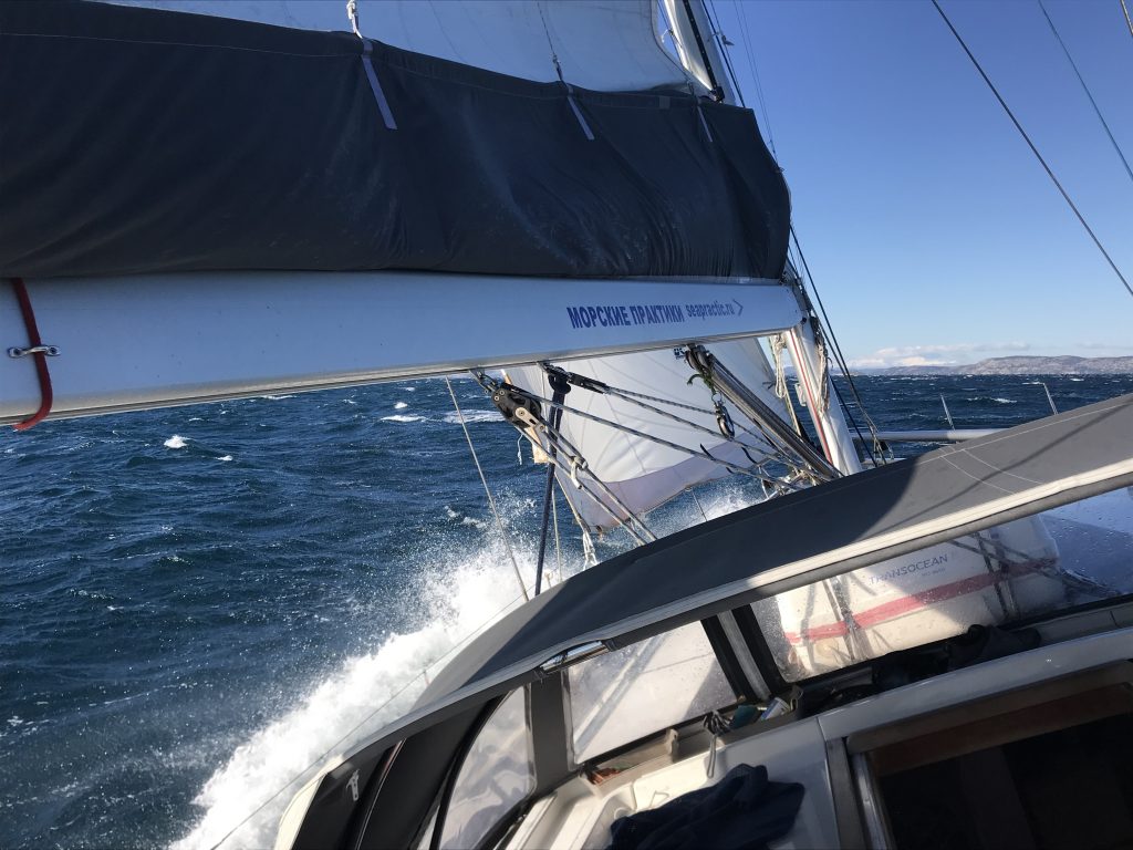 1306, терзающая бора. Пока идем под островами, ничего. Ветер заходит на багштаг.