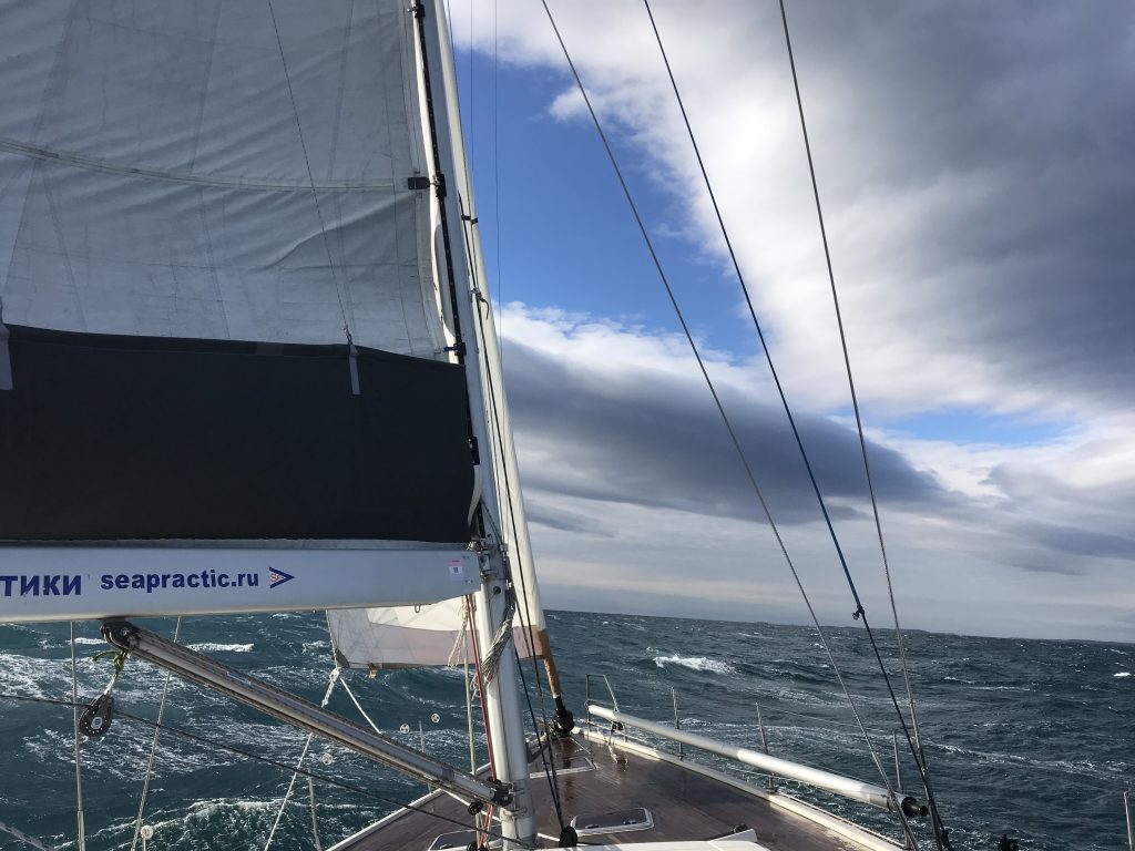 1435, кидает под ветер сильными порывами ветра. Лавируемся длинными галсами на север. Зарифились.