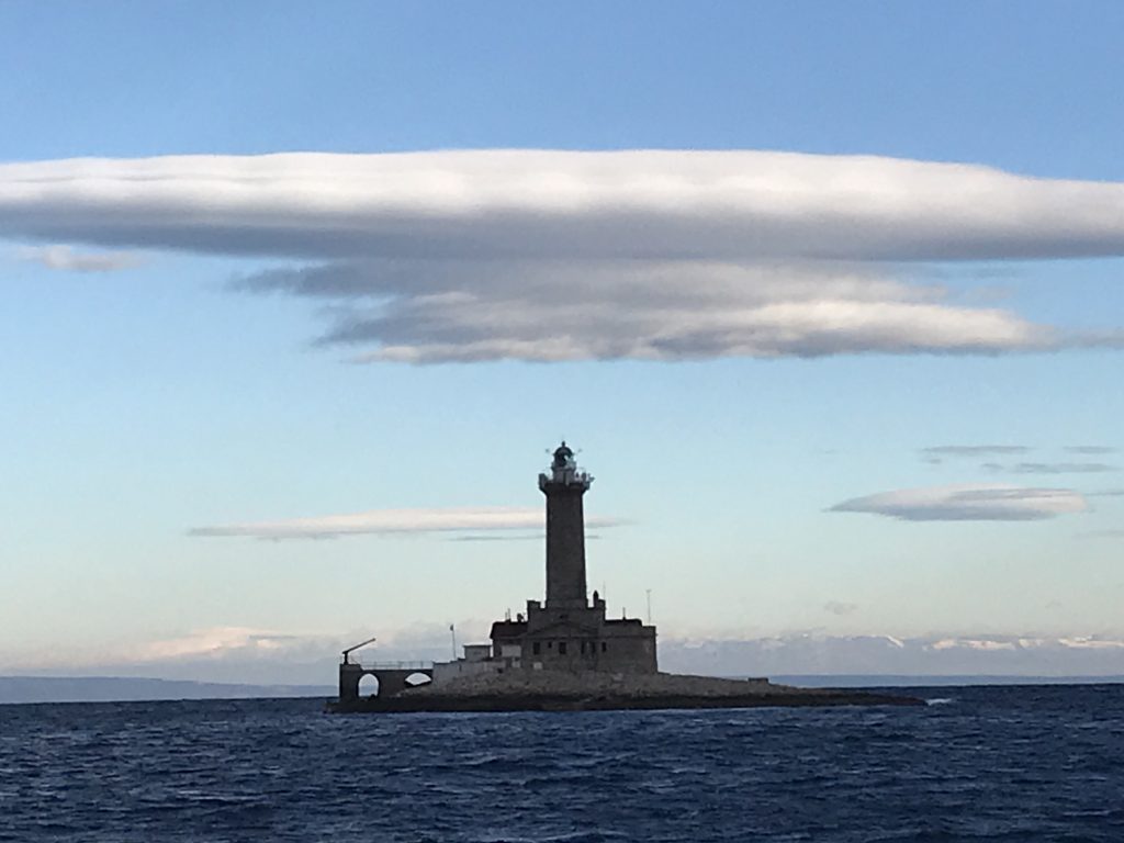 1709, выходим в Млетский канал. Увидели, что не горит левый ходовой огонь. Вешаем на релинг релинг красный налобник. А море такое же пустынное, как последние три недели.
