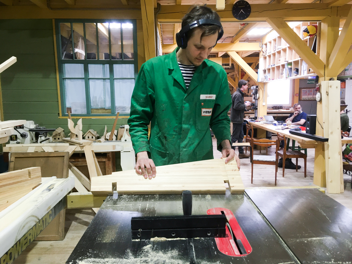 Миша раздобыл последний обрезок лиственничного бакса и делает из него полочку.