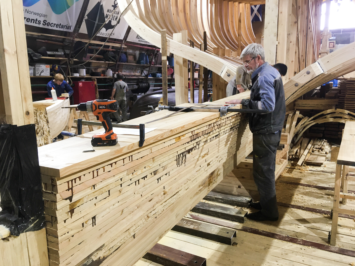 Игорь приклеил пятнадцатую пласть дейдвуда и подготовил шестнадцатую. Каждая следующая пласть – это новая мозаика. Во-первых, потому что нет такой широкой лиственничной доски (ширина дейдвуда – 600 мм, а ширина доски – 250); во-вторых, потому что так рациональнее расходуется материал, а в-третьих, так надежнее.