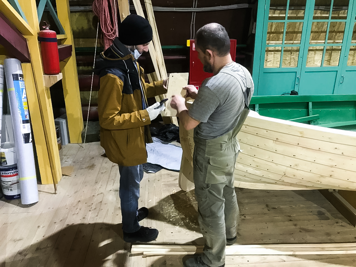 Артем достиг шестого набоя нового карбаса, Ибрагим выпиливает рули, Даня делает шаблон румпеля. Множество ребят подшивают потолок.