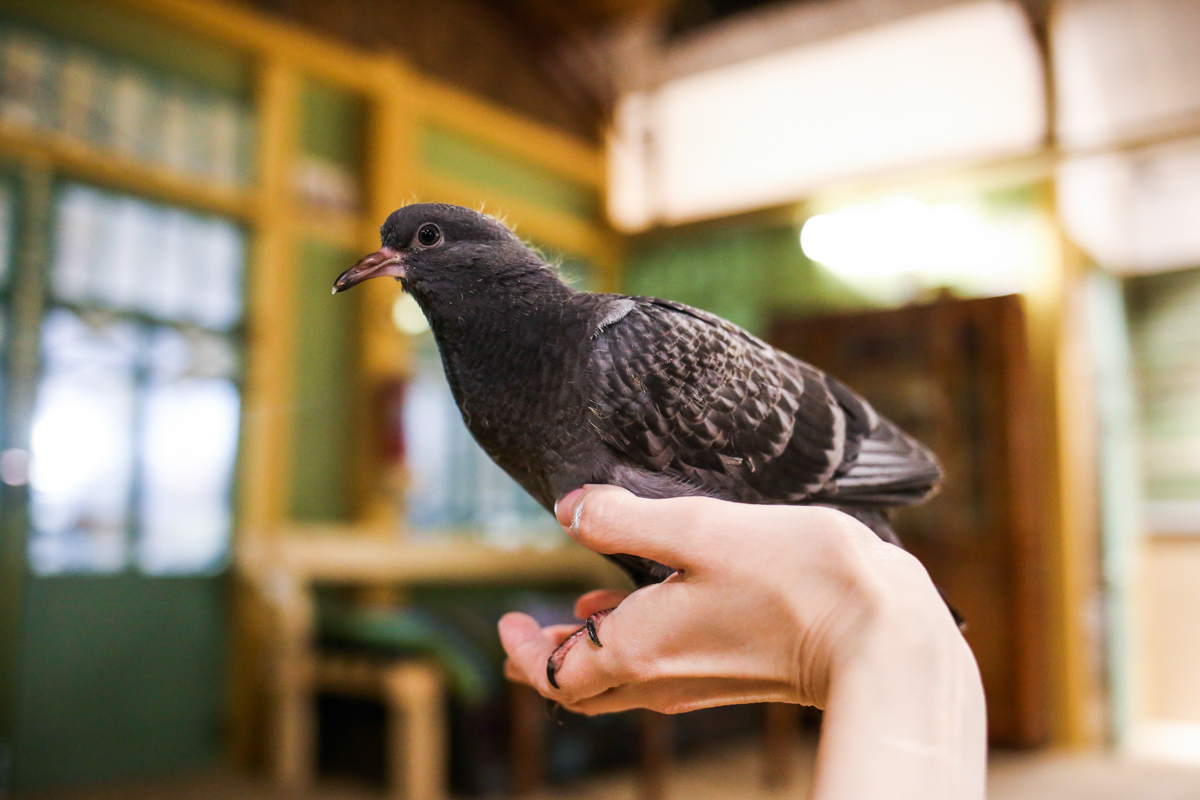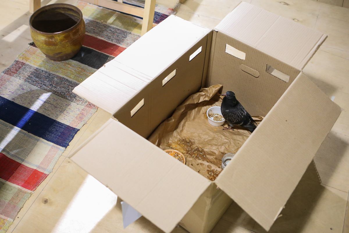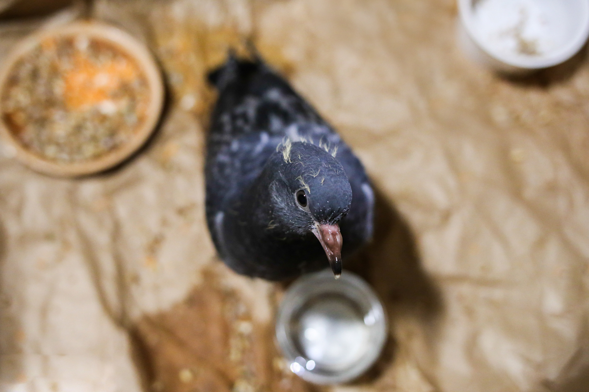 Катя принесла подросшего птенца голубя, упавшего к ней в ванную через вентиляцию на прошлой неделе. За десять дней Катя научила его самостоятельно клевать зерно и пить воду из миски. Теперь довольно самостоятельный голубь до наступления сытного времени и выпуска на волю будет жить на верфи. Летать он еще не умеет, но это ничего. Каждый голубь когда-то не умел.