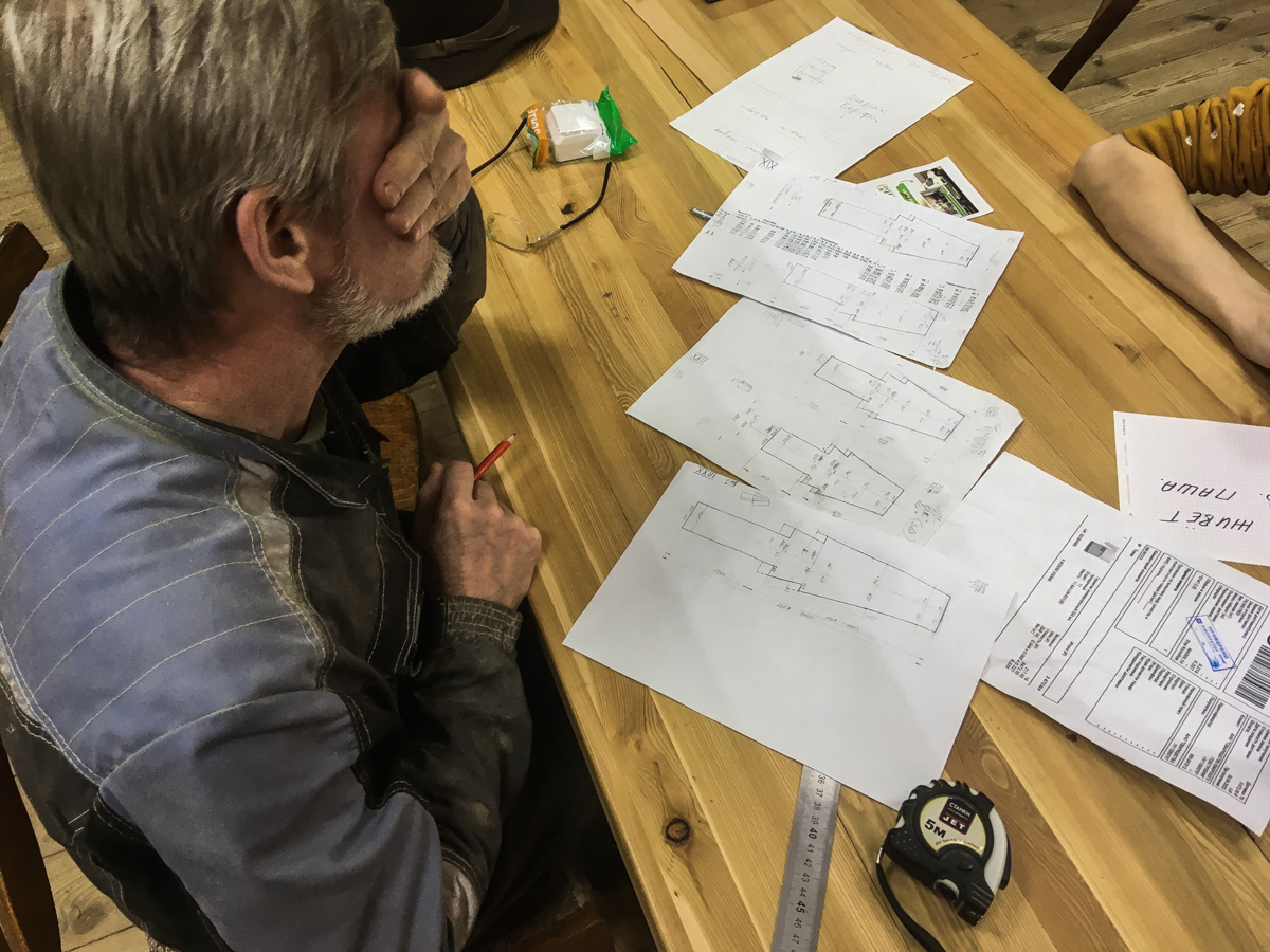 Саша колотит нагеля. Игорь чертит новые пласти для дейдвуда шхуны.