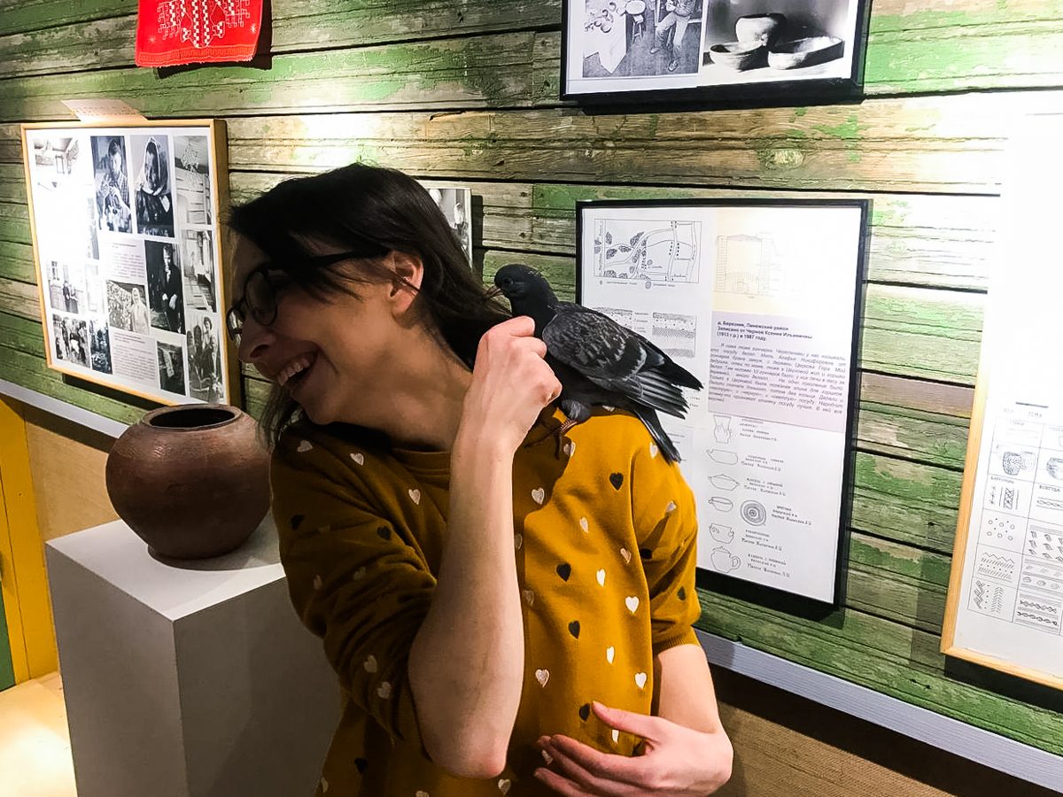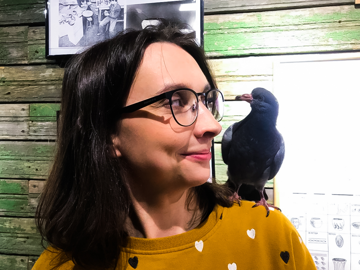 Катин голубь начинает летать: выпархивает из коробки и садится ей на плечо, как попугай Флинт.