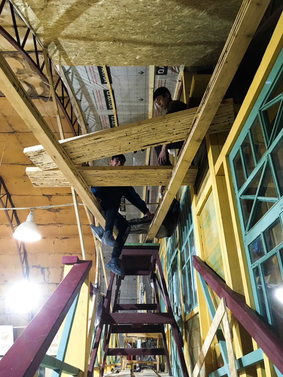 Игорь клеит пласть, теперь уже с Нуриком, потому что Баха с товарищами зашивает потолок ориентировано-стружечной плитой. Тема тоже отвлекся на потолок от любимых карбасов.