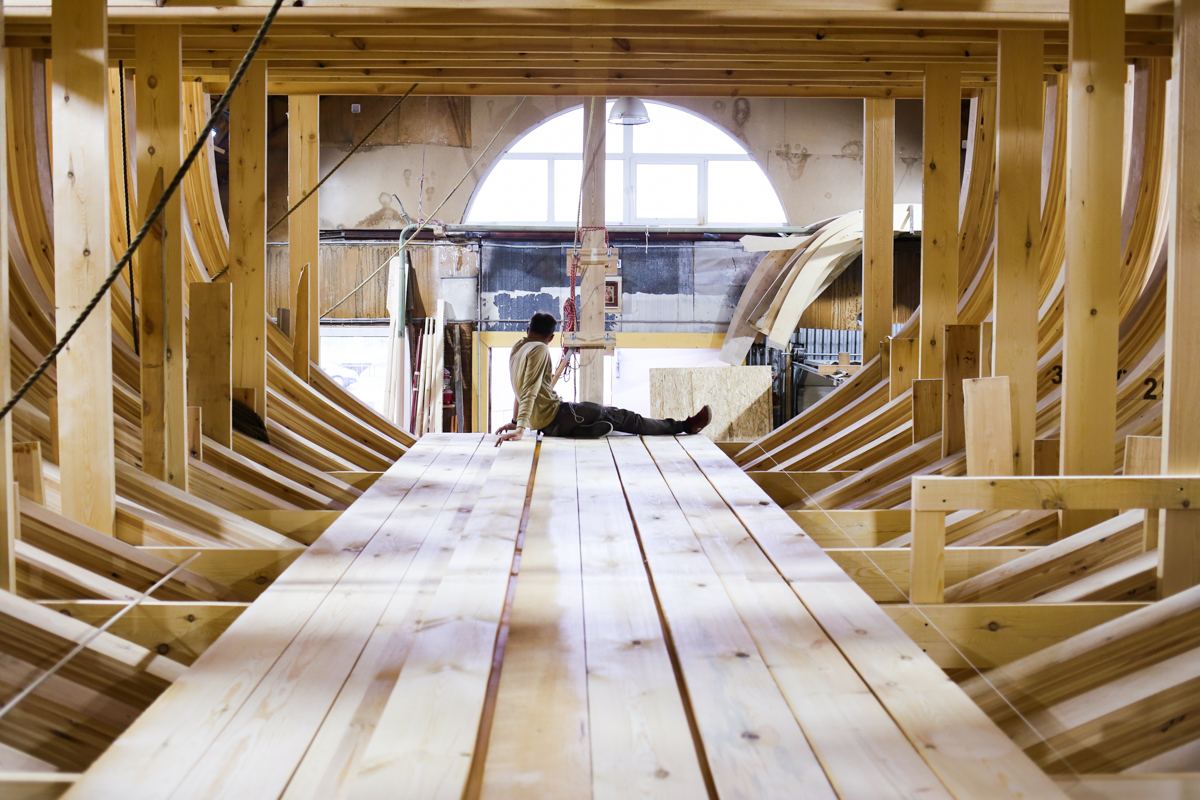 Саша Антонов продумывает конструкцию пола в шхуне. Временный пол на шхуне мы делаем в рамках гранта «Топорное дело». Согласно проекту, мы превратим внутреннее пространство шхуны в площадку для выставок и мастер-классов.