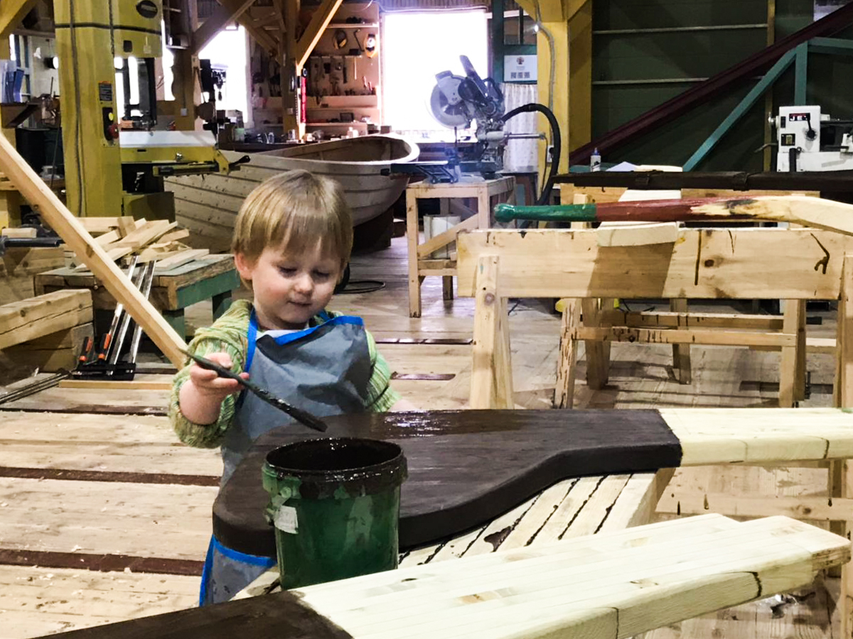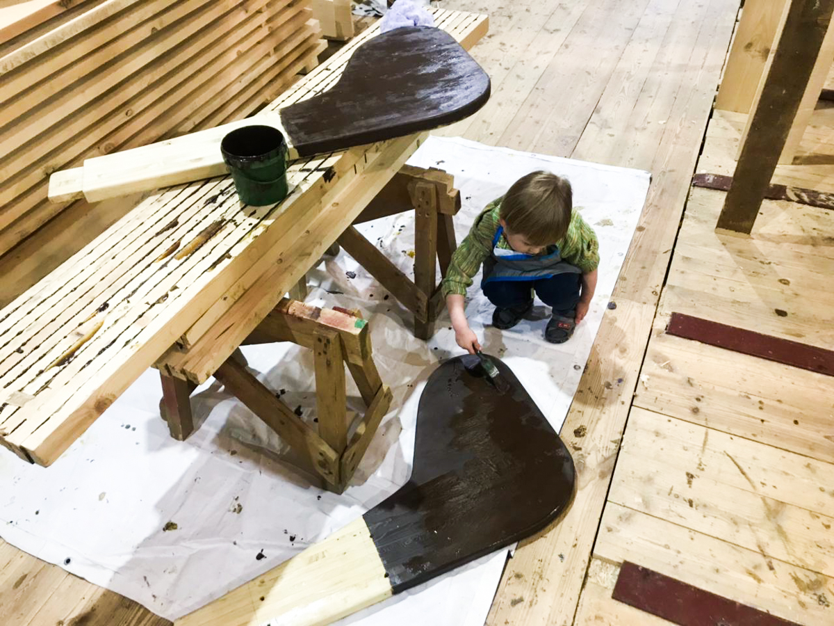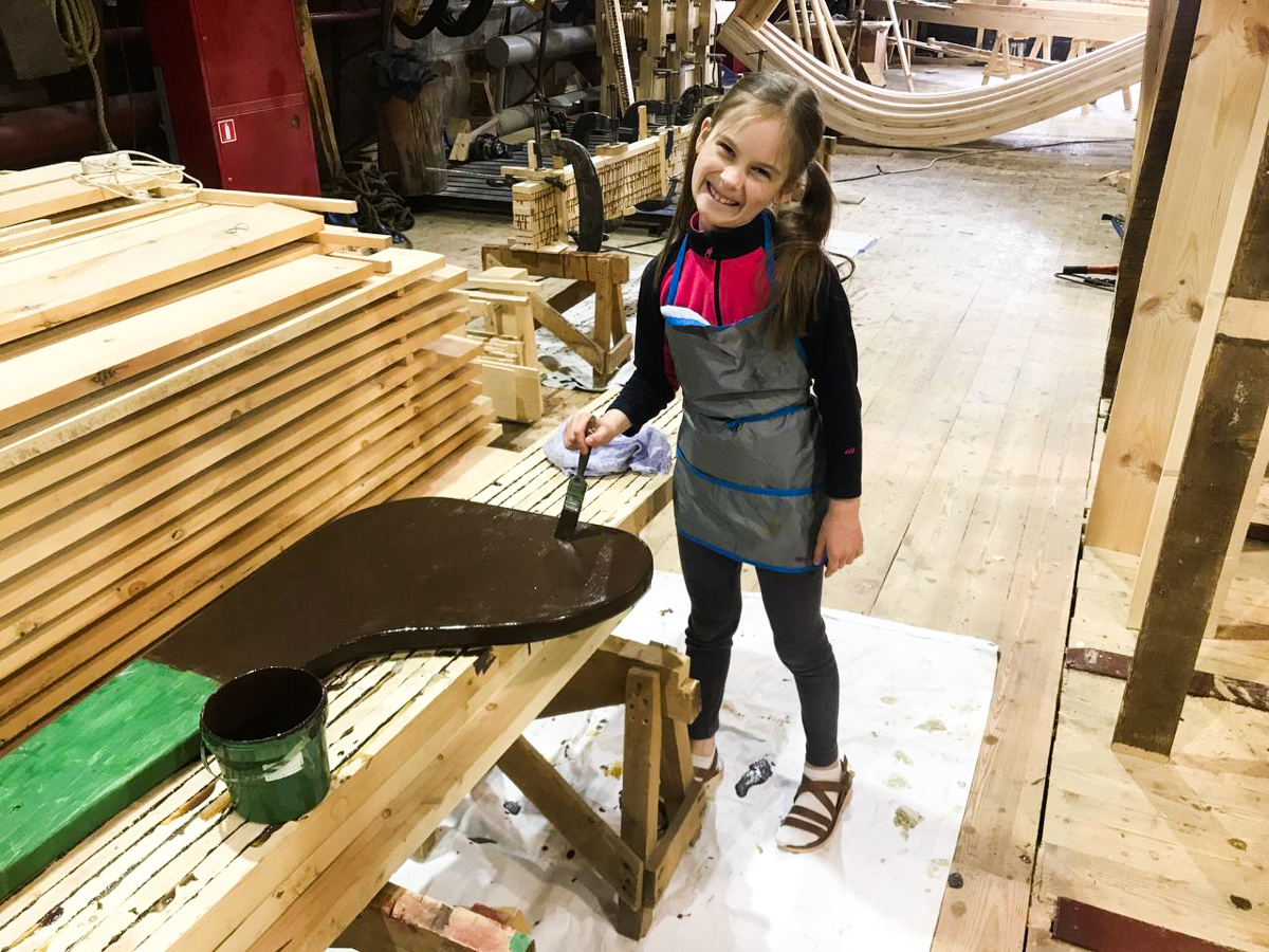 Варя и Ваня Шкаруба красят рули для карбасов. Еще Варя привела на верфь подружек и провела для них экскурсию.