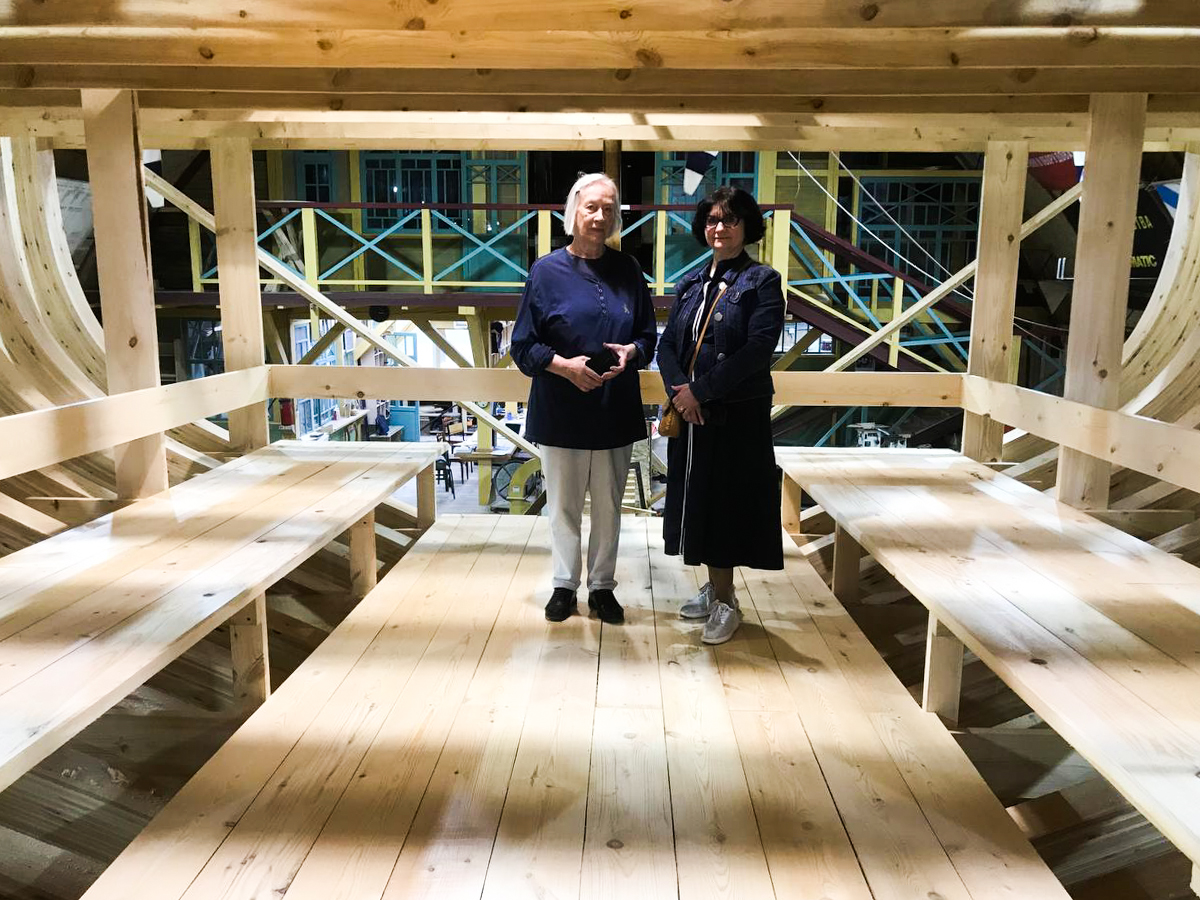 Нина Анатольевна Филёва с Натальей Горн обсуждают мастер-класс по росписи карбаса уфтюжской росписью. Пространство под мастер-класс и выставки внутри шхуны готово.