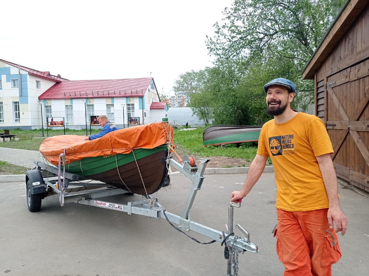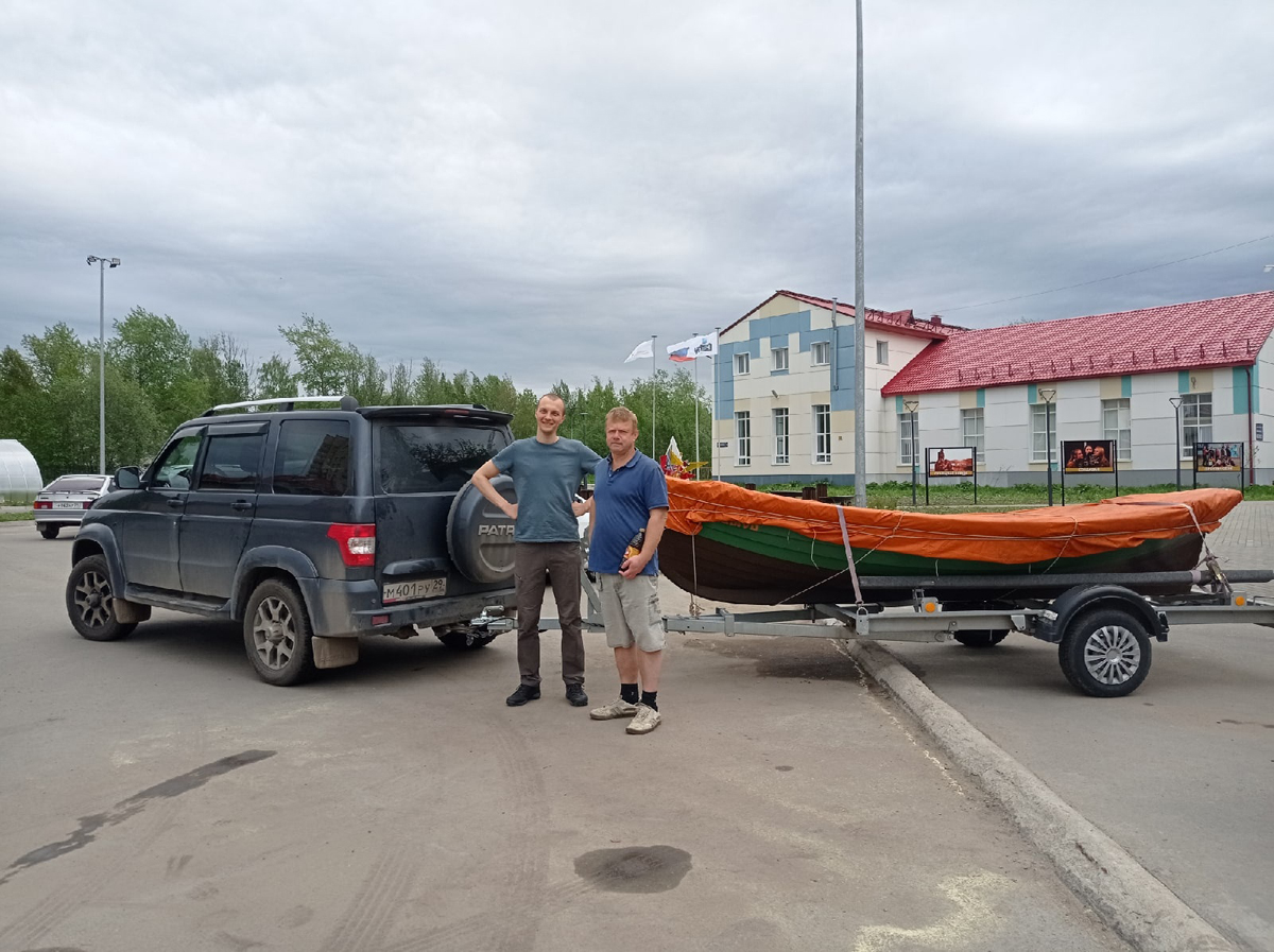 Миша меняет фильтры, что-то печатает и доделывает всякие дела перед длинной поездкой в Кенозерье. Карбас «Надысь», который поедет с ним, погрузили на прицеп.