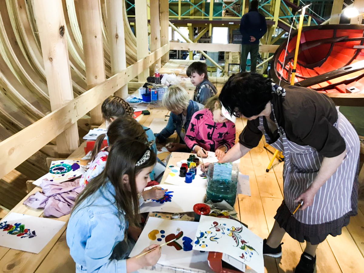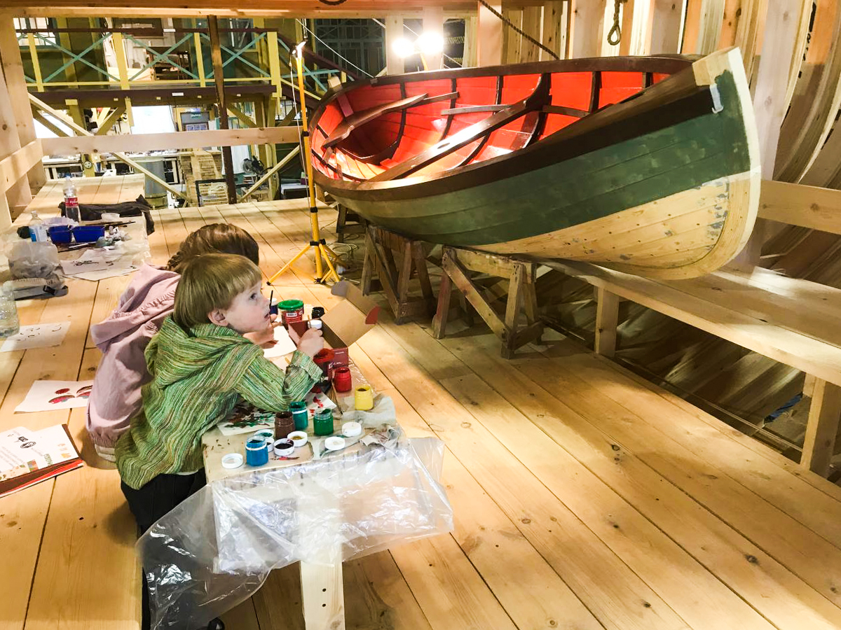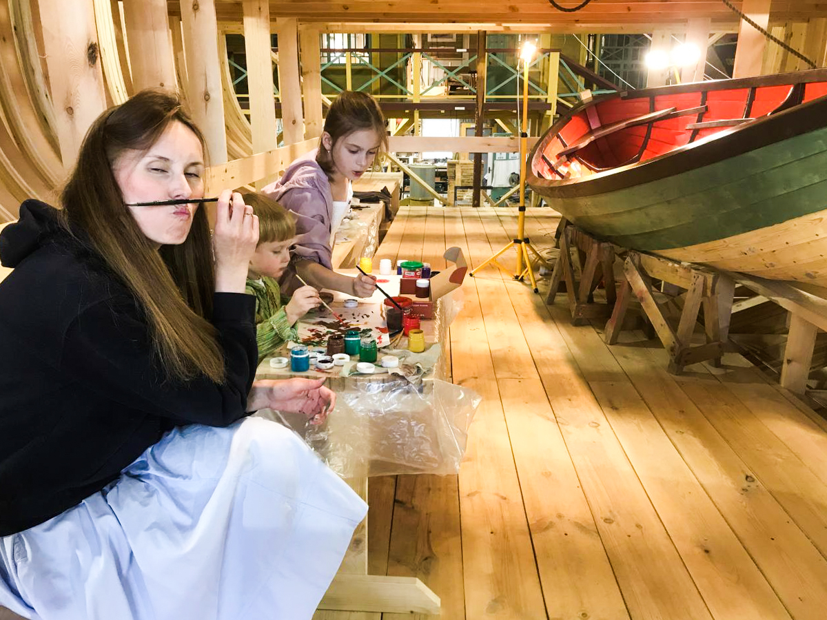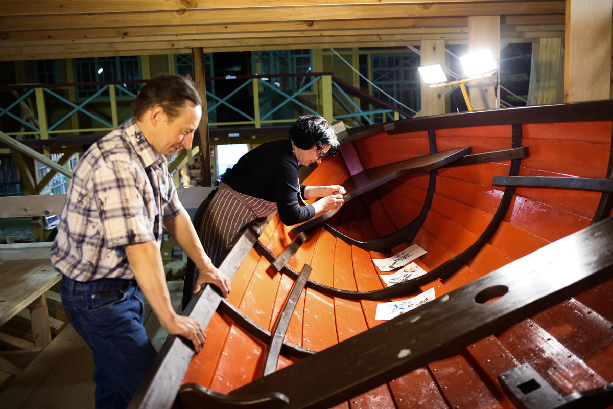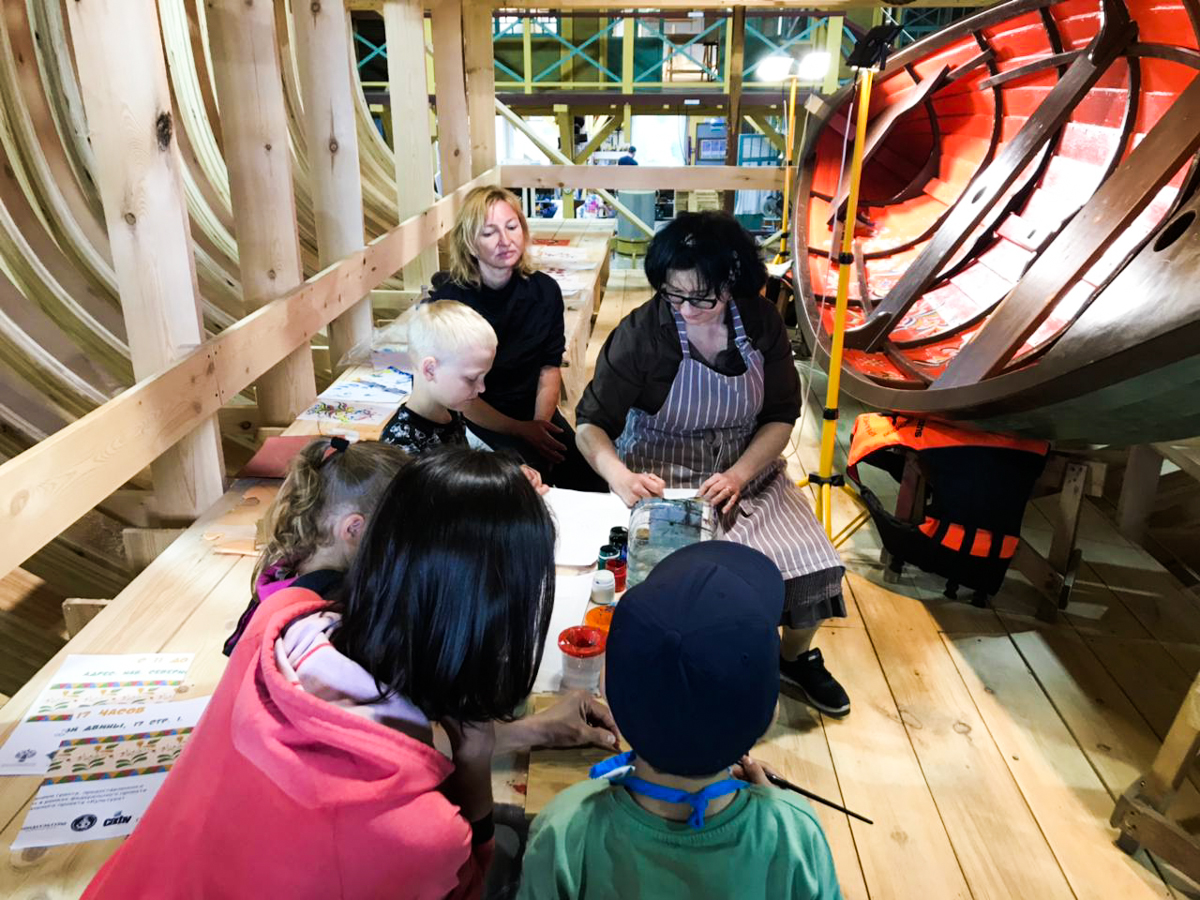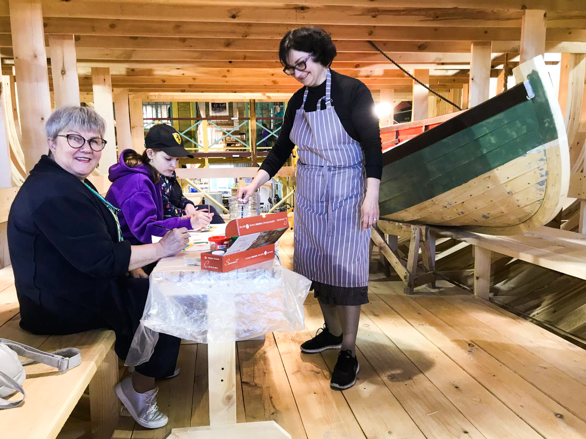 Стартовал мастер-класс «С туеска на лодку» в рамках проекта «Топорное дело». Художница Наталья Горн начала расписывать наш флагманский карбас, пришли первые гости и корреспондент Полина Забродина из газеты «Архангельск».