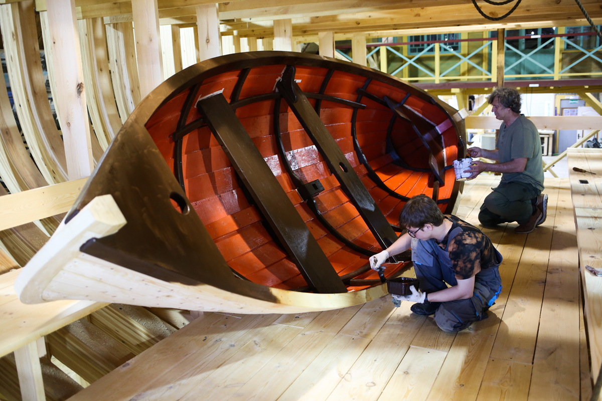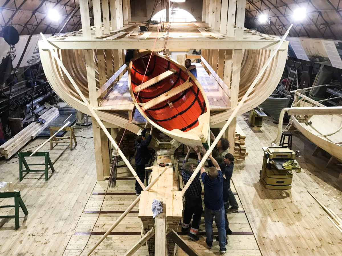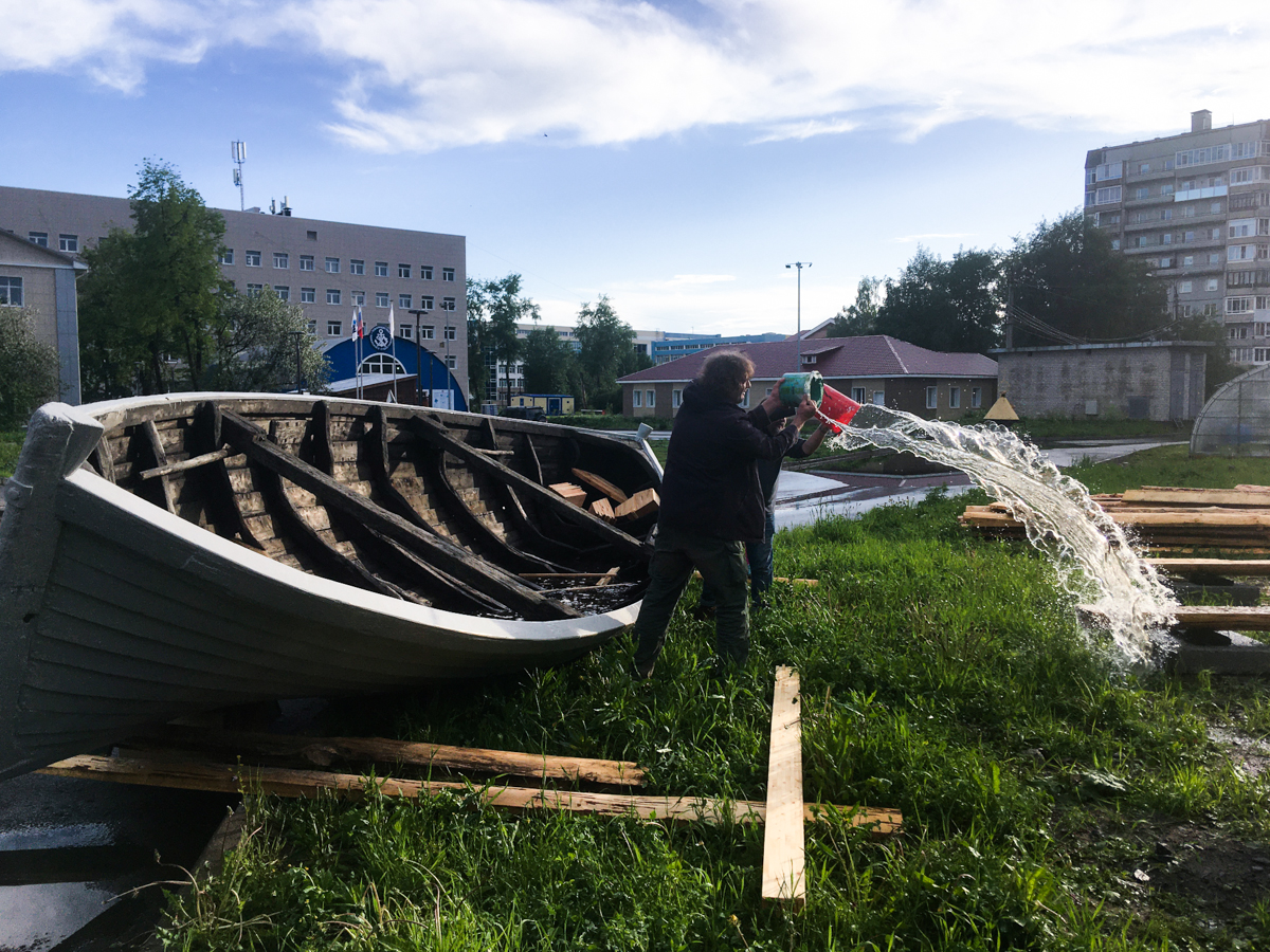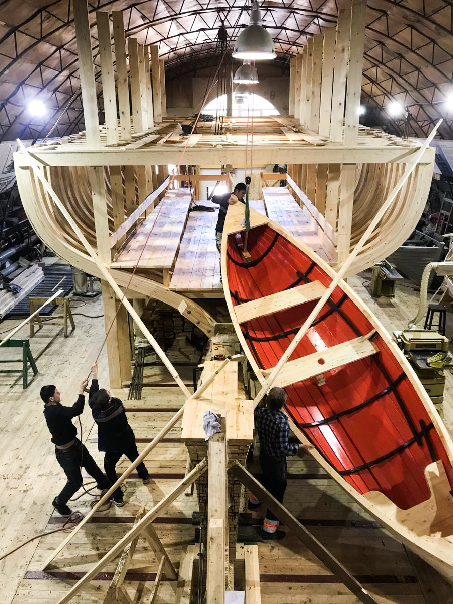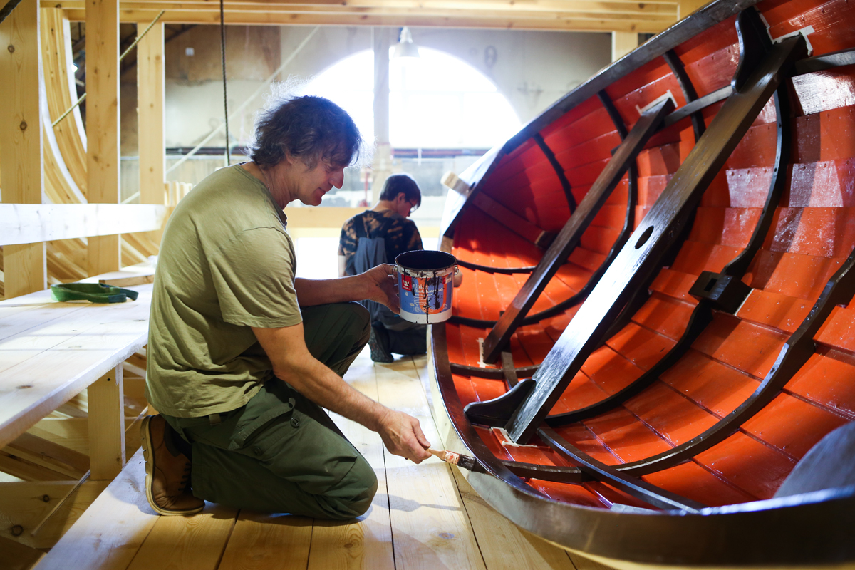 Подняли красный карбас на шхуну и докрашиваем его к мастер-классу в рамках гранта «Топорное дело».