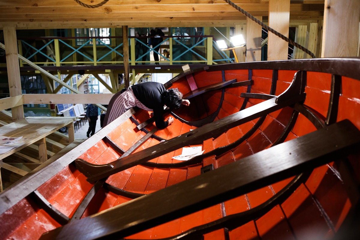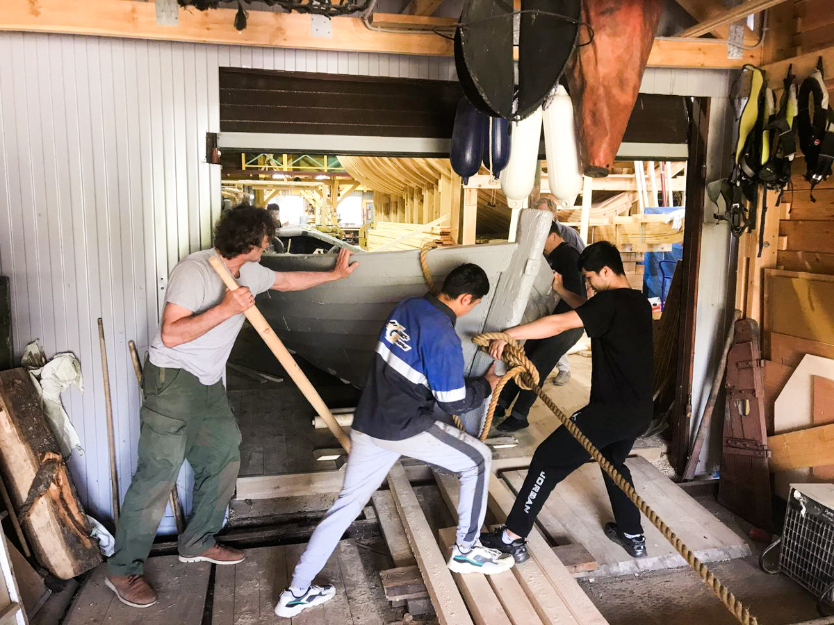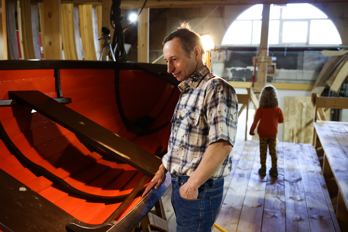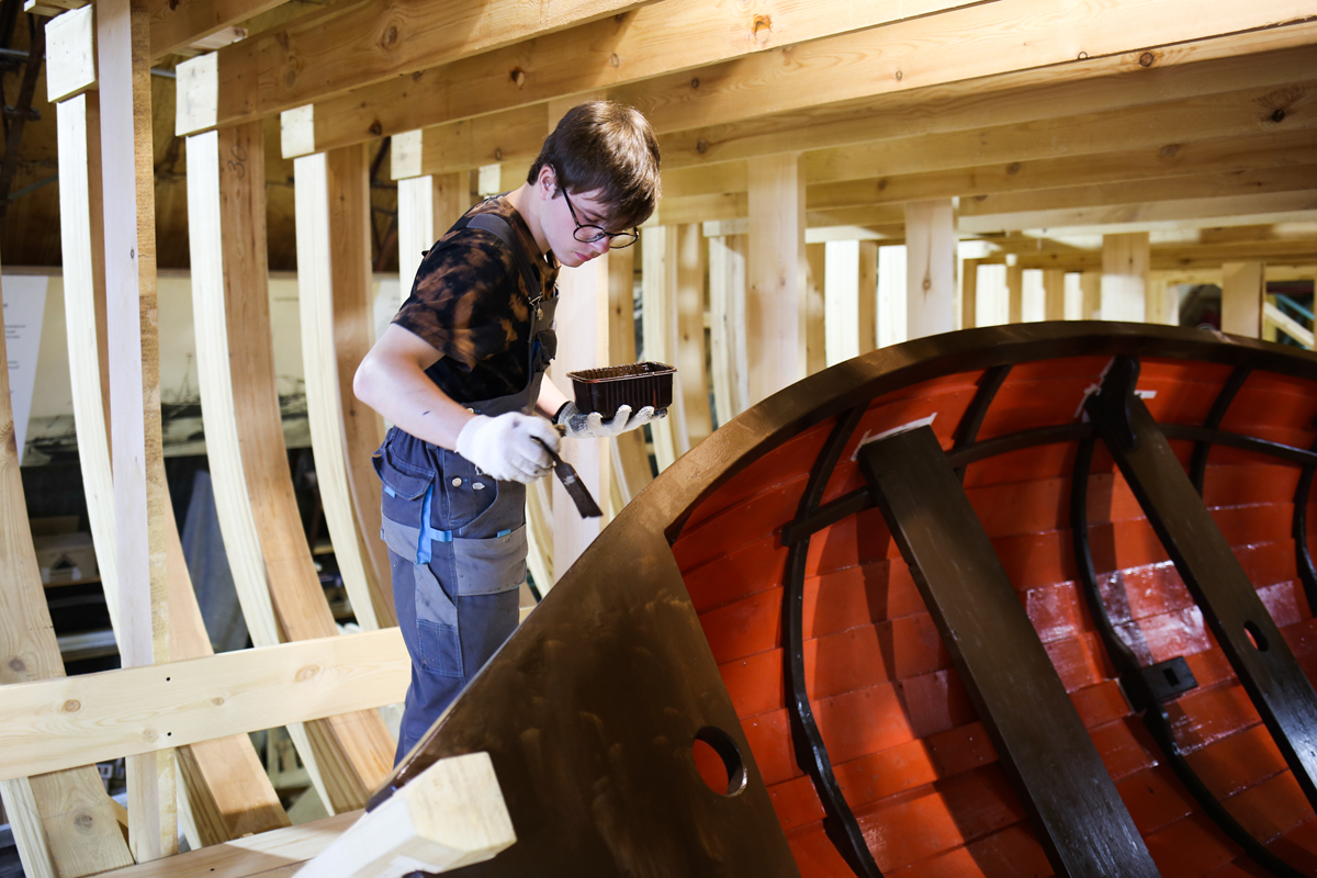 Подняли красный карбас на шхуну и докрашиваем его к мастер-классу в рамках гранта «Топорное дело».