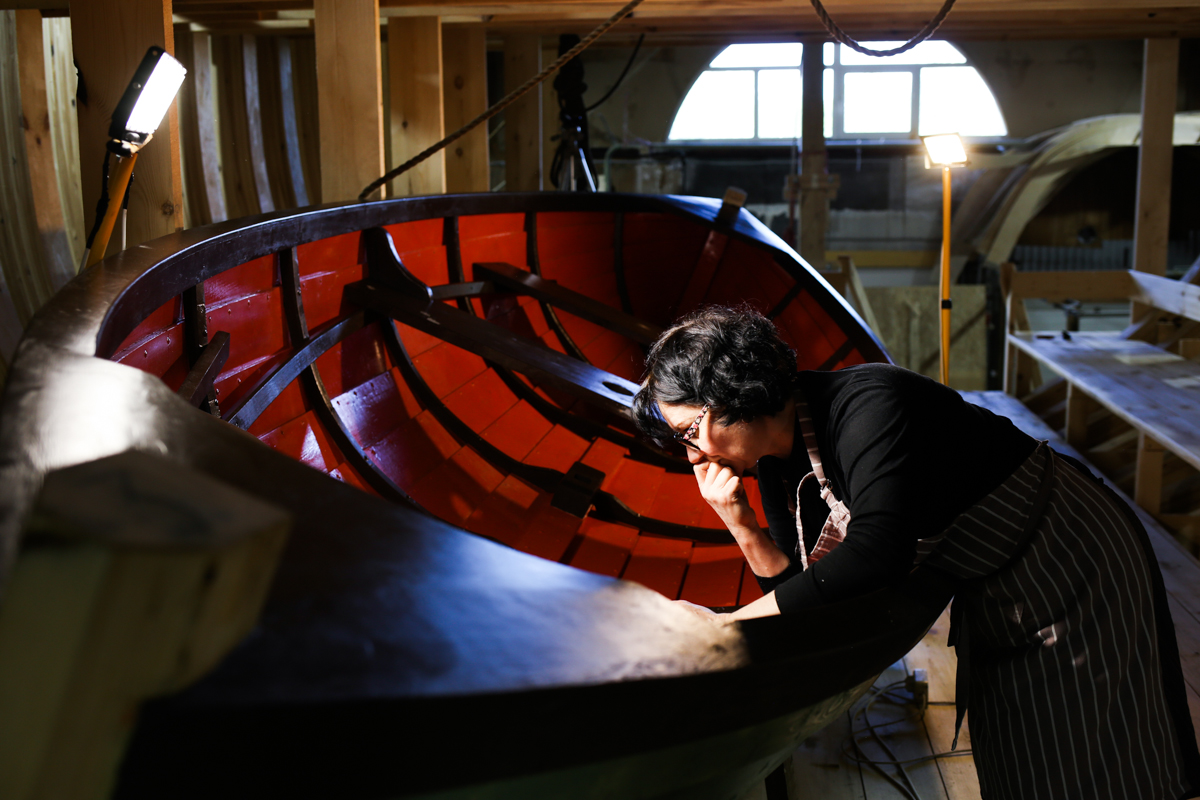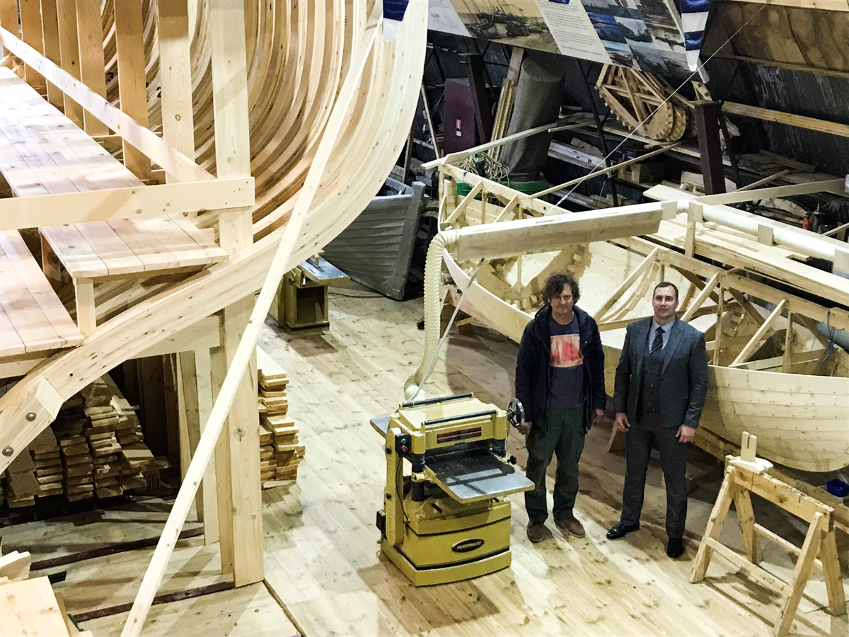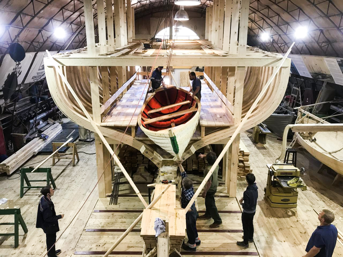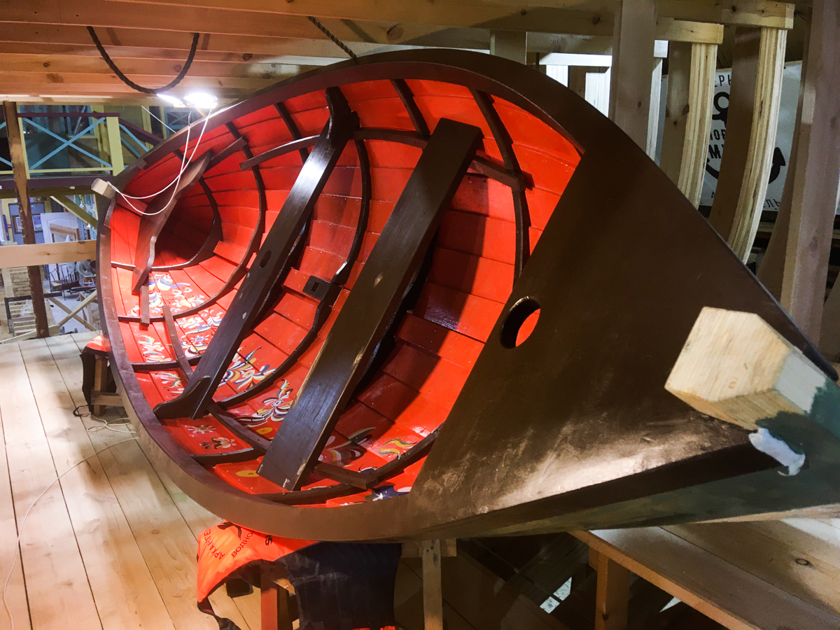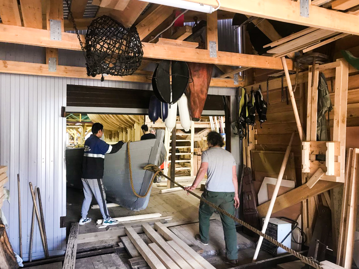 Подняли красный карбас на шхуну и докрашиваем его к мастер-классу в рамках гранта «Топорное дело».