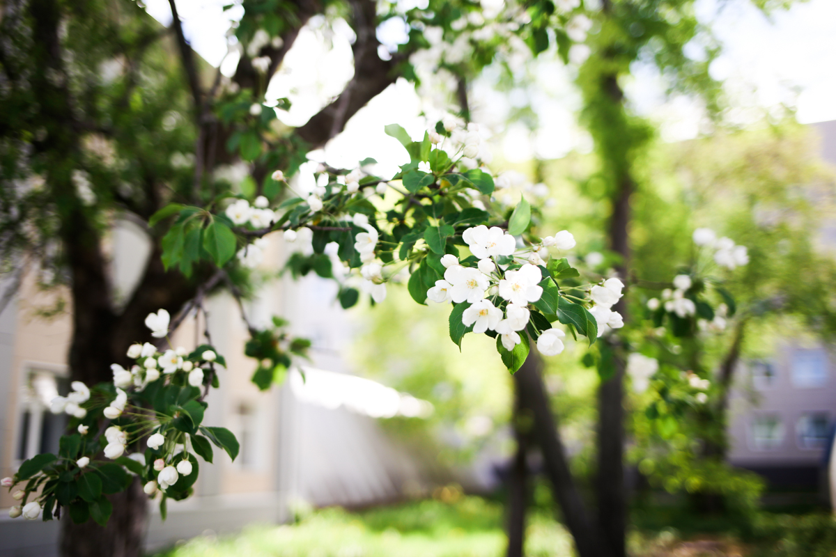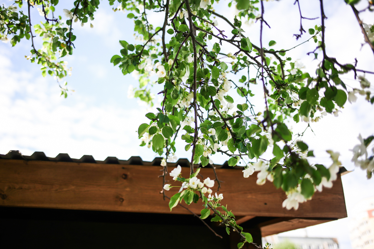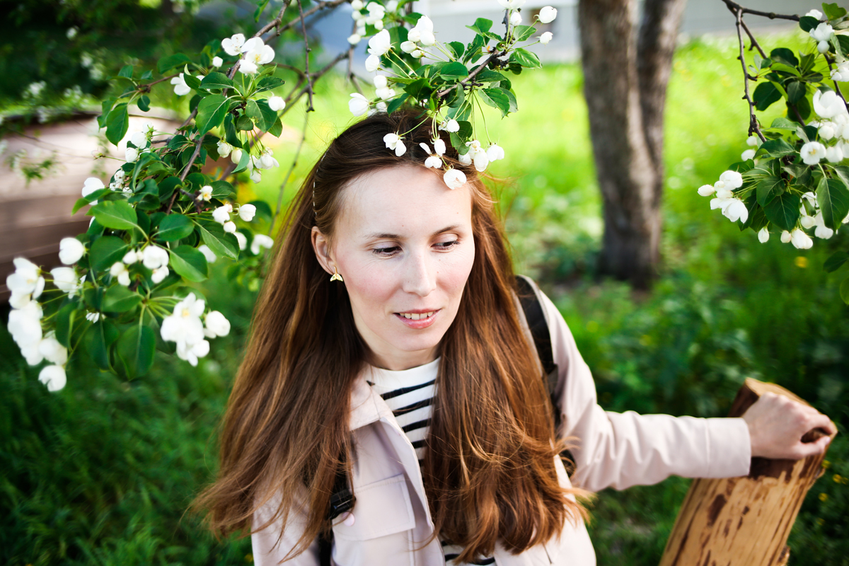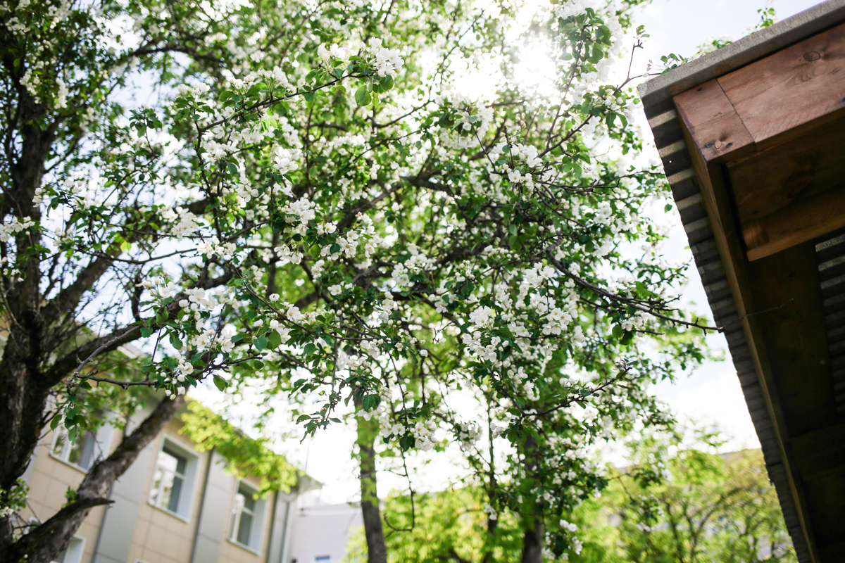 Расцвела возле верфи яблоня, да так, что любо-дорого смотреть. Всех, кто попал под яблоню, Катя фотографирует и очень радуется.