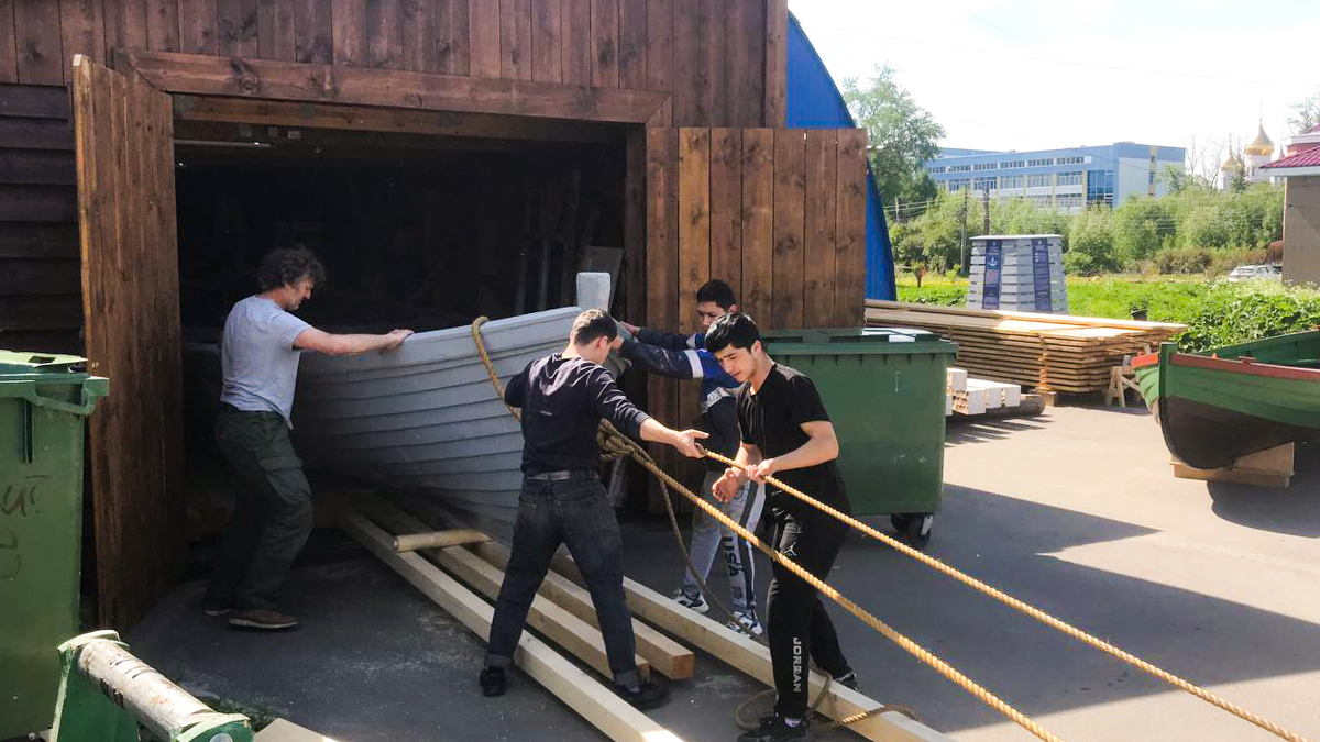 Женя с Андроном красят красный карбас, Ибрагим с Бахой готовят материал для шпринтов.