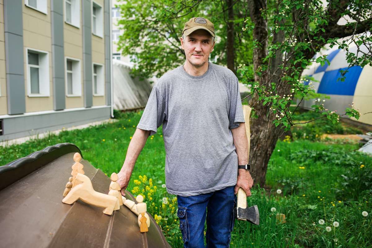 Катя фотографирует мастера Геннадия Букреева, который будет рубить игрушки топором в рамках мастер-класса по гранту «Топорное дело».
