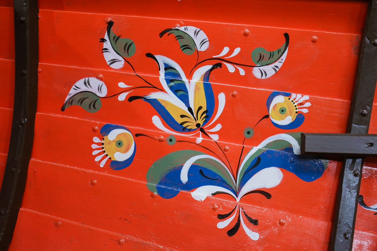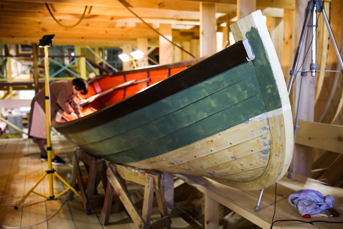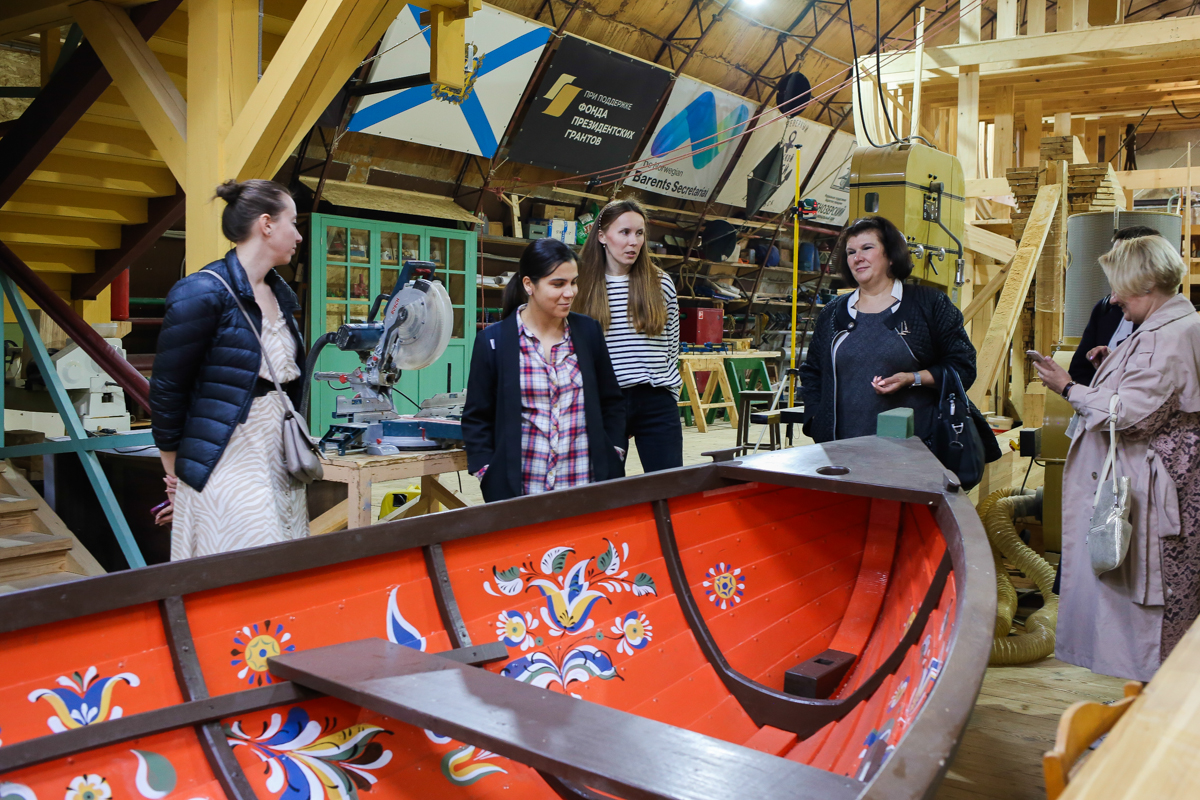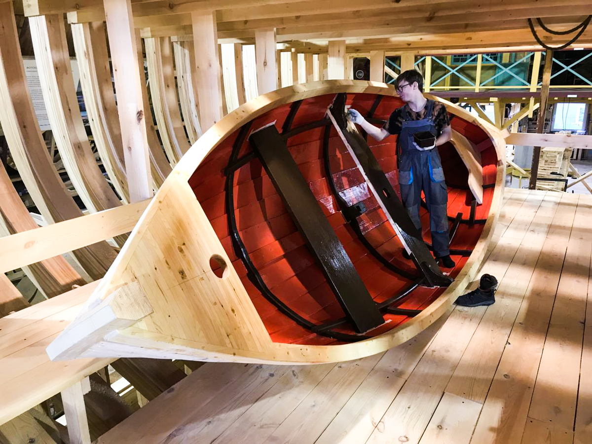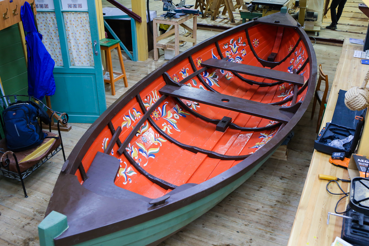 В рамках мастер-класса Наталья демонстрировала свое искусство и обучала этому всех желающих. На глазах зрителей рождалось декоративное убранство нового карбаса: легкий изящный цветочный узор ложился на дно лодки. Предварительно лодка была поднята с пола наверх, в пространство строящейся шхуны, а внутри покрашена в красно-коричневый цвет — такой фон любили делать уфтюжские мастера росписи на прялках и берестяных туесах.