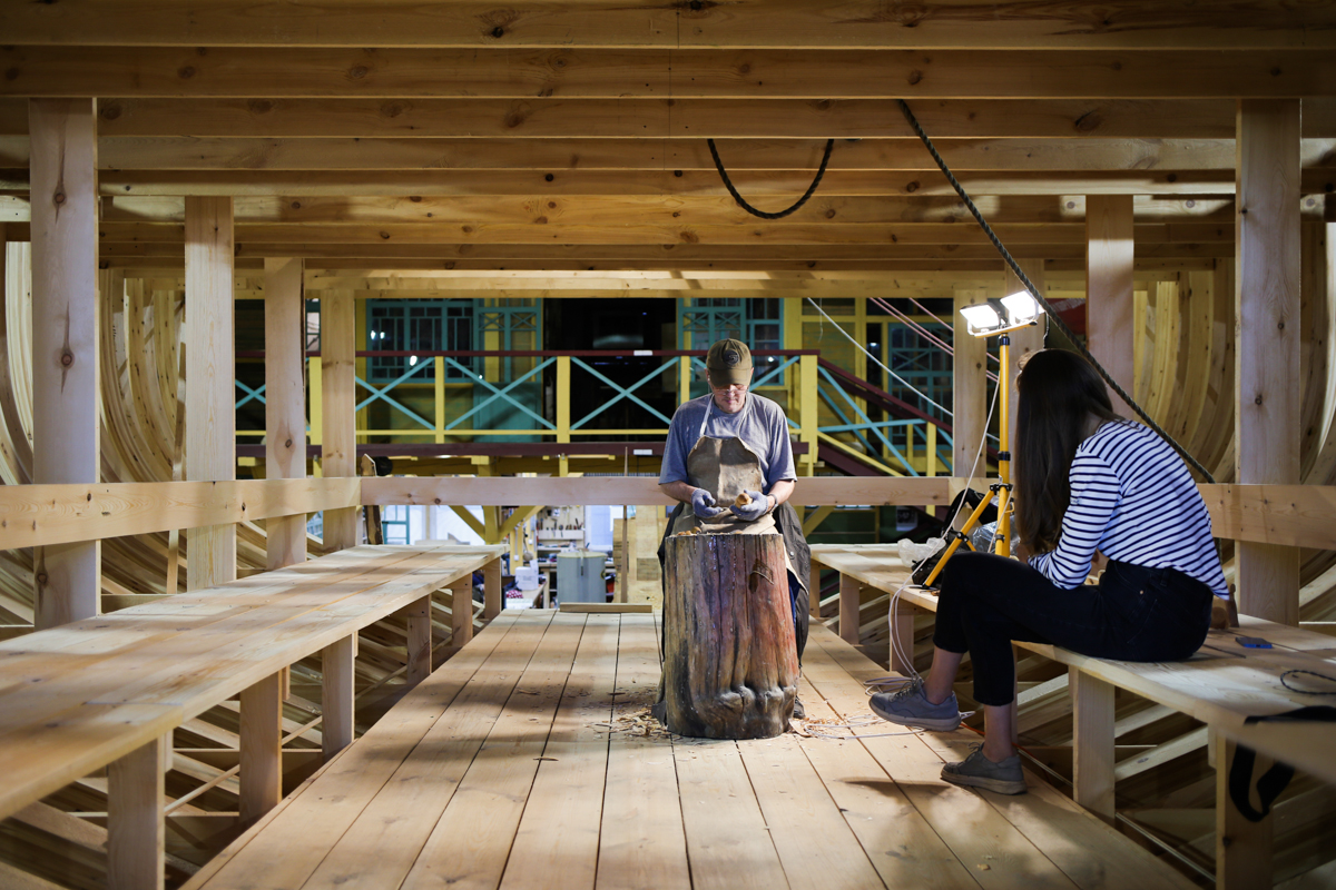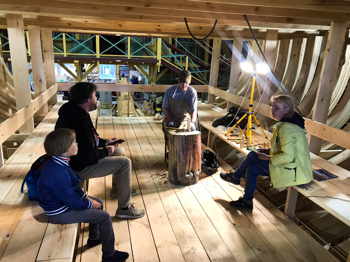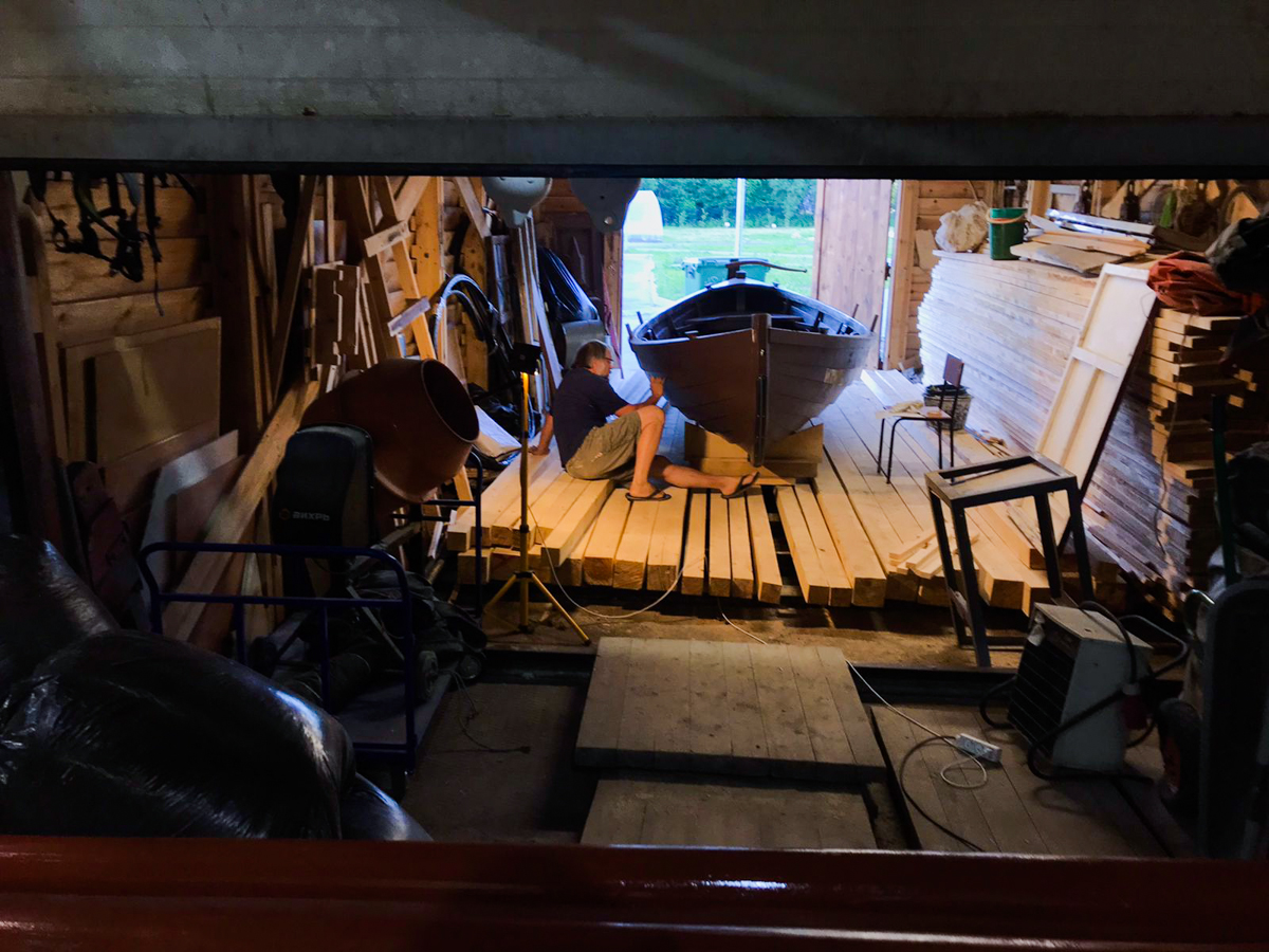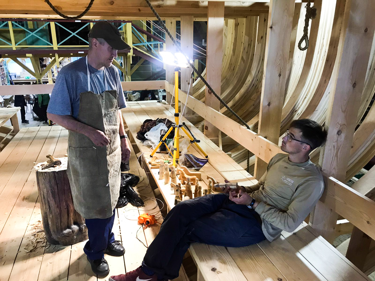 Плотники-столяры продолжают плотничать и столярничать: Ваня занят тимберсами нового шпангоута, Тёма взялся за пайолы для карбаса, Игорь доводит дейдвуд до совершенства, Александр точит мачты.