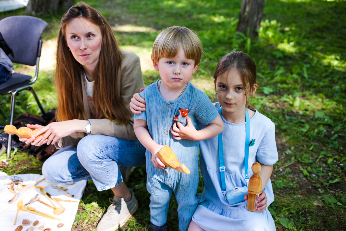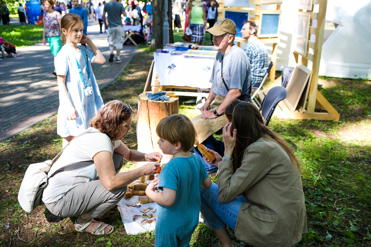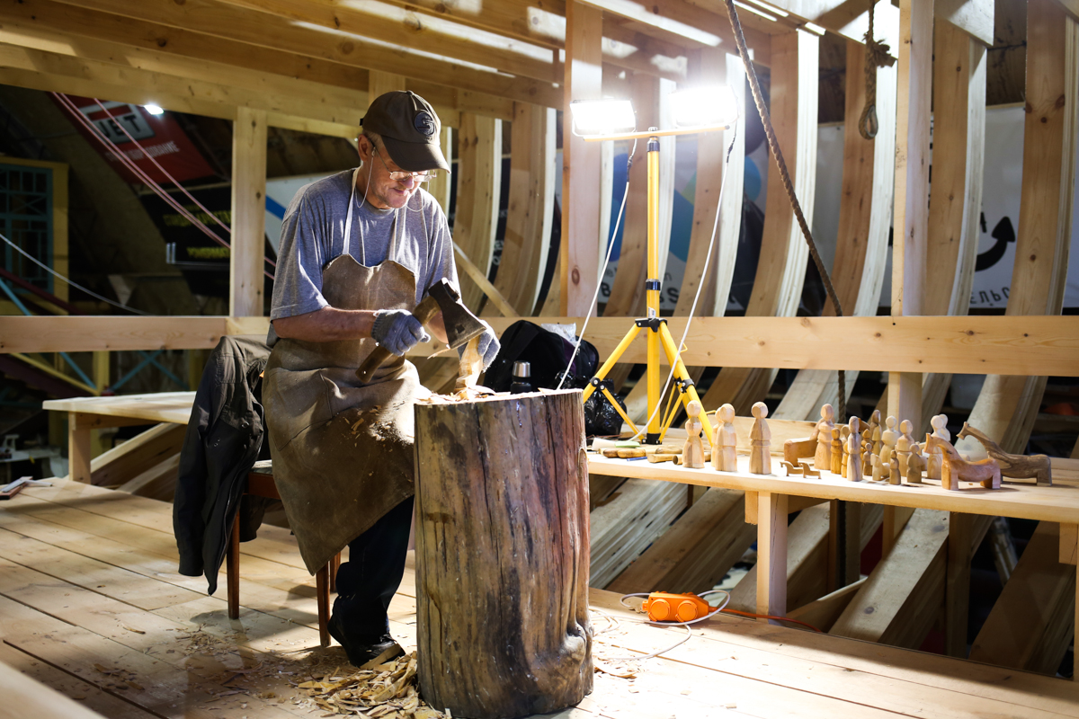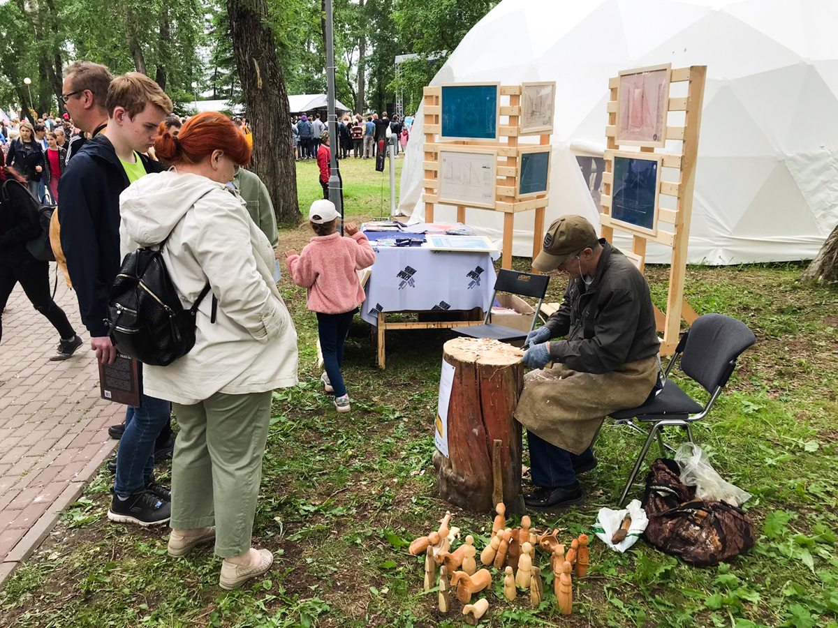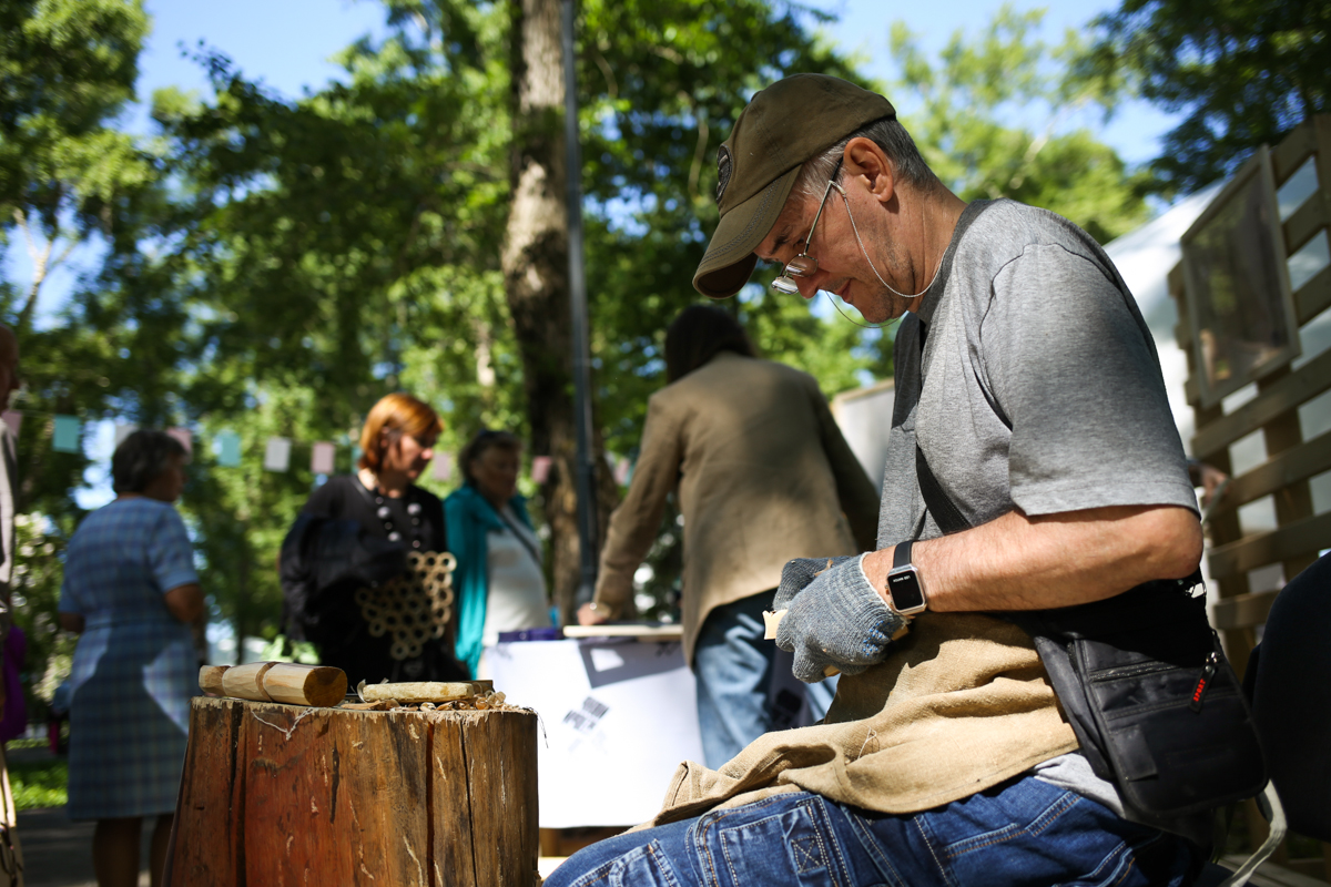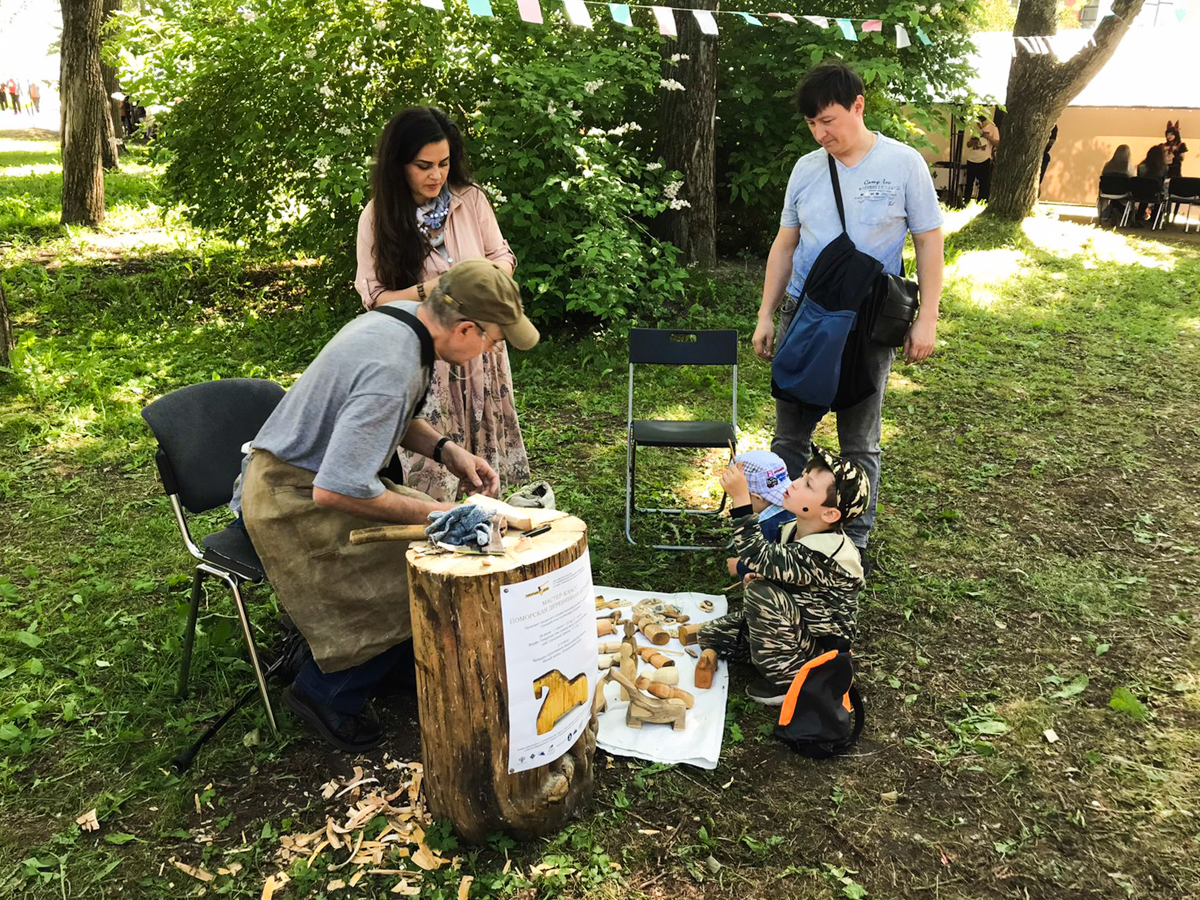 Геннадий с мастер-классом по поморской деревянной игрушке перебрался с верфи в Петровский парк.