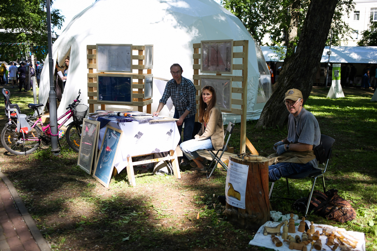 Поля и Федор несут вахту возле стенда и снабжают горожан чертежами и прочими штуками.