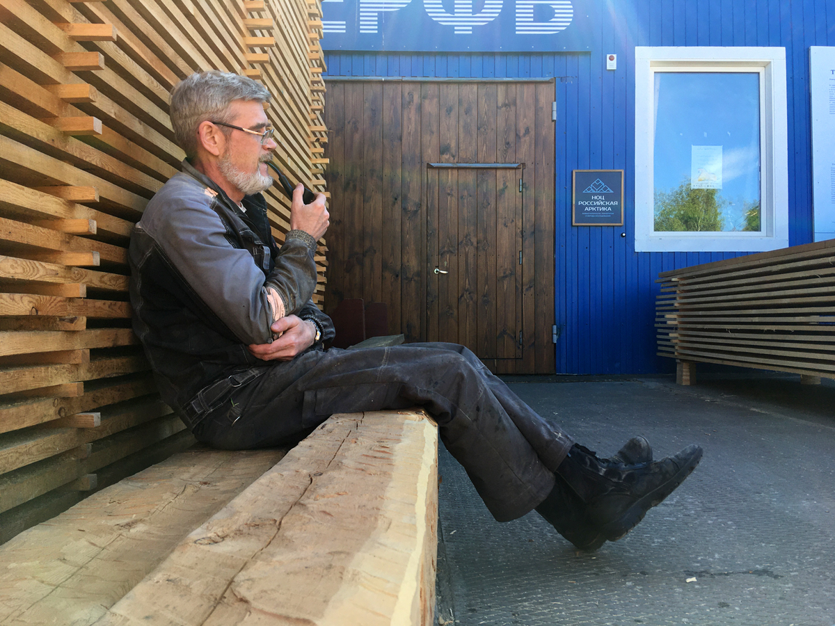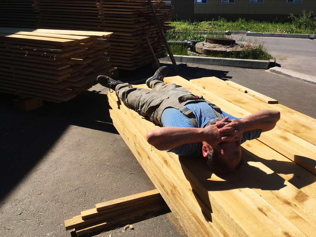 Тепло. В обеденный перерыв столяры плотники и прочие наши работники греются на солнышке, чтобы немного передохнуть. Святое дело!