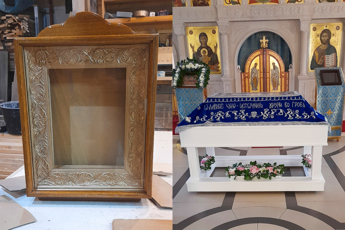 Наш столяр Артем – очень трудолюбивый человек, он работает сразу на множестве работ, так что и в отпуске он был верен себе: строил свой собственный дом (кстати, параллельно Артем строит сразу два собственных дома: в городе и деревне). А еще делал киоты и гробницу для плащаницы в Троицком храме.