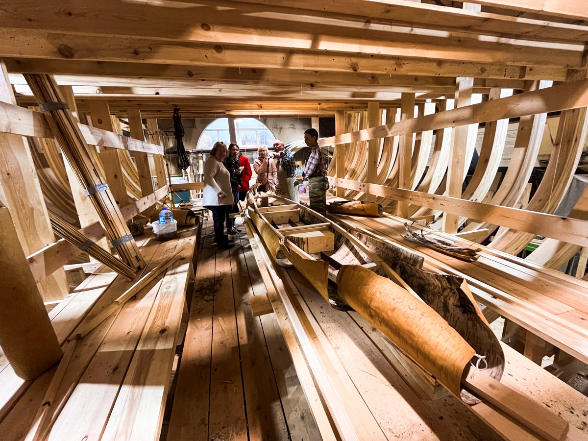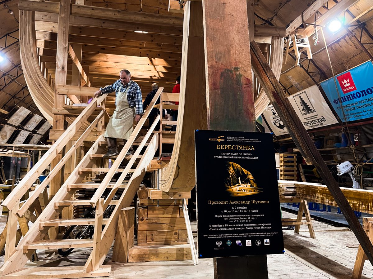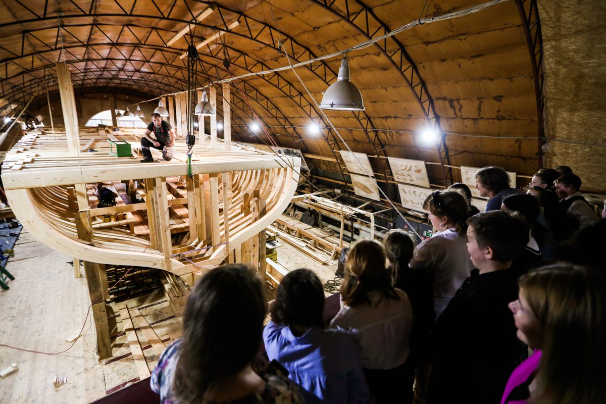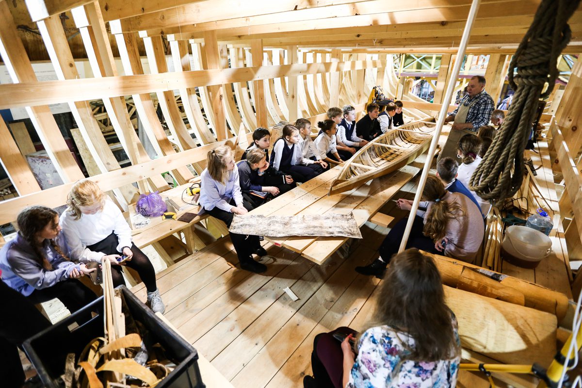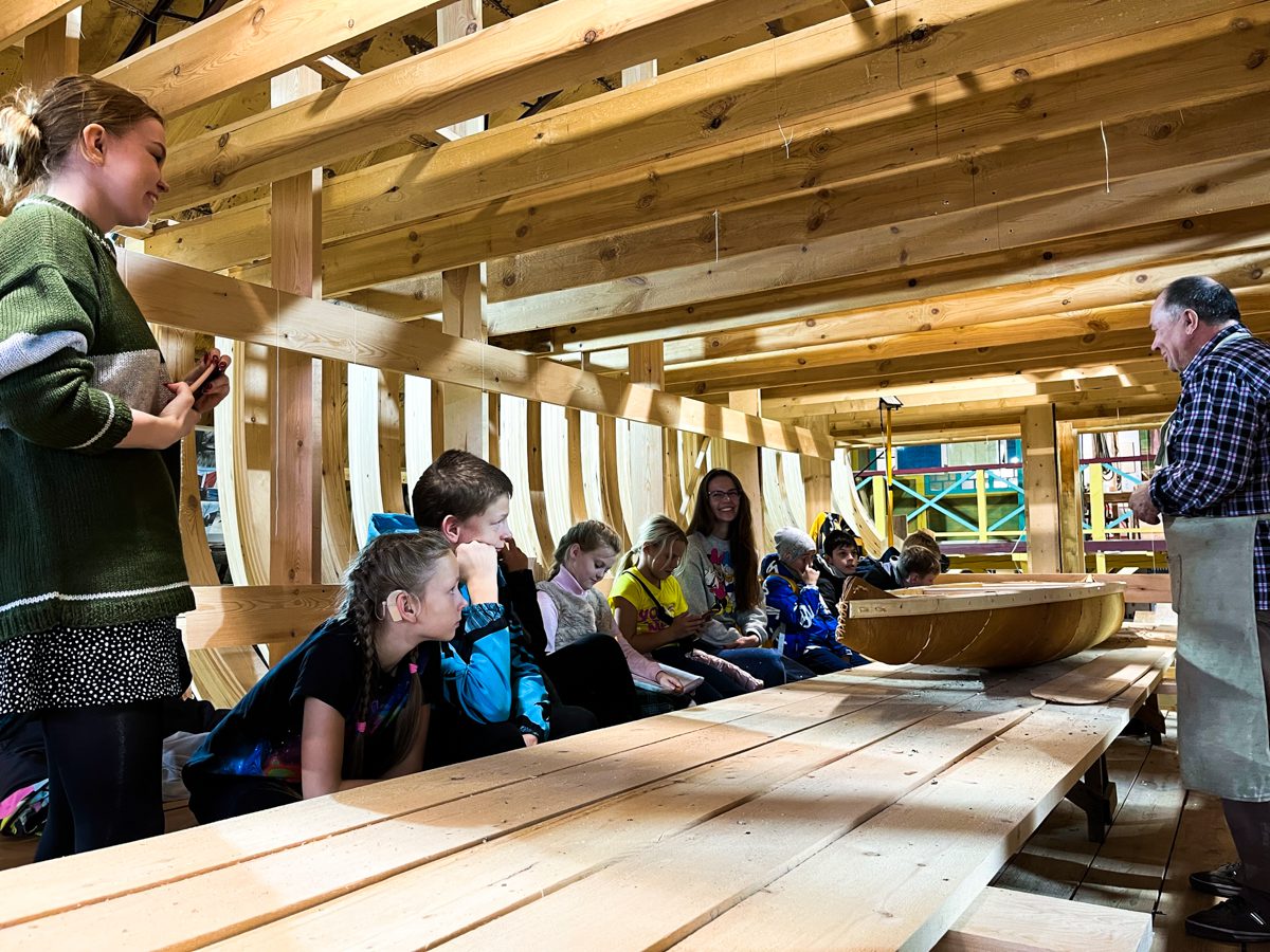После установки шпангоута школьники побывали на мастер-классе по строительству берестянки и прошлись по верфи с экскурсией от нашего капитана.