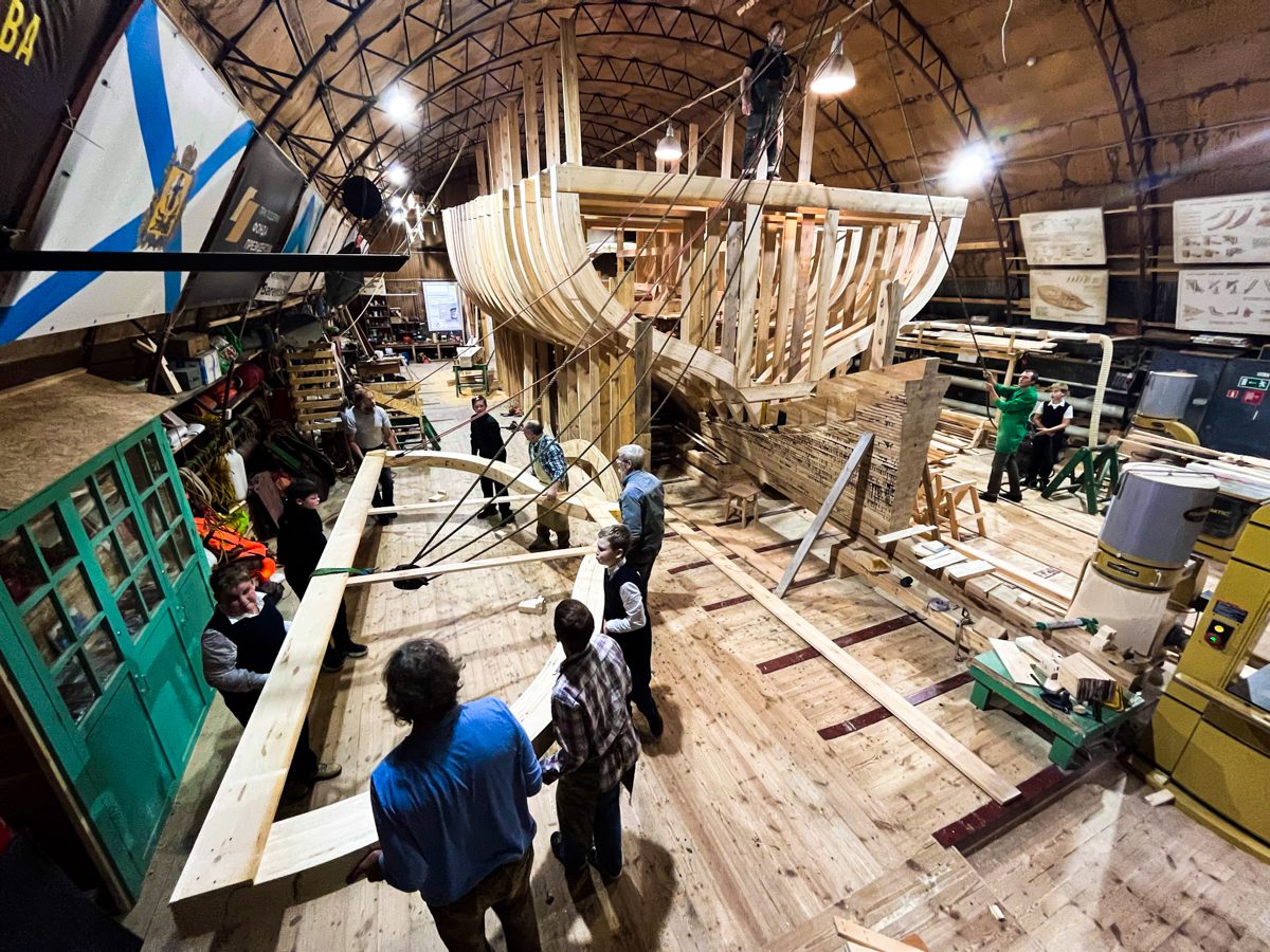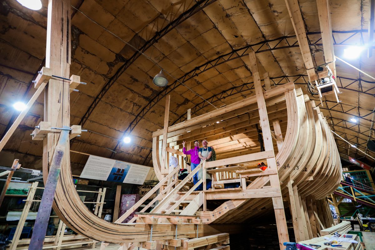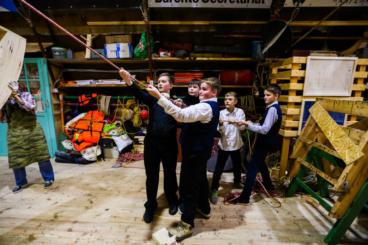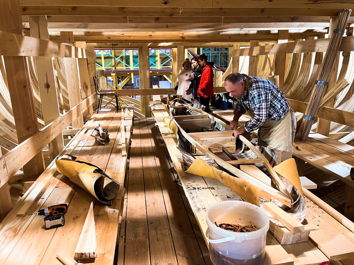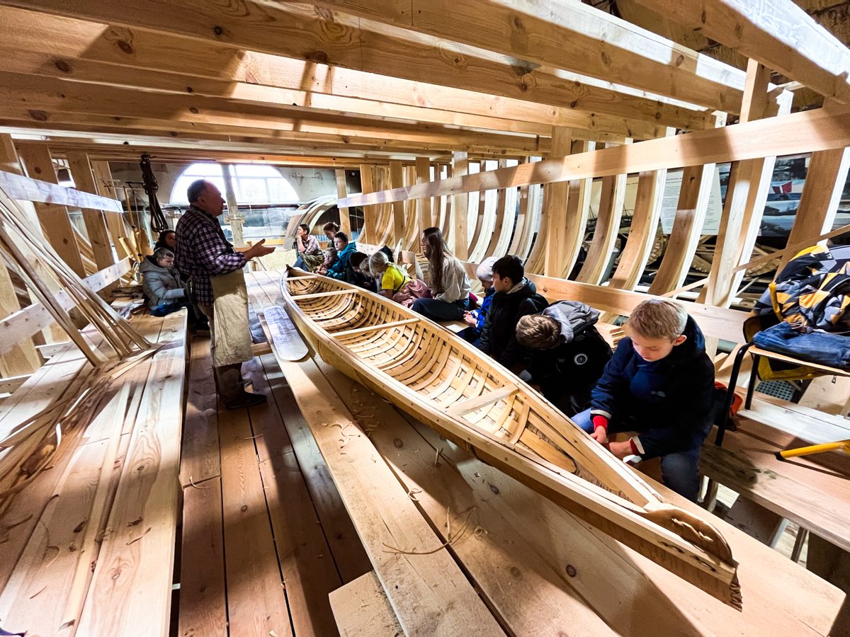 После установки шпангоута школьники побывали на мастер-классе по строительству берестянки и прошлись по верфи с экскурсией от нашего капитана.