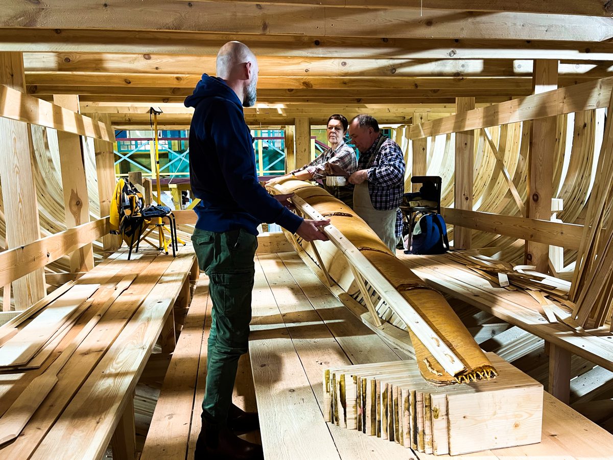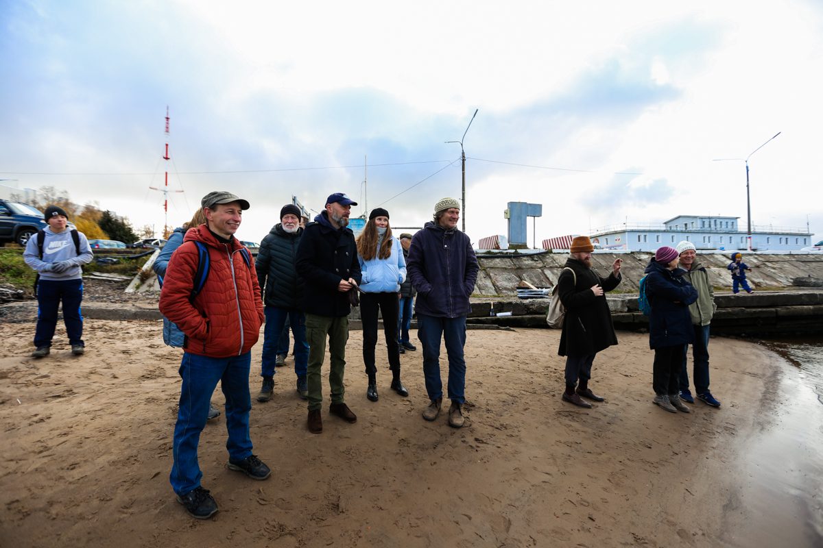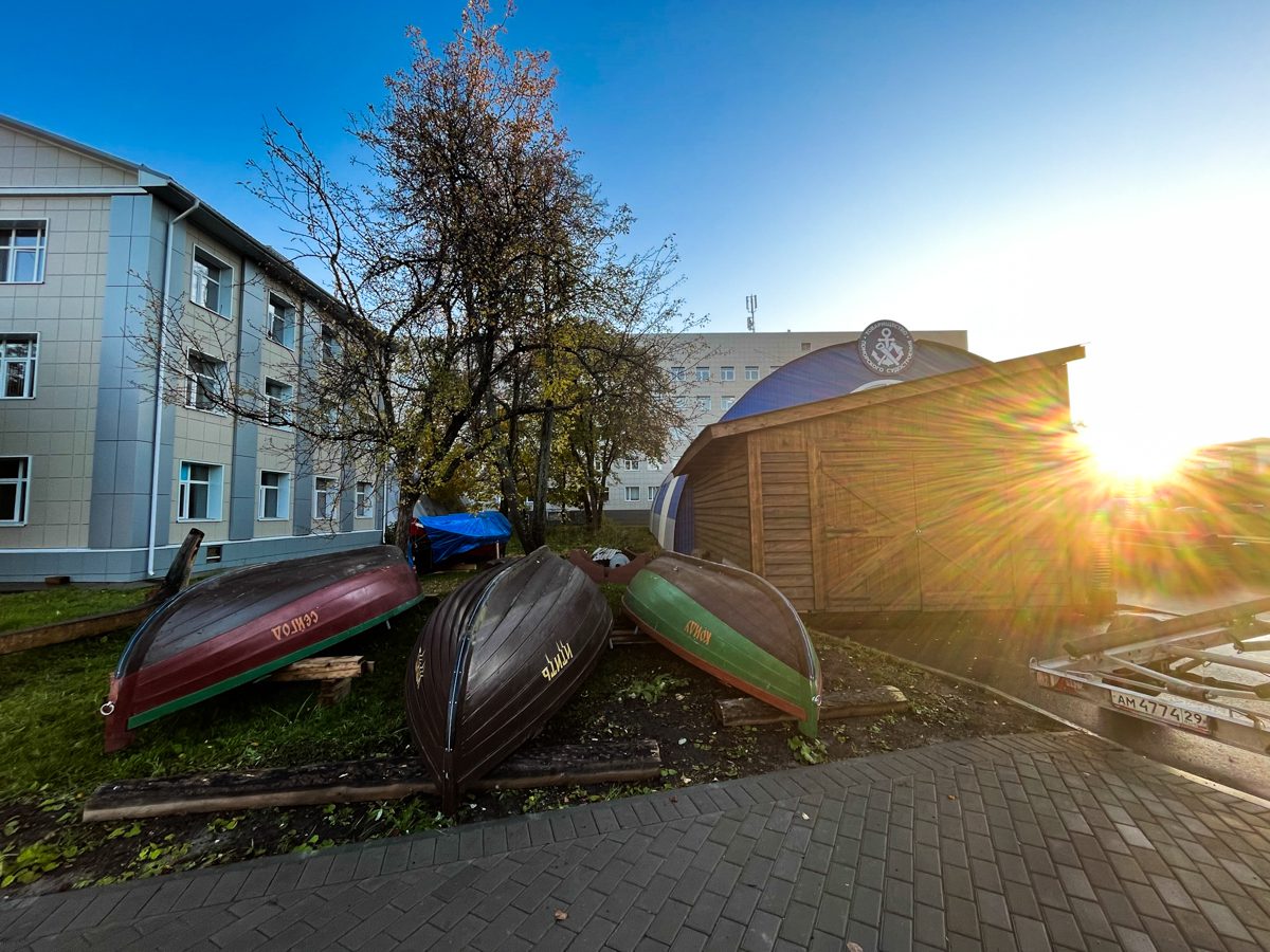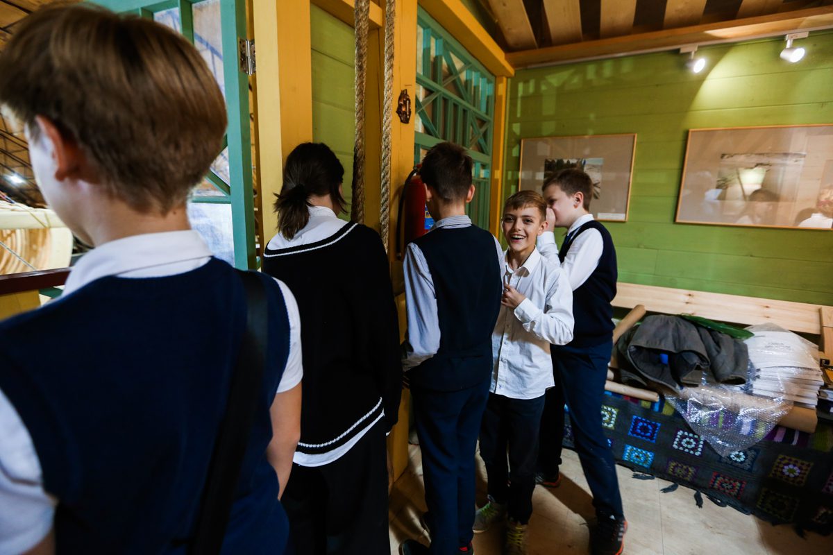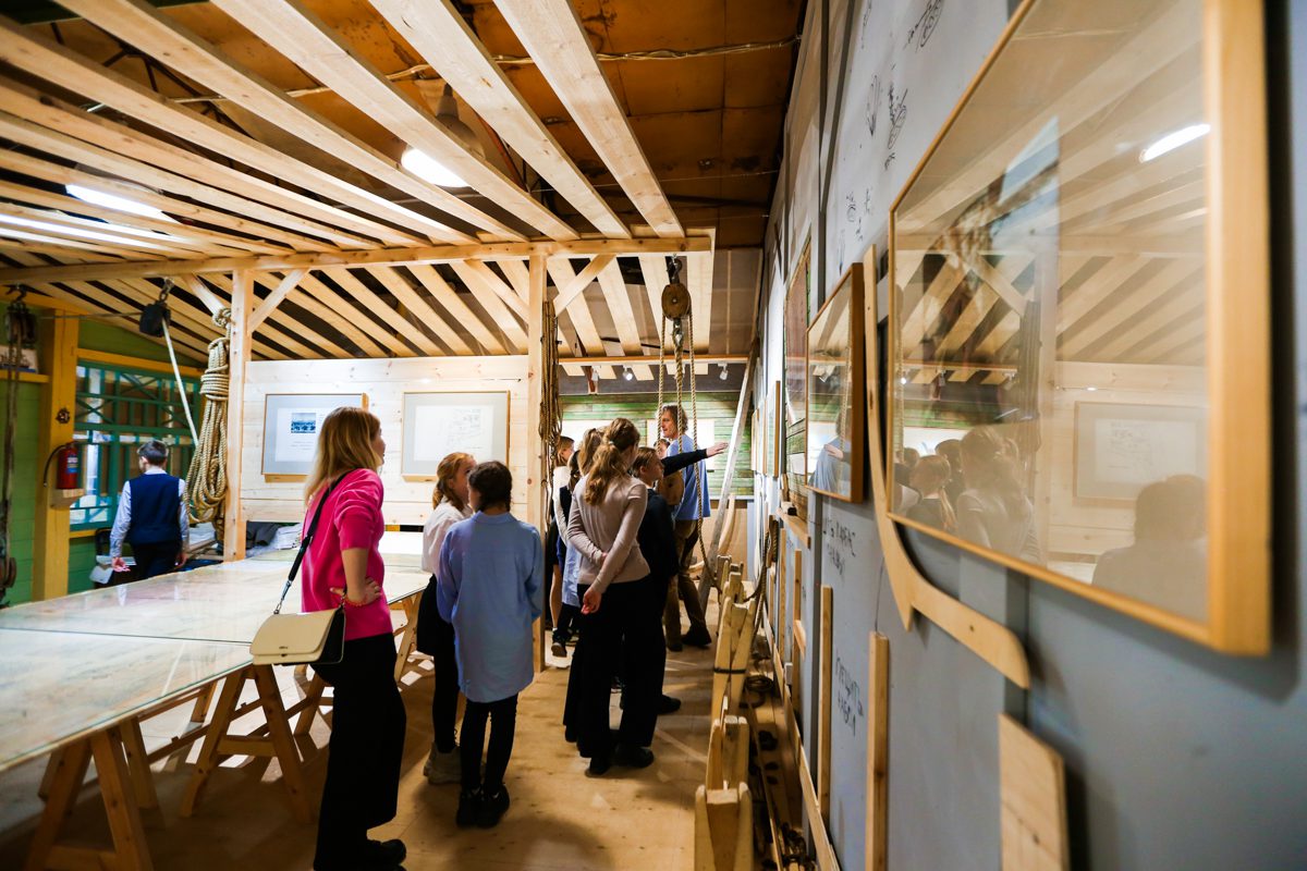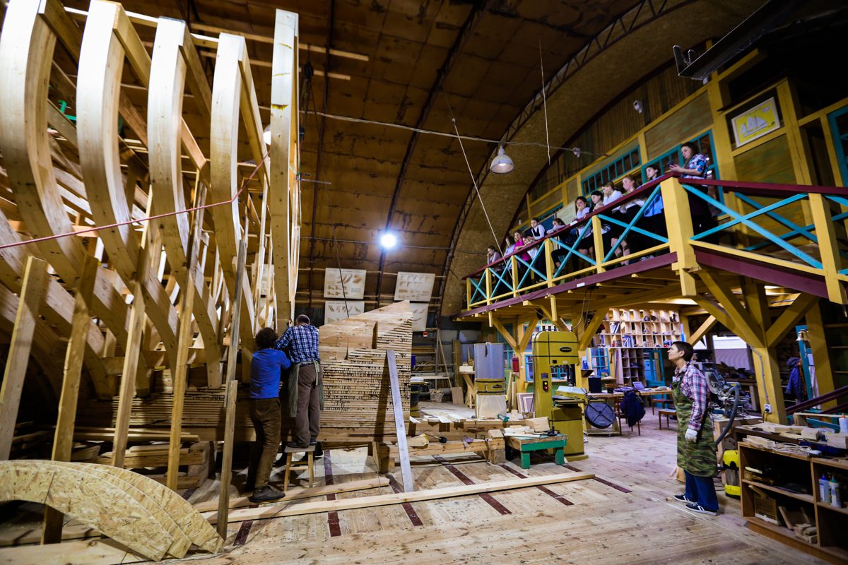 После установки шпангоута школьники побывали на мастер-классе по строительству берестянки и прошлись по верфи с экскурсией от нашего капитана.