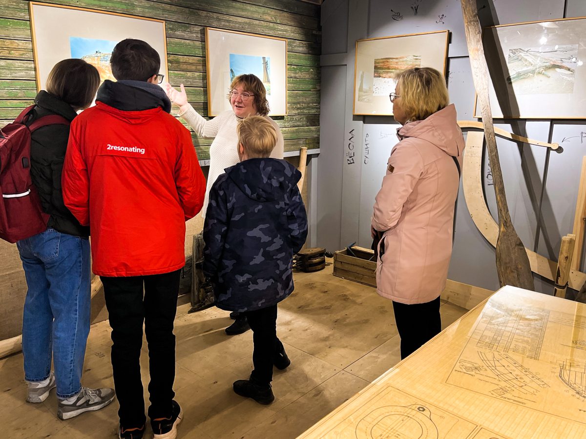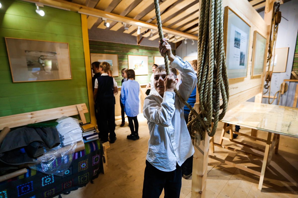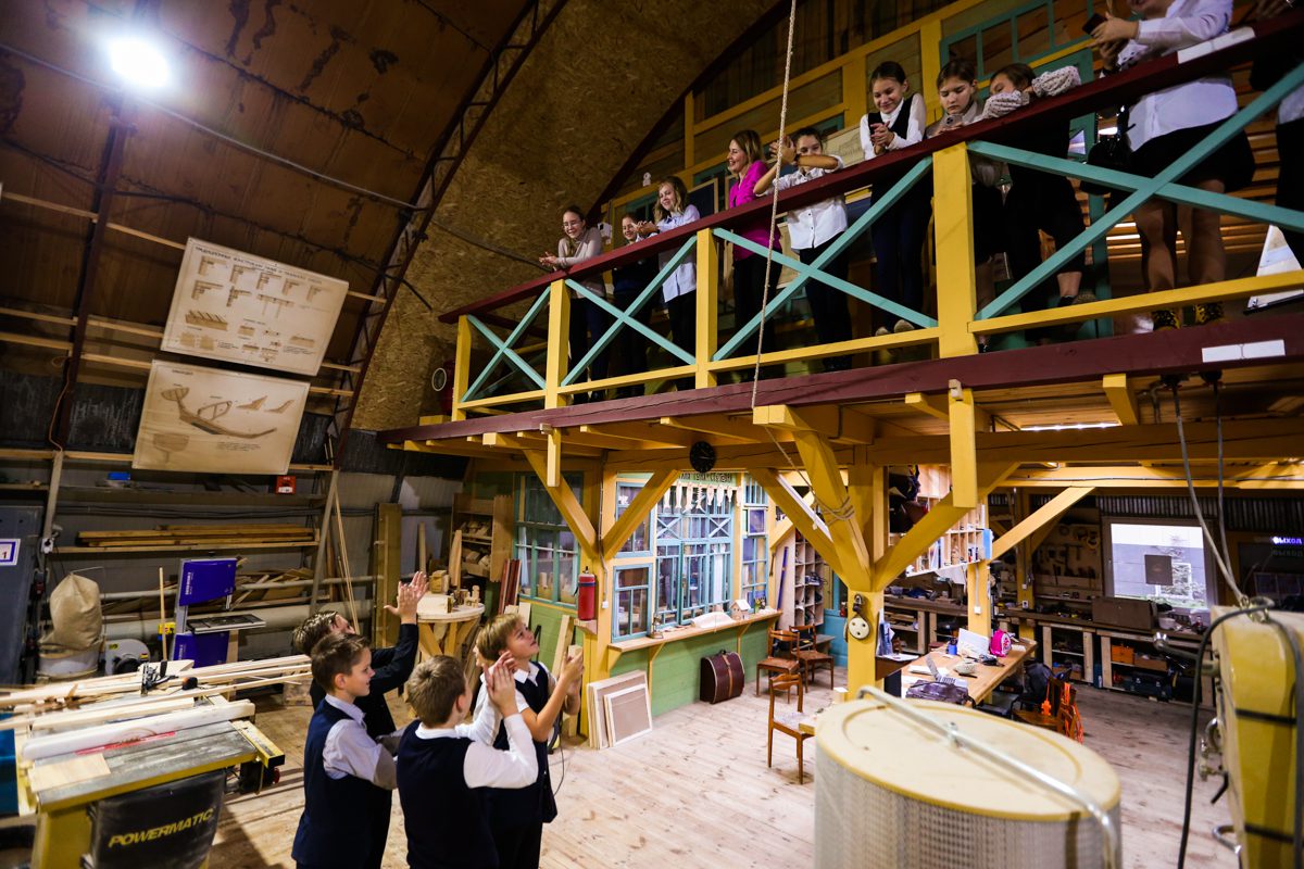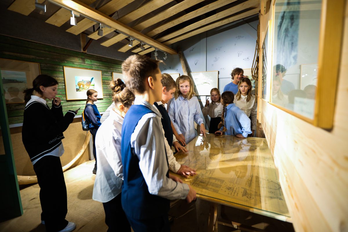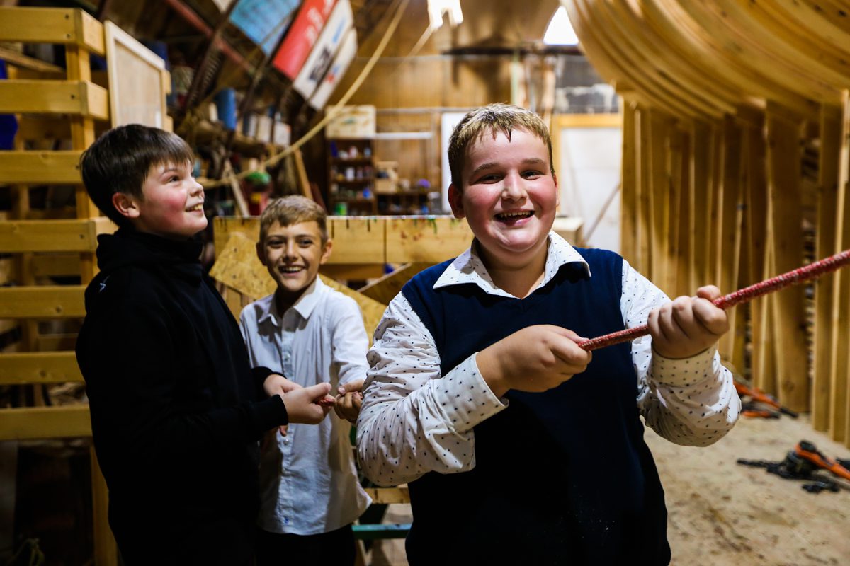 После установки шпангоута школьники побывали на мастер-классе по строительству берестянки и прошлись по верфи с экскурсией от нашего капитана.