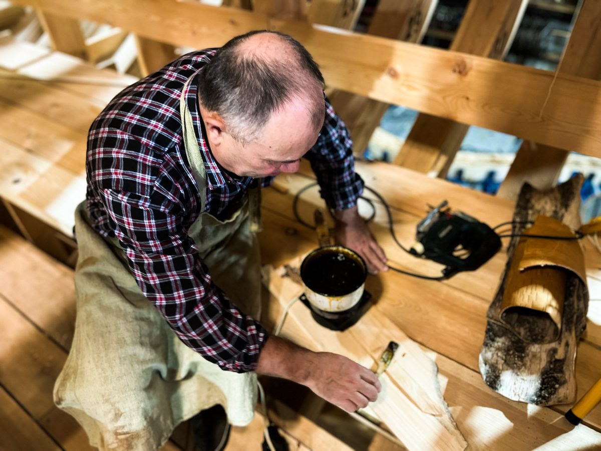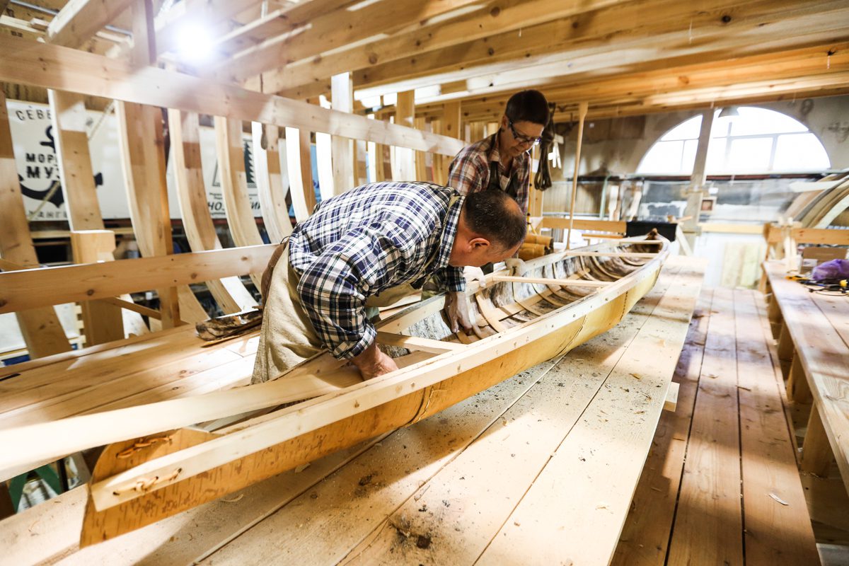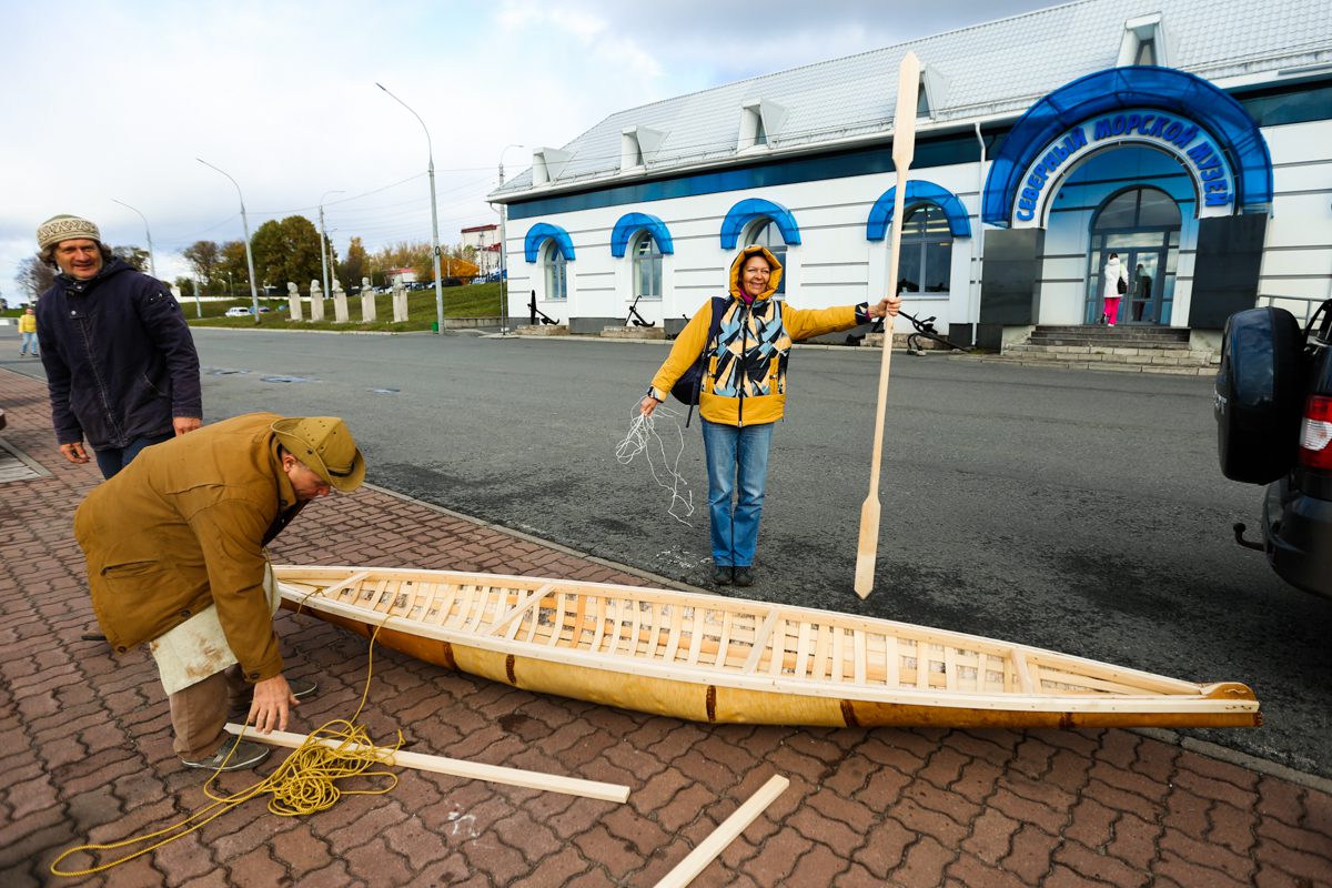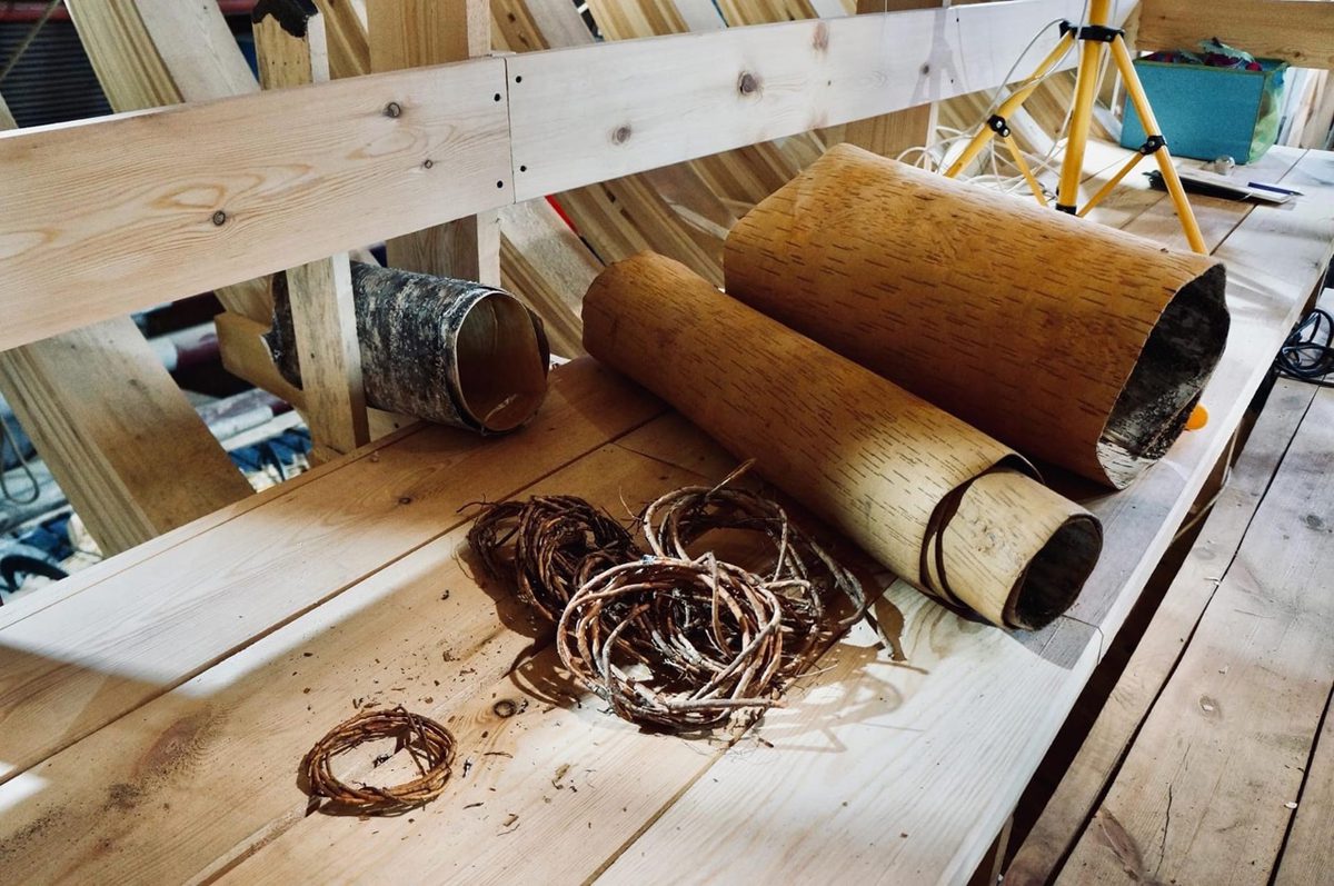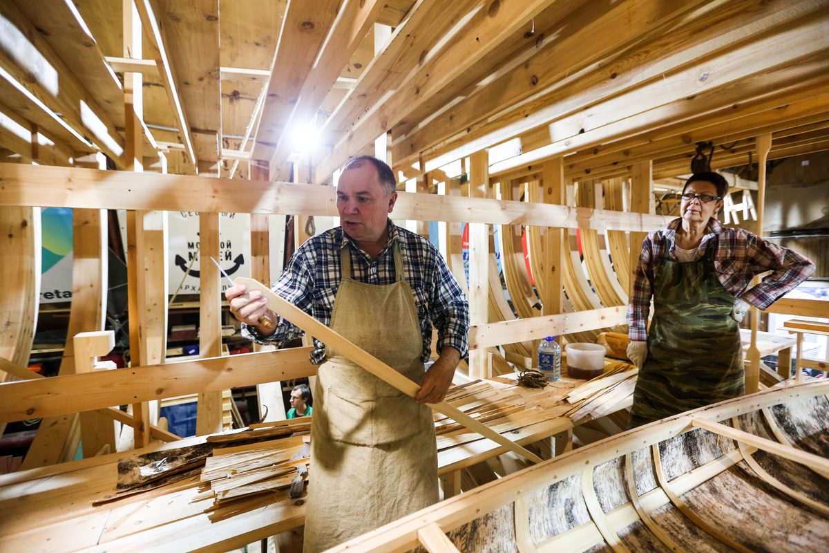 Стартовал мастер-класс «Берестянка»: Александр Шутихин с Мариной сделали внутреннюю раму-основу лодки, изготовили выкройку из листов бересты и подогнали ее. На мастер-класс приходят гости, мастера обо всем рассказывают, Катя все снимает.