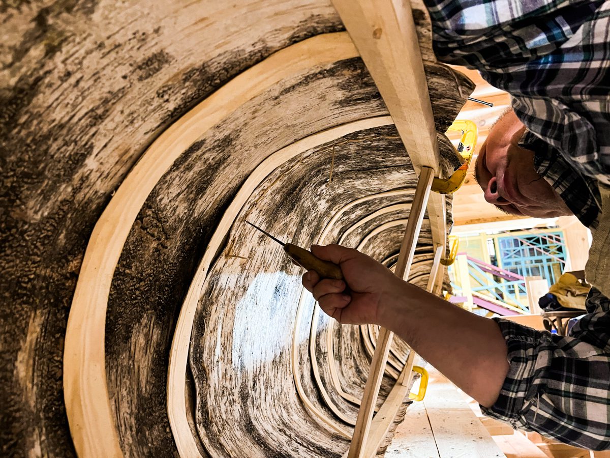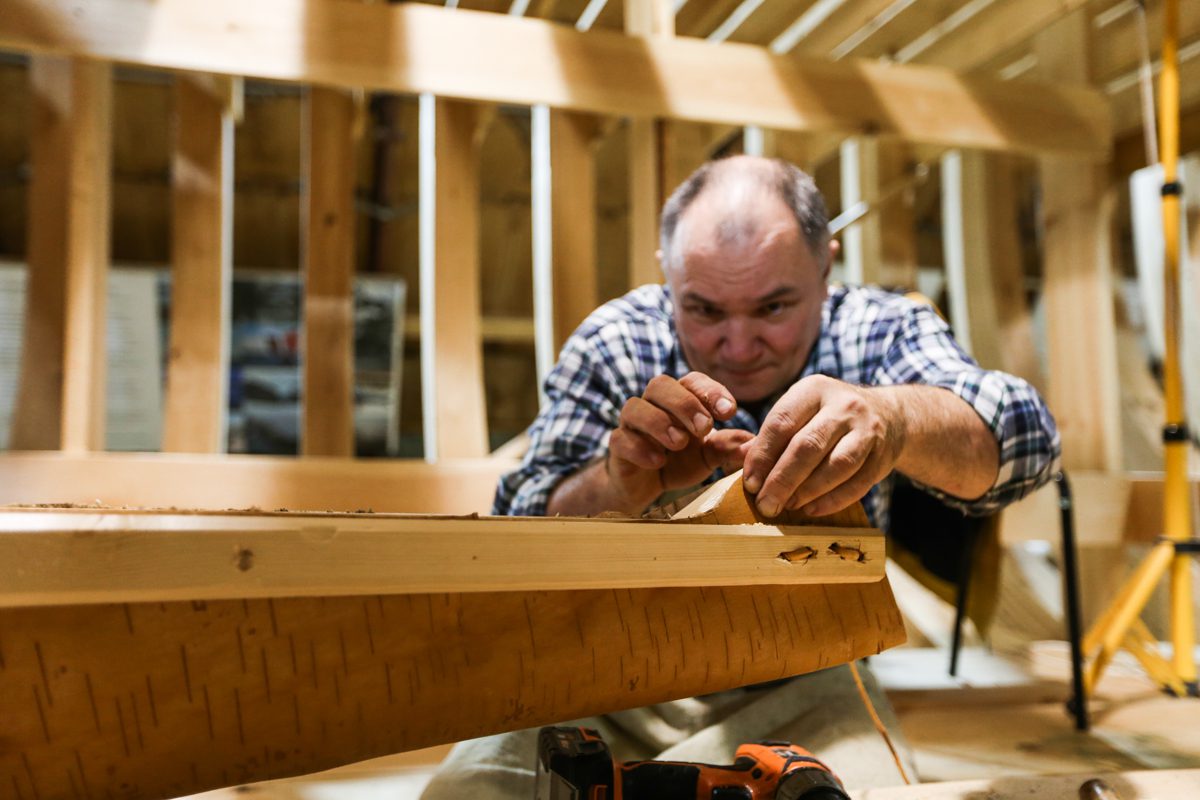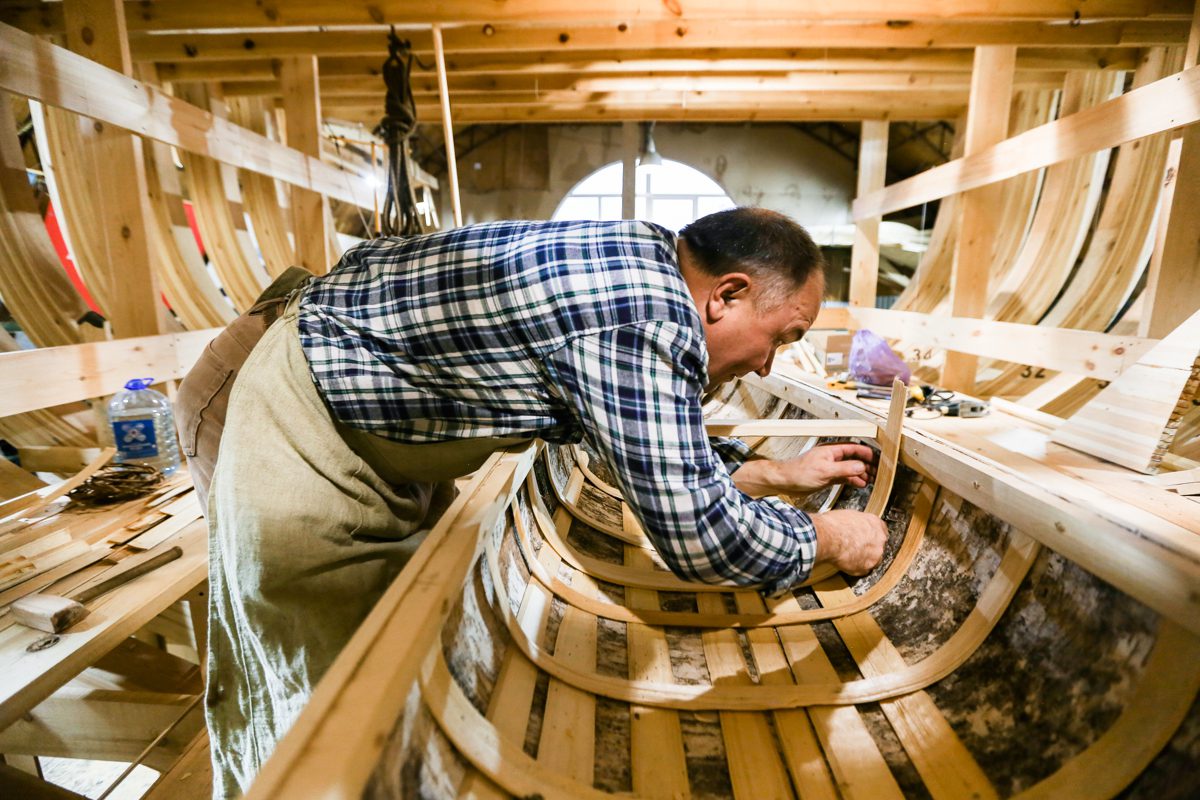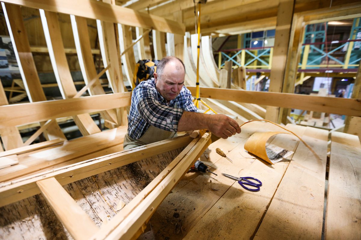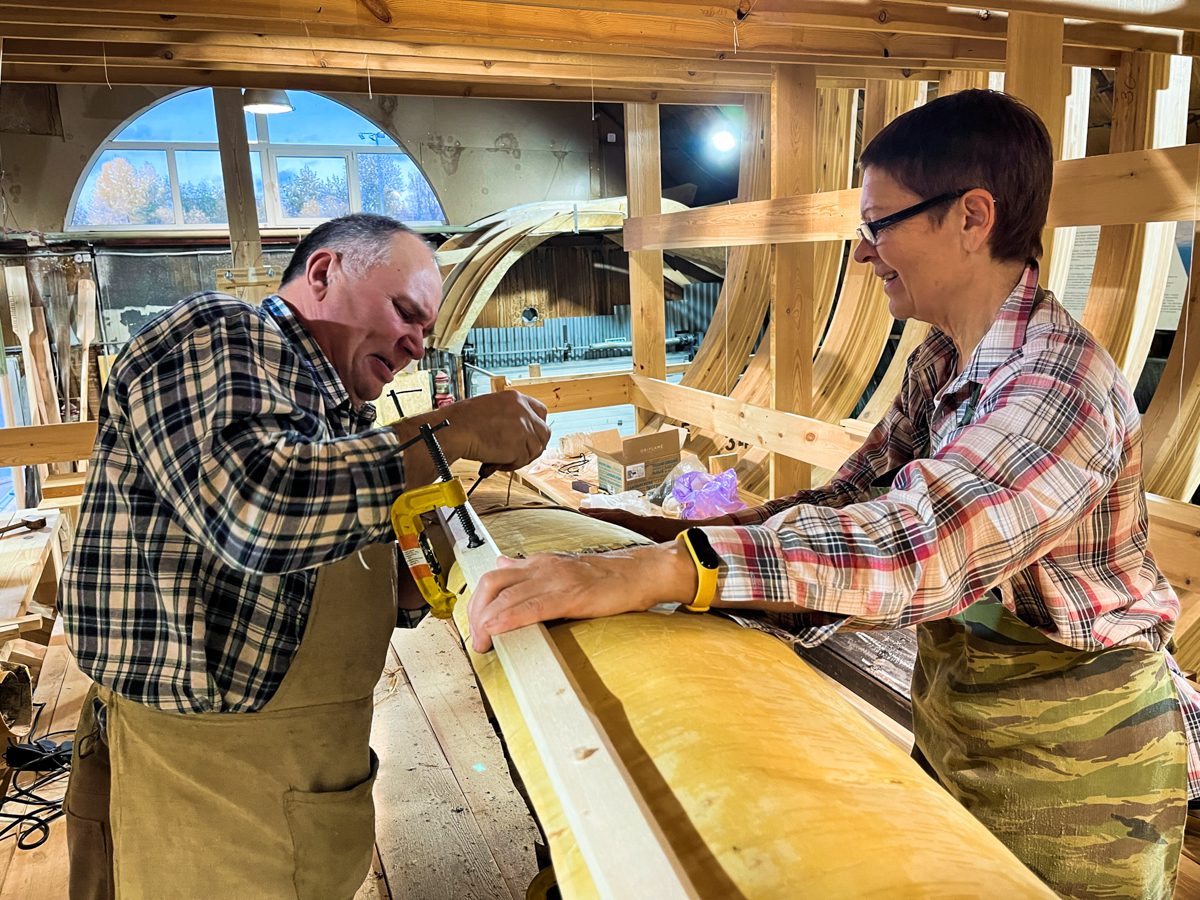 Александр Шутихин с Мариной сделали внешнюю раму берестянки, приладили ее к внутренней раме и перешли к прошивке бересты. Срок спуска лодки на воду назначен на 12:00 в воскресенье.