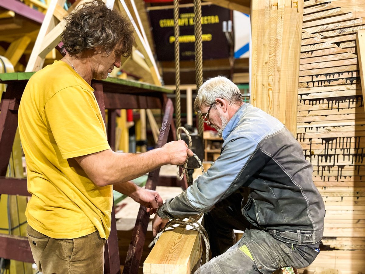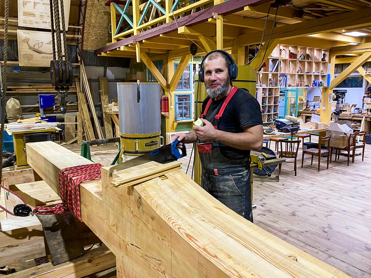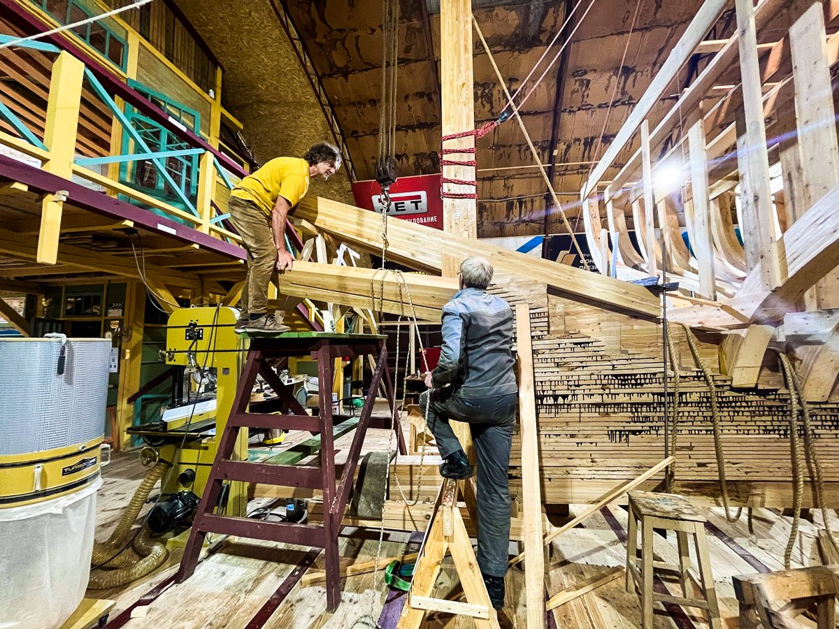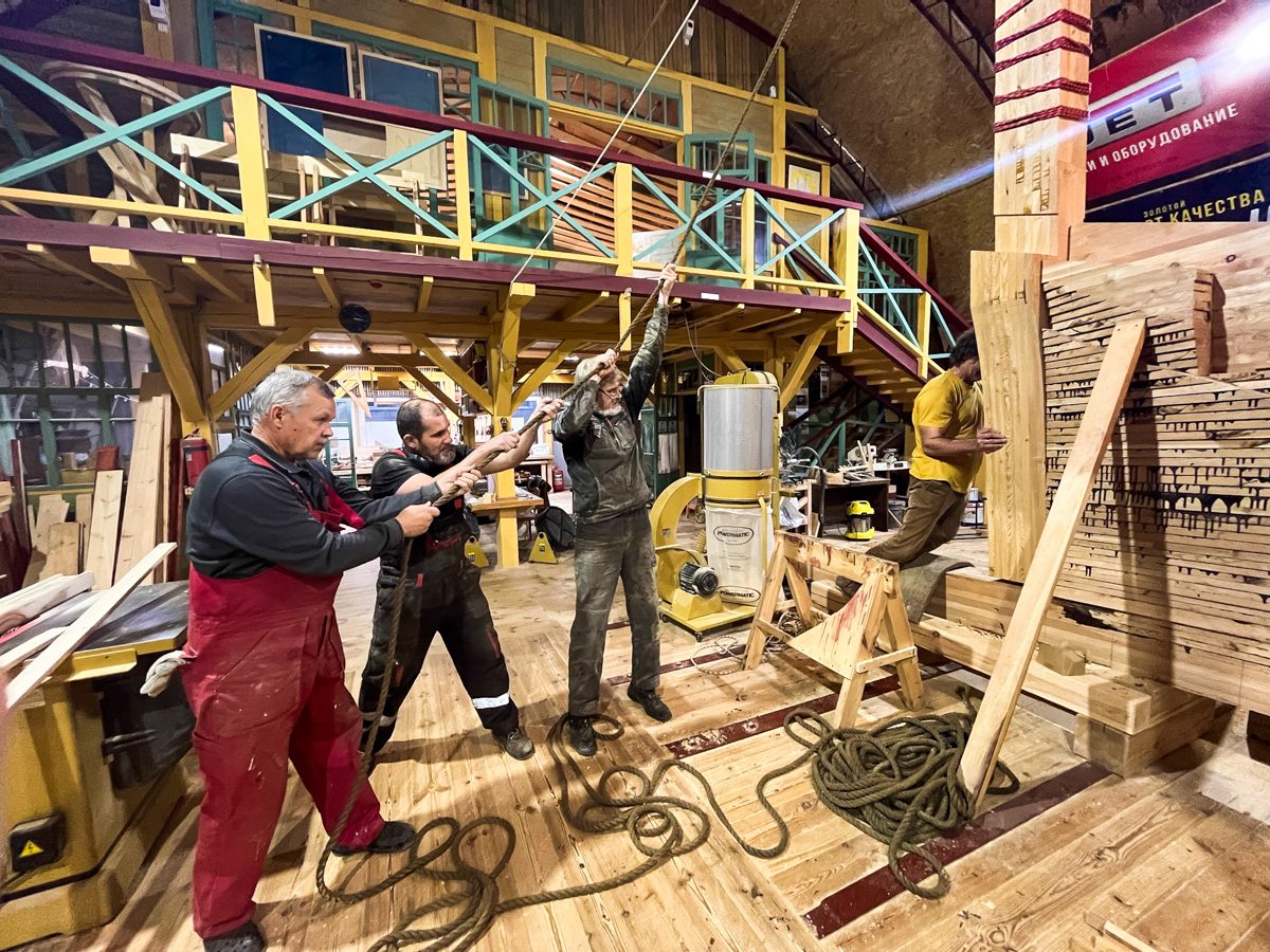 В ангаре все заняты тем же, чем и вчера. Пилим, строгаем, клеим и строим. Артем и Игорь готовятся соединить старнпост и горнтимберс.