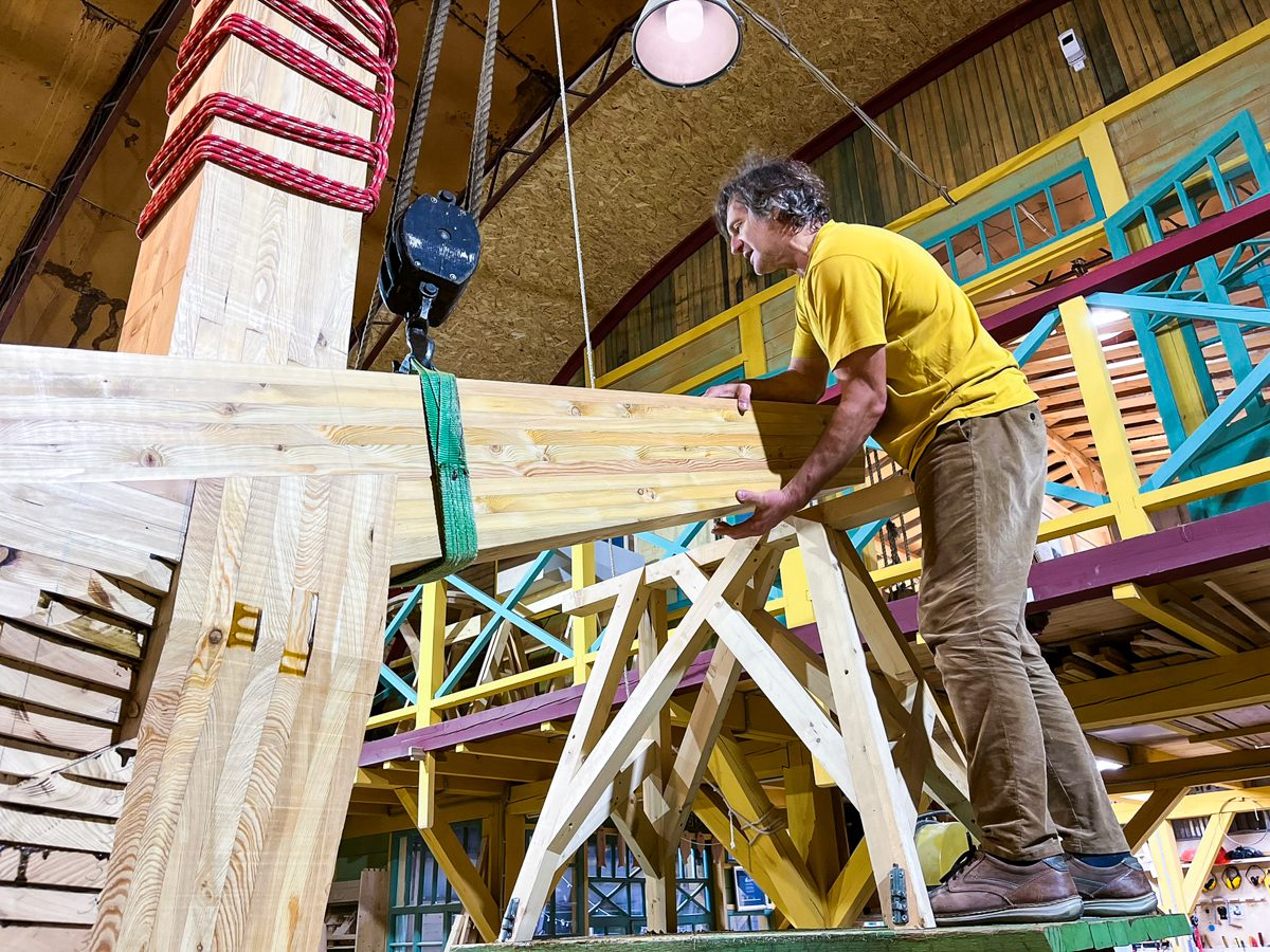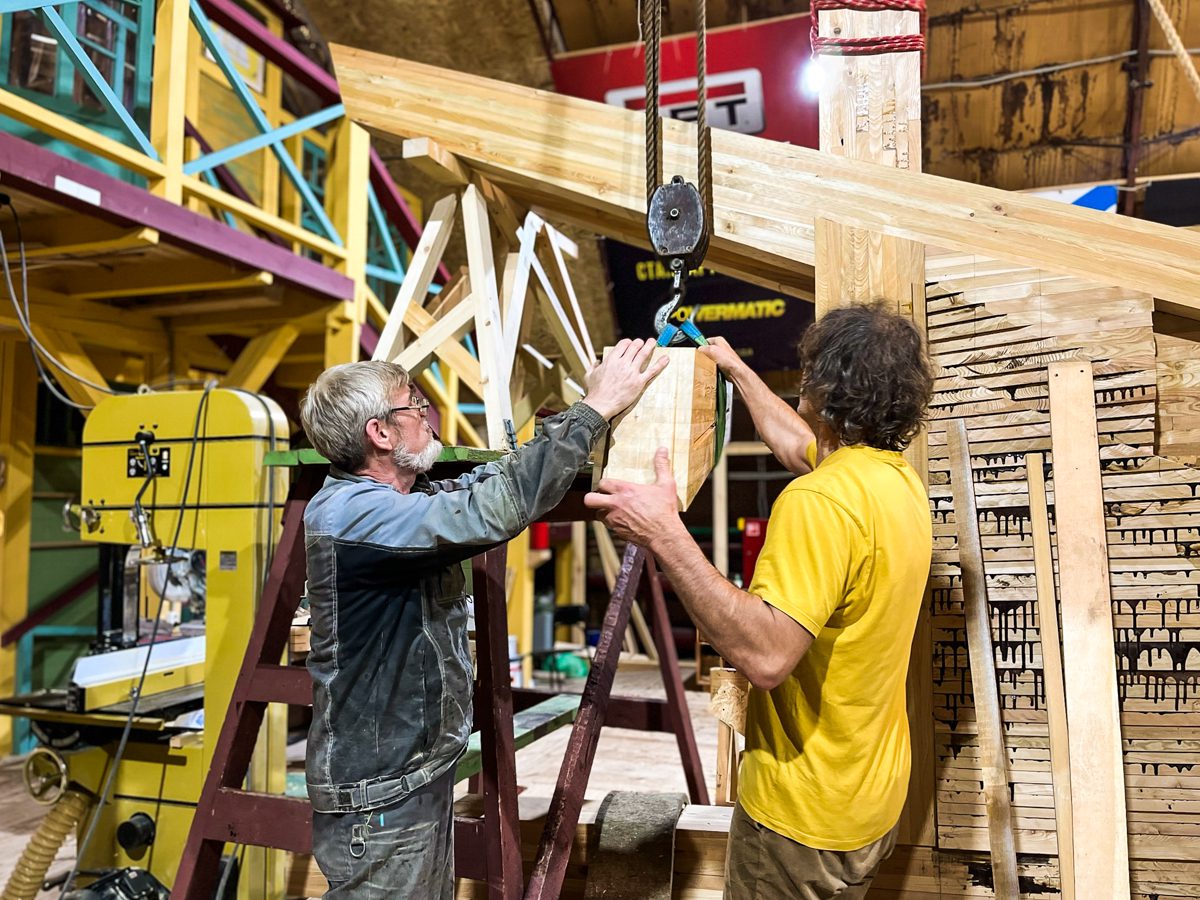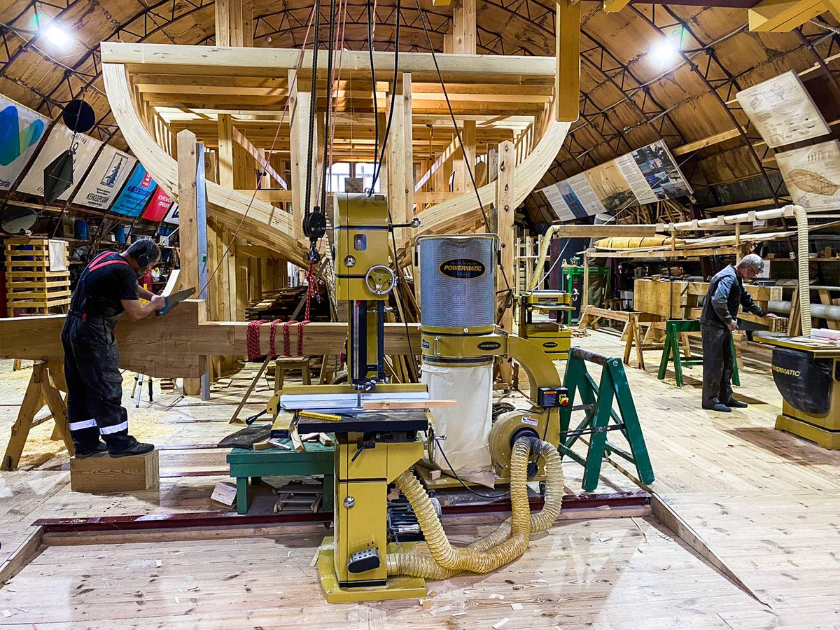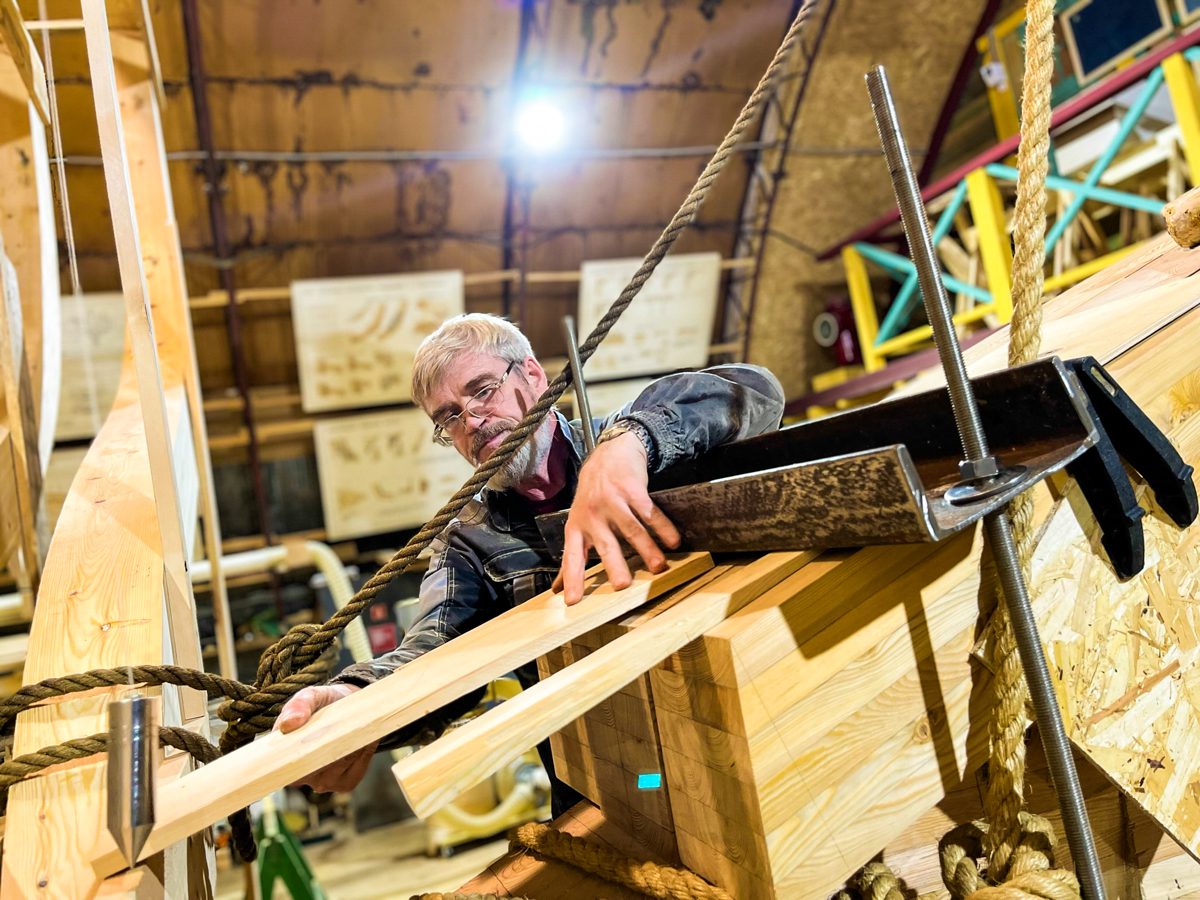 В ангаре все заняты тем же, чем и вчера. Пилим, строгаем, клеим и строим. Артем и Игорь готовятся соединить старнпост и горнтимберс.
