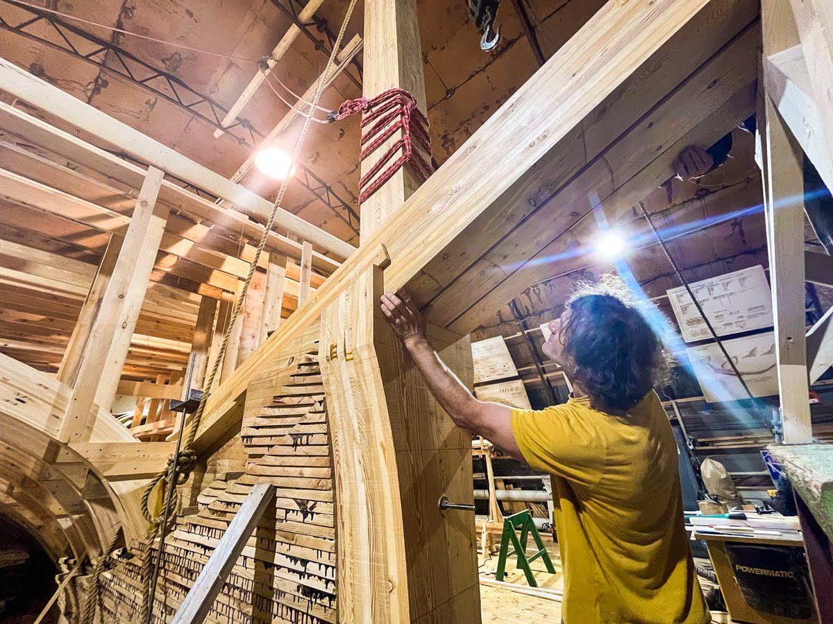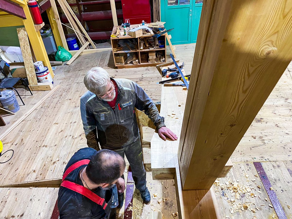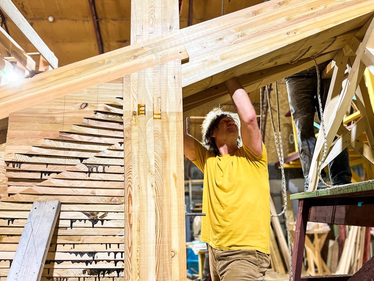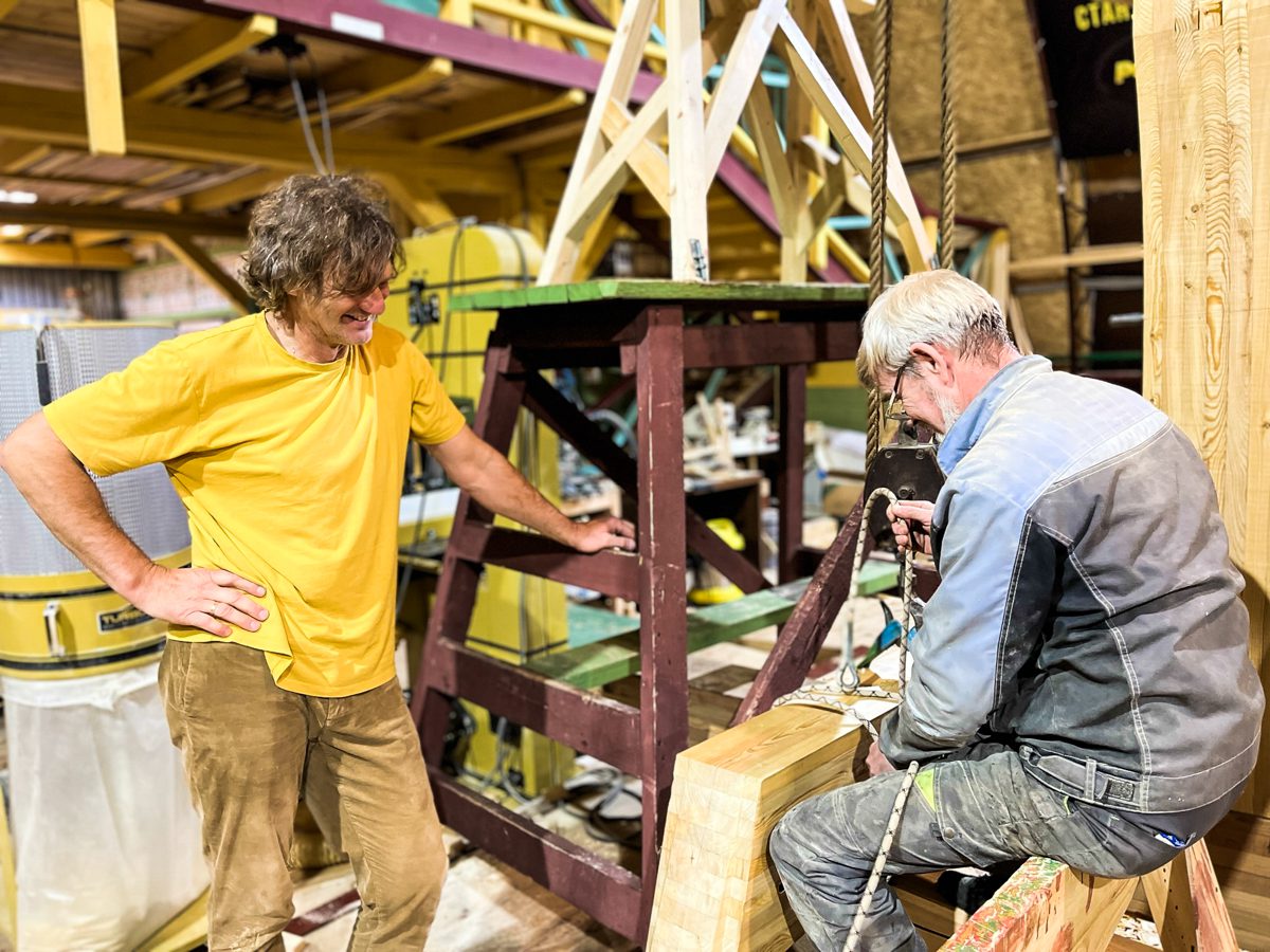 В ангаре все заняты тем же, чем и вчера. Пилим, строгаем, клеим и строим. Артем и Игорь готовятся соединить старнпост и горнтимберс.