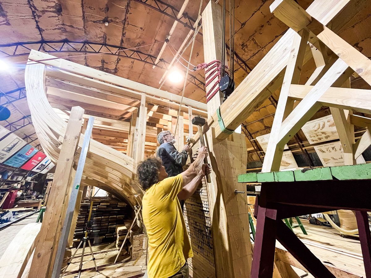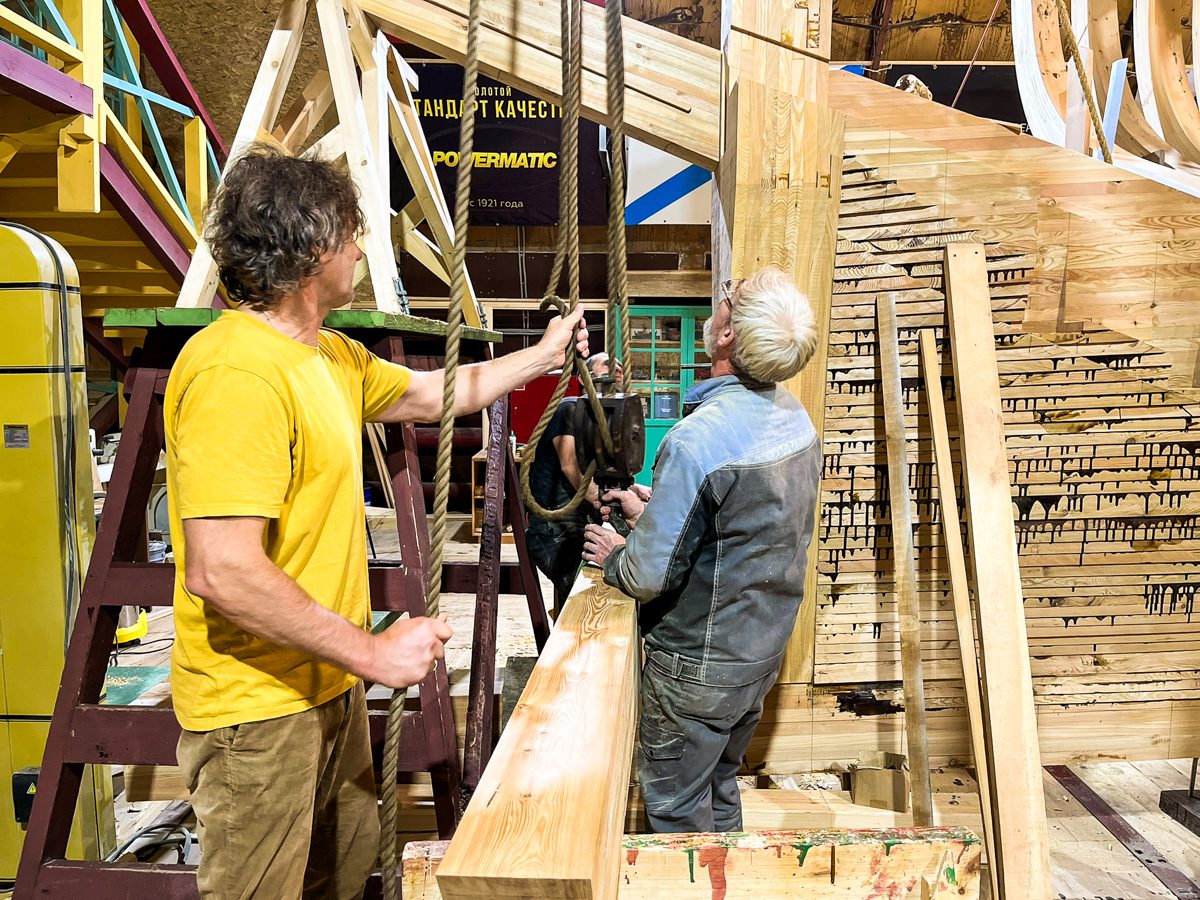 Женя, Игорь, Артем и Александр поставили старнпост и горнтимберс. Чуть не убились (сначала Женя, а потом Игорь), но все обошлось. Стоит заметить, что падая и роняя стокилограммовые детали, наши судостроители не проронили ни одного нецензурного слова – потому что рядом была Катя. Такие вот достойные джентльмены у нас работают.