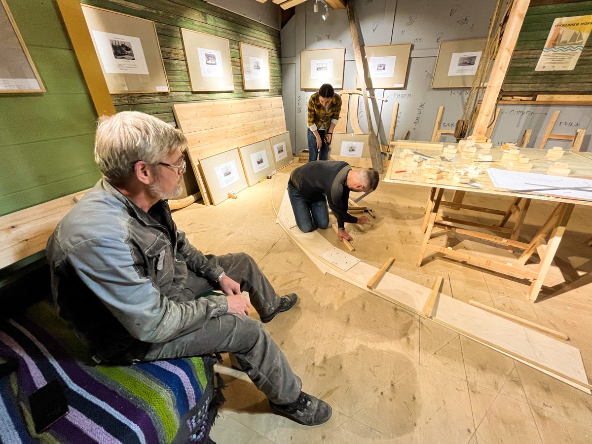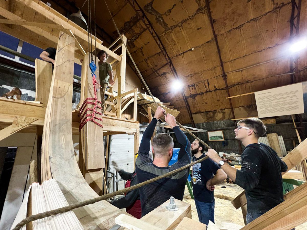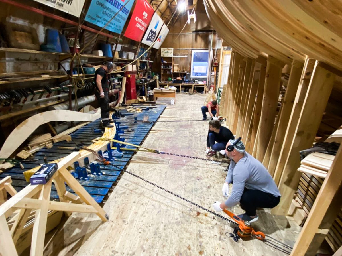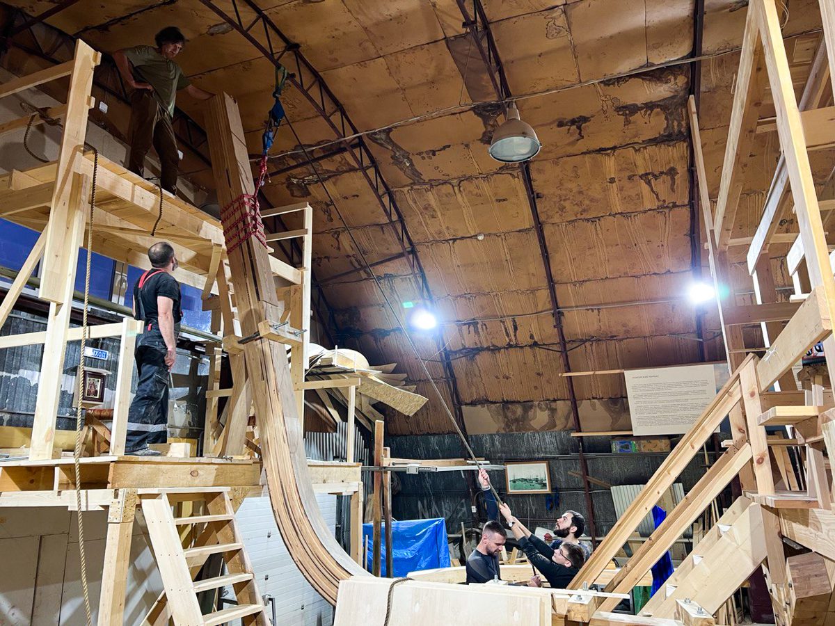 Артем начал возводить леса перед форштевнем шхуны. Игорь продолжает строить корму с другого конца. По бокам ученики школы судостроения клеят пятый шпангоут, а мы уже думаем о пятом. Школа судостроения набирает обороты, и мы наступаем по всем направлениям!